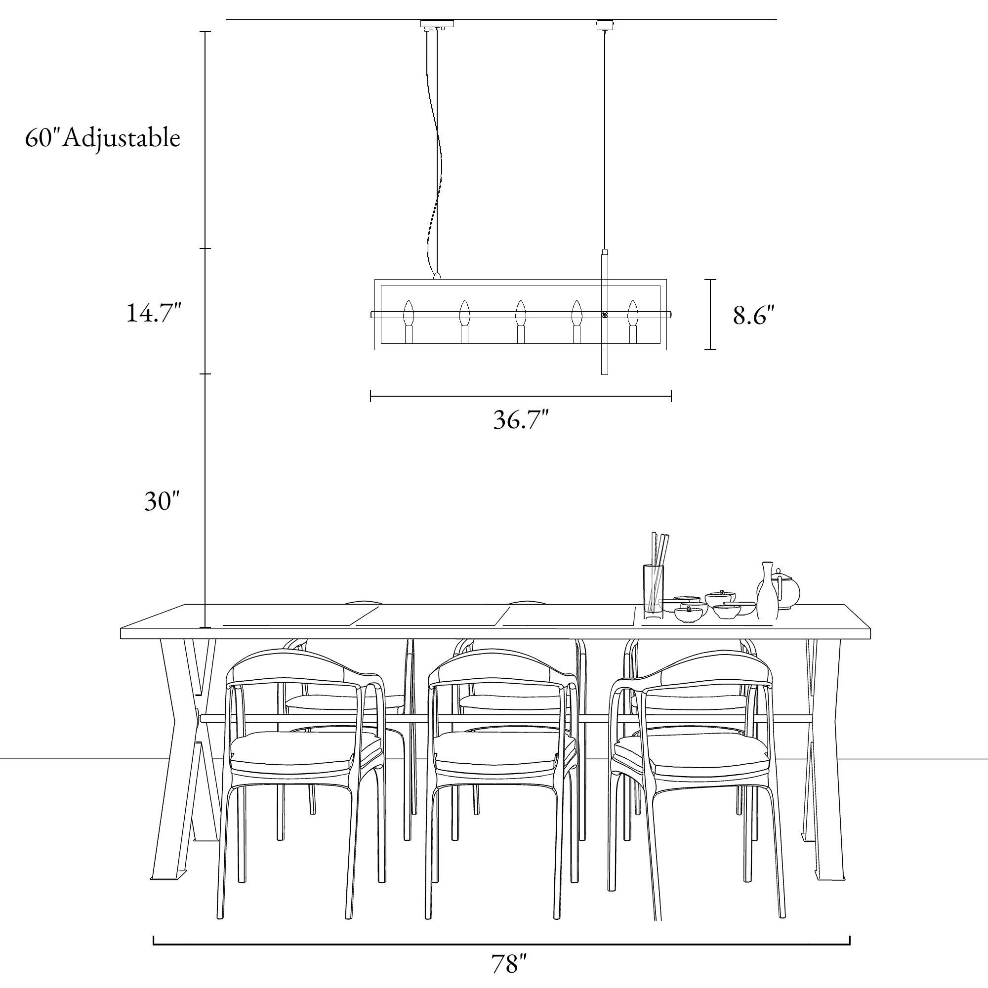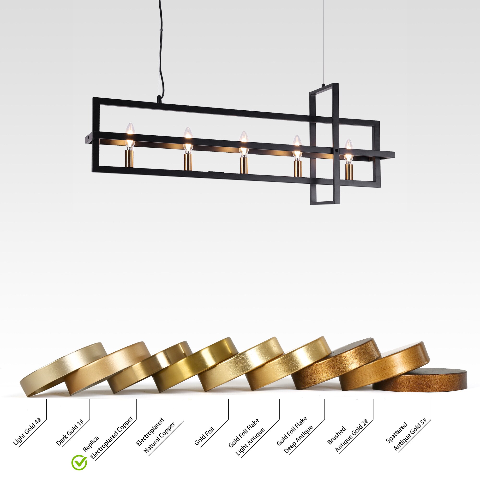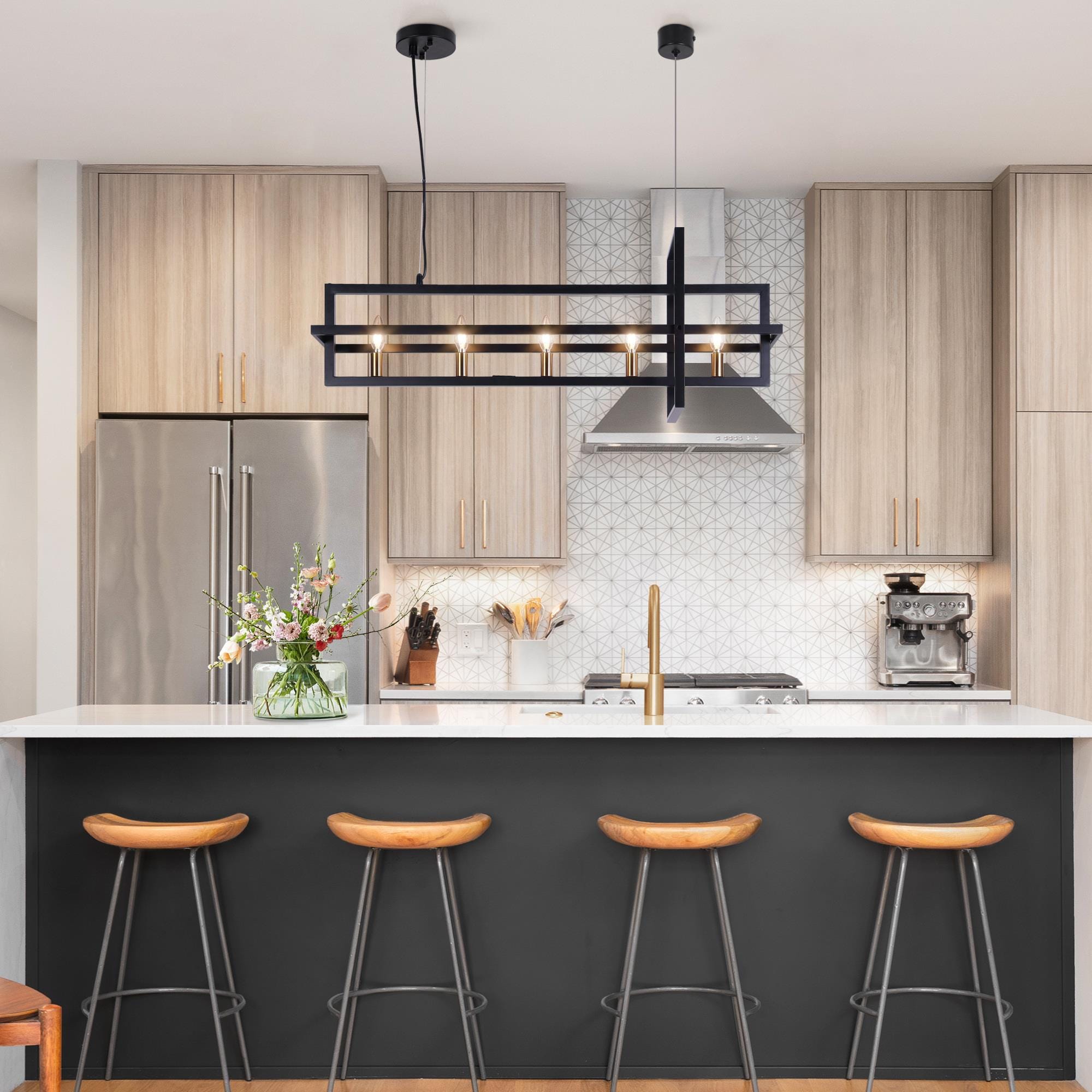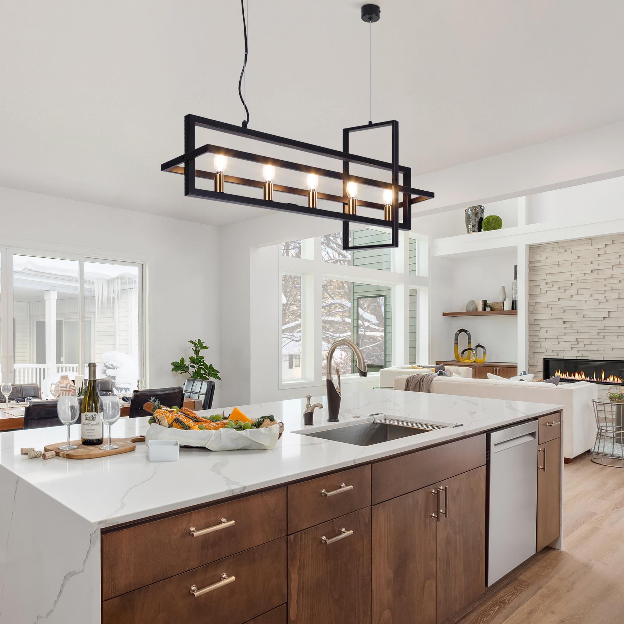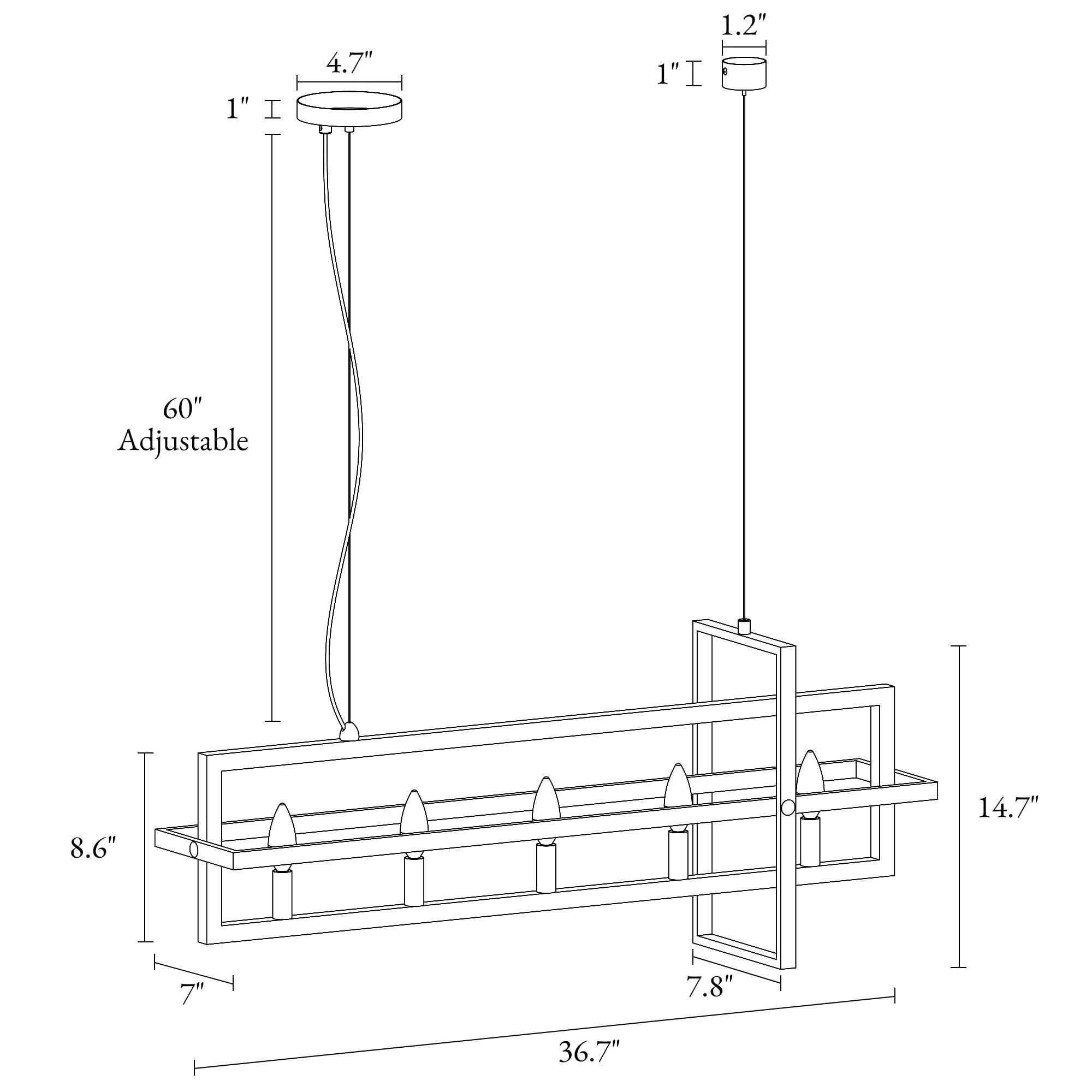This hanging light seamlessly harmonizes playful sophistication and artistic elegance within your space. Crafted with meticulous precision, it showcases interlocking rectangles meticulously shaped from wrought-iron bands, resulting in a brilliantly designed light fixture. Equipped with five lights and a frame that skillfully creates a sense of perspective, this chandelier features a stylish black and gold finish that perfectly complements its design. The adjustable wires offer versatility, allowing you to tailor the height to your liking by manipulating the ring’s suspension with cable locking pins, ensuring a flawless match with your ceiling’s height.