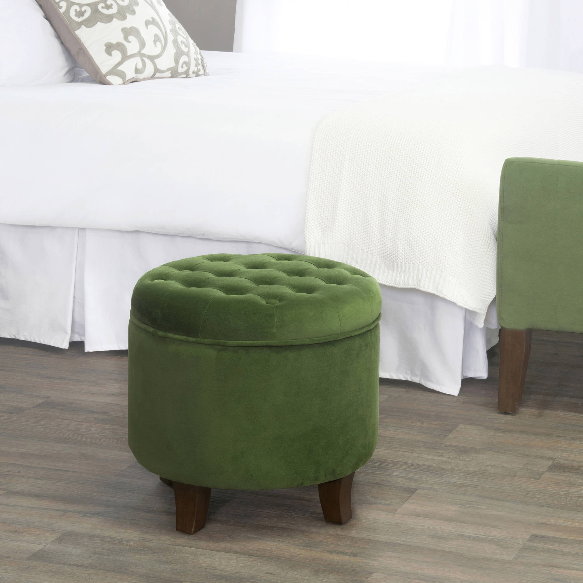 Button Tufted Velvet Upholstered Wooden Ottoman with Hidden Storage Green and Brown- Saltoro Sherpi Incorporate a sense of supremely plush addition to your living room or bedroom with this elegant ottoman. This velvet tufted round ottoman features a lift off lid with all over button tufting style. Upholstered in green color soft velvet this elegant round ottoman has flared wooden feet in a rustic brown finish. Use under storage to hide accessories in a bedroom to store books or magazines in a living room or to keep remotes nearby but out of sight. This is ideal to be used for seating purposes serving stool or to rest feet when tired. Warning This product can expose you to chemicals as it contains Formaldehyde which is known to the state of California to cause cancer. For more information go to Specifications: It consists of one storage ottoman only Features button tufted top easy lift top storage along with sturdy flared feet. Made up of wooden frame over which green color velvet fabric is draped. Overall Dimensions: 19 inches in Length x 19 Inches in Width x 18 inches in Height Useful yet comfortable addition to your decor