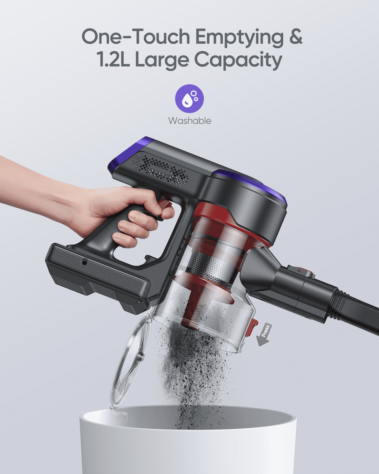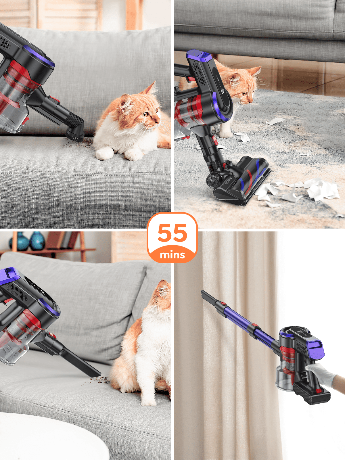 Smart Touchscreen and Blockage Reminder:The LED display provides real-time updates on remaining power, suction strength, and blockage alerts. Suction can be adjusted easily by sliding the touchscreen. When a blockage occurs, a white light will appear on the display, and the vacuum will automatically shut off, signaling that cleaning is needed to restore top performance. 38KPA and 450W Powerful Suction:Equipped with a durable 450W brushless motor, this cordless vacuum delivers strong suction power up to 38KPA, effectively capturing fine dust and dirt. Brushless motors last five times longer than traditional brushed motors, providing a quieter, more efficient cleaning experience. 55-Minute Runtime with Detachable Battery:Powered by seven 2500mAh batteries, this vacuum offers 40-50 minutes of runtime on low suction. The battery can be removed and replaced with a single button, and it recharges fully in just 4 hours. 5-Stage Filtration System and 1.2L Large Capacity:Featuring an advanced 5-stage filtration system with an extra air filter, this vacuum effectively traps dust and releases purified air. The 1.2L dust container holds more debris for convenient, uninterrupted cleaning. Portable and Versatile Design:This cordless stick vacuum includes a combined soft and hard bristle brush to reduce frequent roller changes. The crevice tool, round brush, and telescopic tube make it easy to clean pet hair and dust from various surfaces—ceilings, sofas, carpets, hardwood floors, and tight corners. Included Components: 3 HEPA filters Brushless motor 7 x 2500mAh battery Electric floor brush Roller brush Dust container Telescopic tube Round brush Crevice nozzle Brush cleaning tool Charger Wall mount Instruction manual This powerful 450W cordless vacuum with a brushless motor offers three speeds to tackle pet hair and debris on hardwood floors and carpets. The removable battery is easy to charge and swap out for extended cleaning.