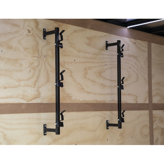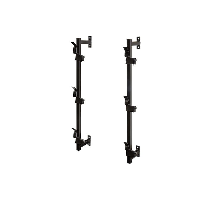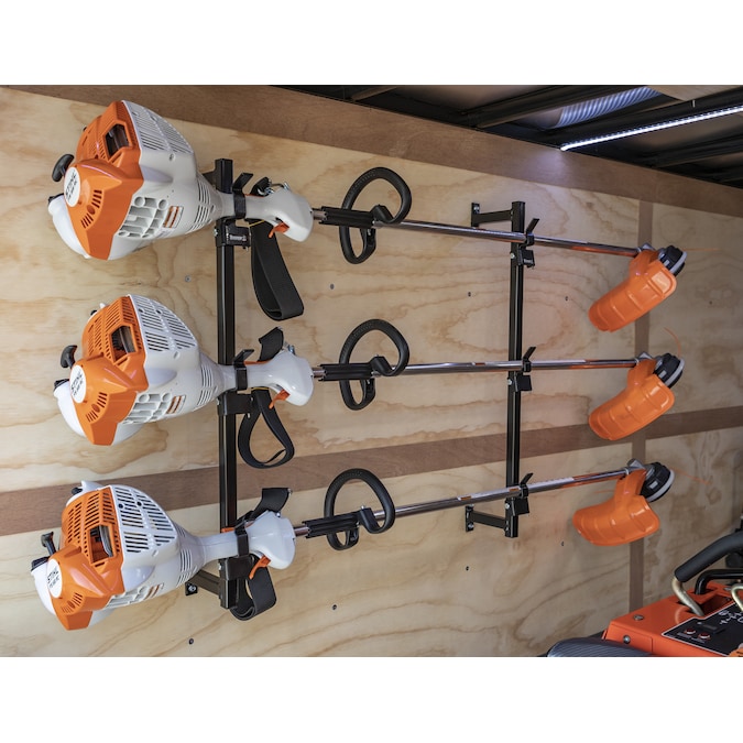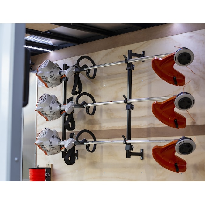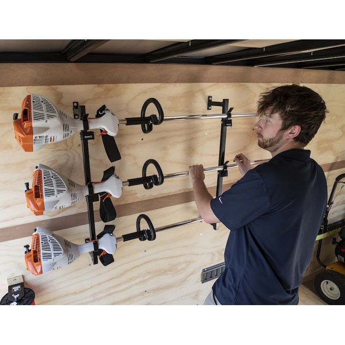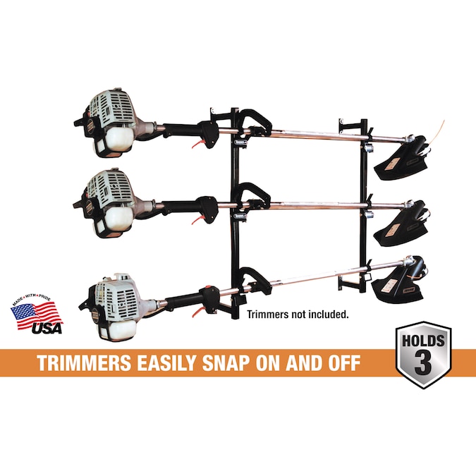 Buyers Products Trimmer Rack mounts to any enclosed trailer and holds up to three trimmers, keeping your trailer organized and clutter-free. Rack mounts to the inside walls of trailers, sheds, and garages, ensuring your trailer bed stays clear and your trimmers are easy to reach. The design holds trimmers away from the wall so there is no rubbing or banging while on the road. Trimmers easily snap on and off the rack. The rack is constructed from sturdy steel and finished with a rust-inhibiting black powder coat. Mounting hardware is included.