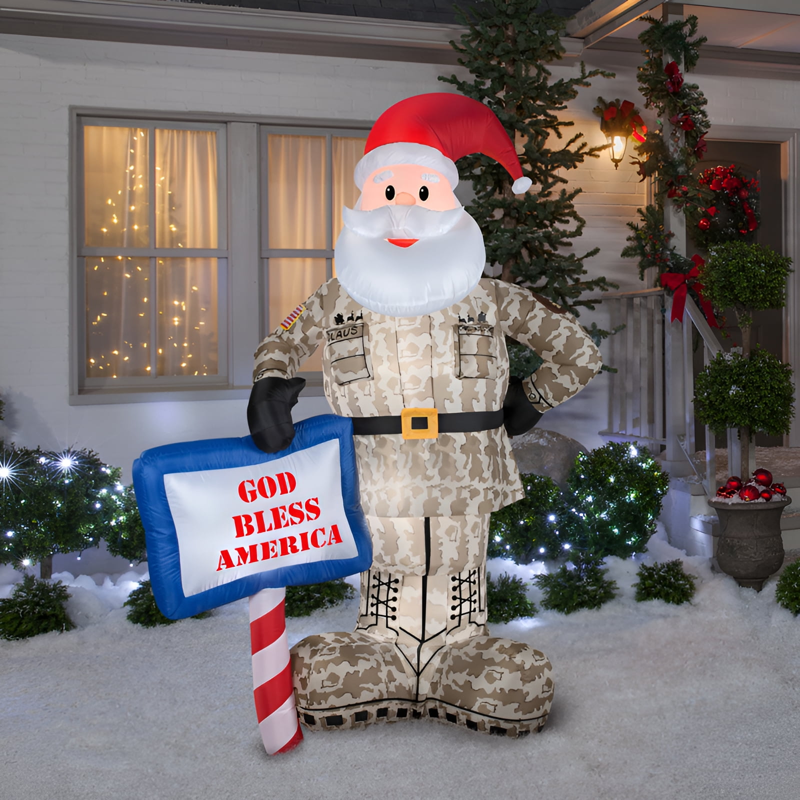 Brown and red military Santa Christmas yard decor Comes with 4 tethers; 4 tether stakes; 4 base stakes Recommended for outdoor use; spot clean 83.86 inches high by 57.09 inches wide by 30.31 inches deep