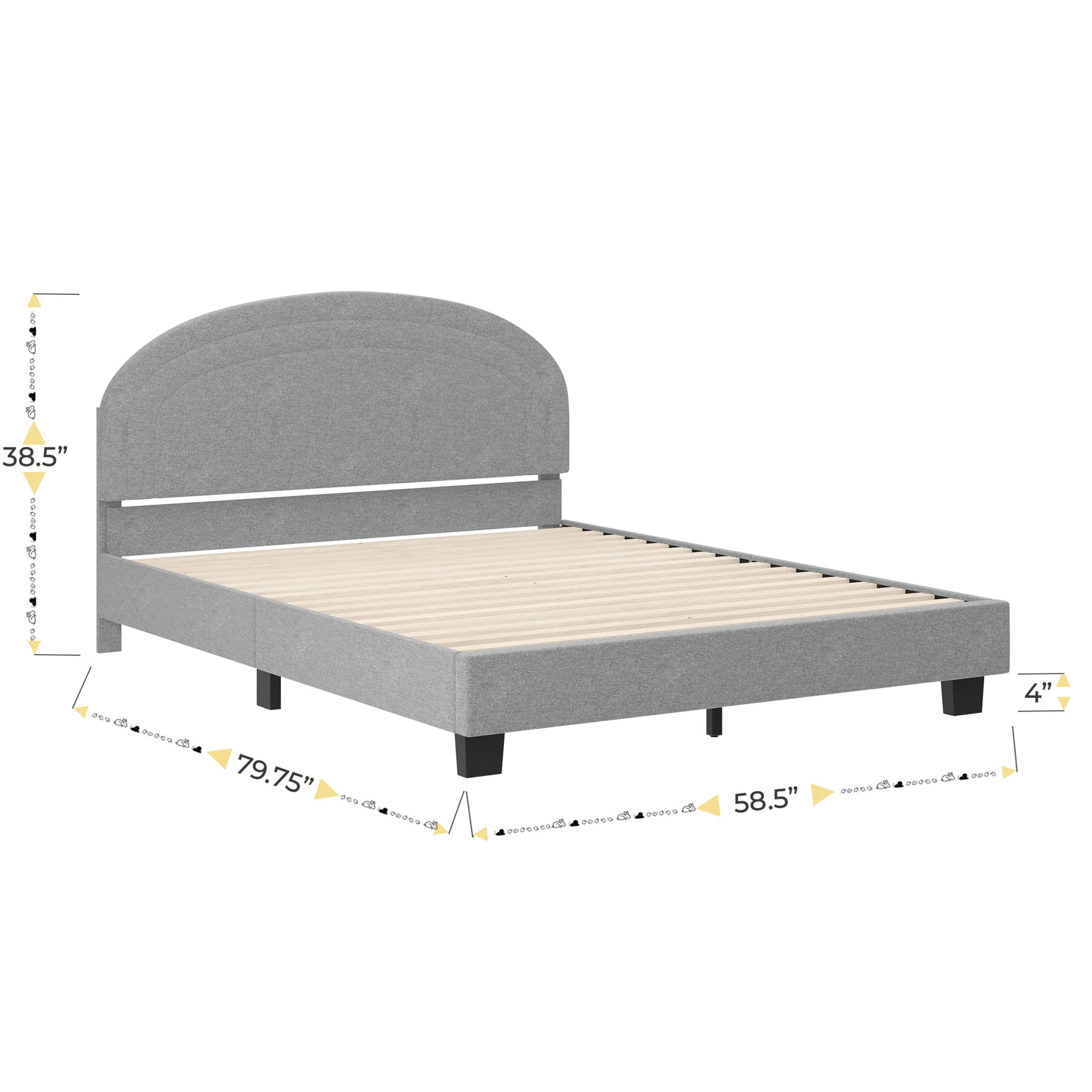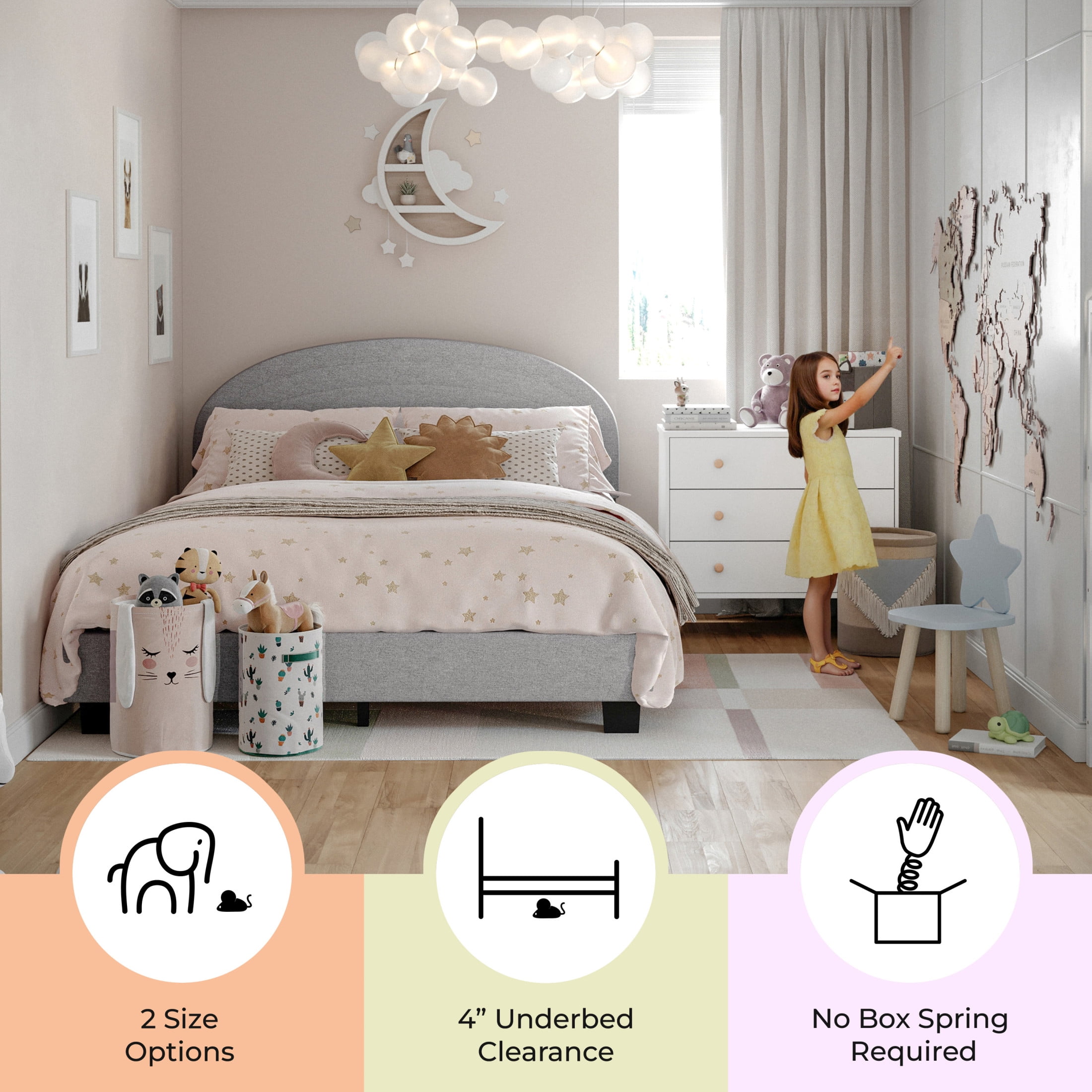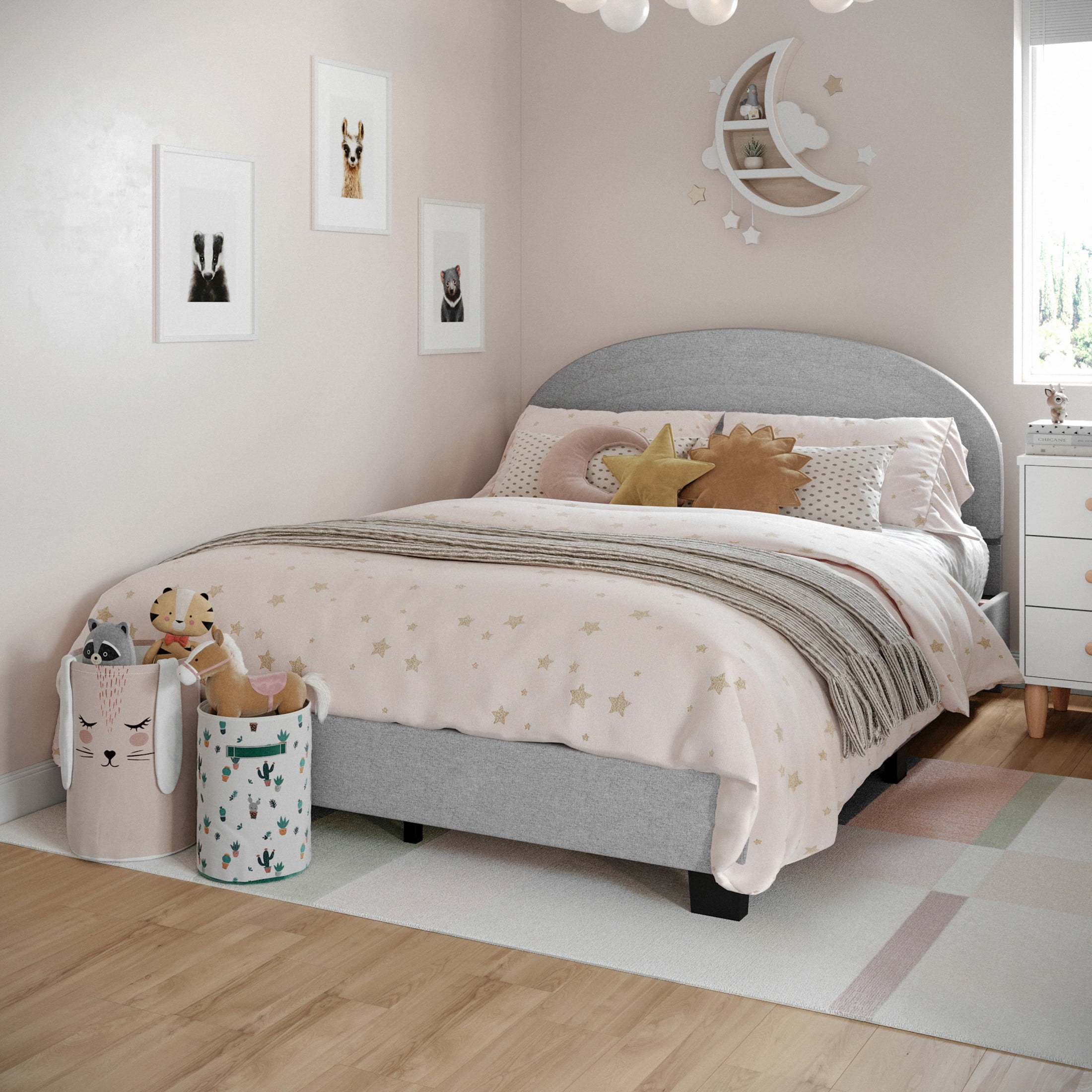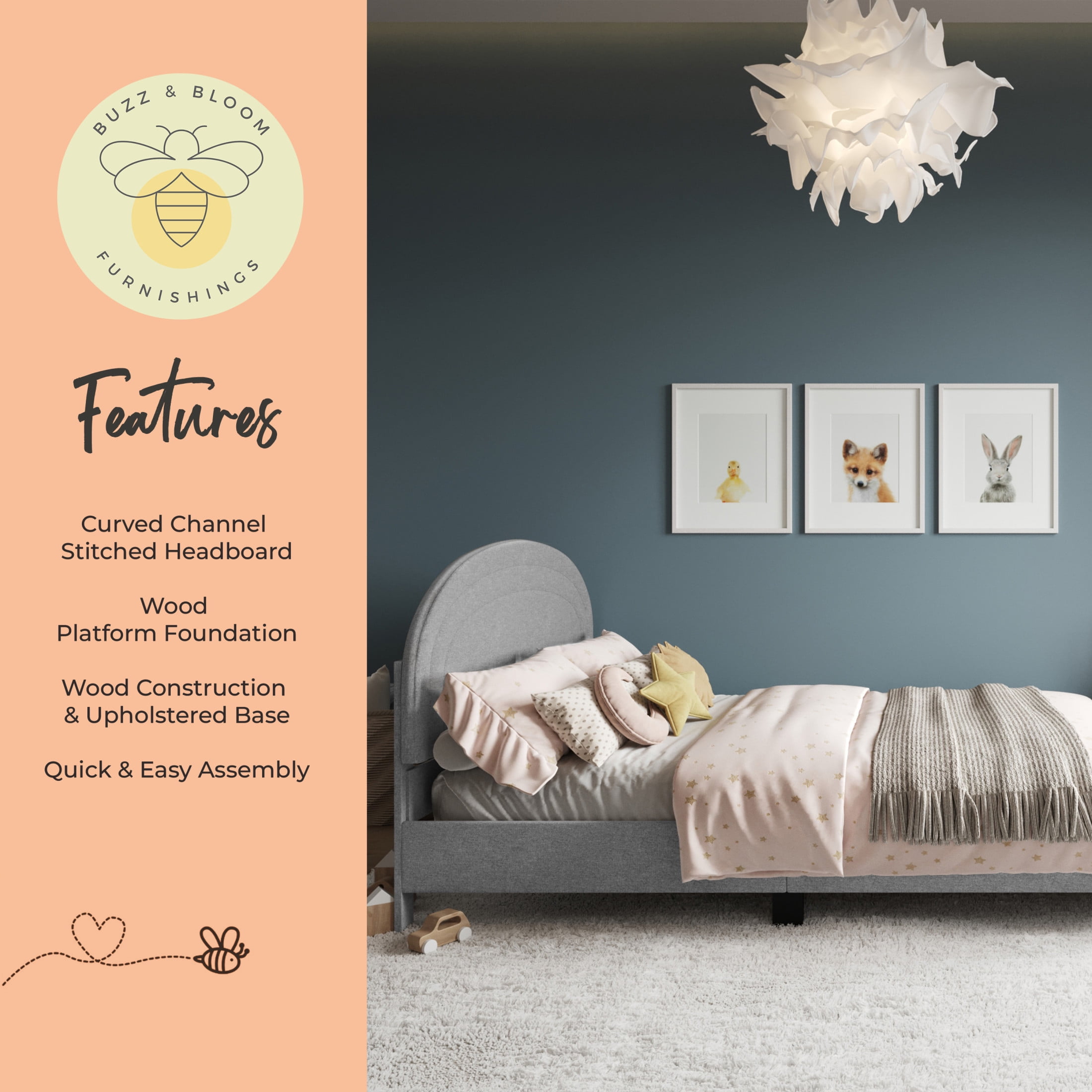 Buzz & Bloom Kids Full-Size Platform Bed with Curved Channel Stitched Headboard, Gray Boasts a gently rounded headboard adorned with curved channel stitching details Durable wood slat foundation No box spring needed Features approximately 4″ of underbed clearance for convenient storage space Easy to clean – lightly brush or vacuum All tools and step-by-step instructions are included for a hassle-free assembly Full-size bed: 58.5″W x 79.75″D x 38.5″H