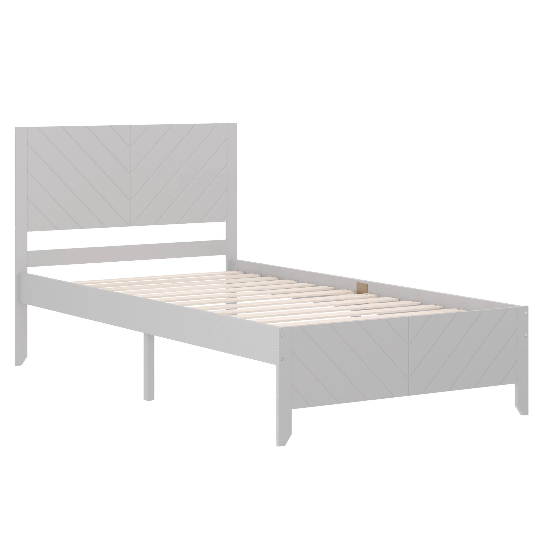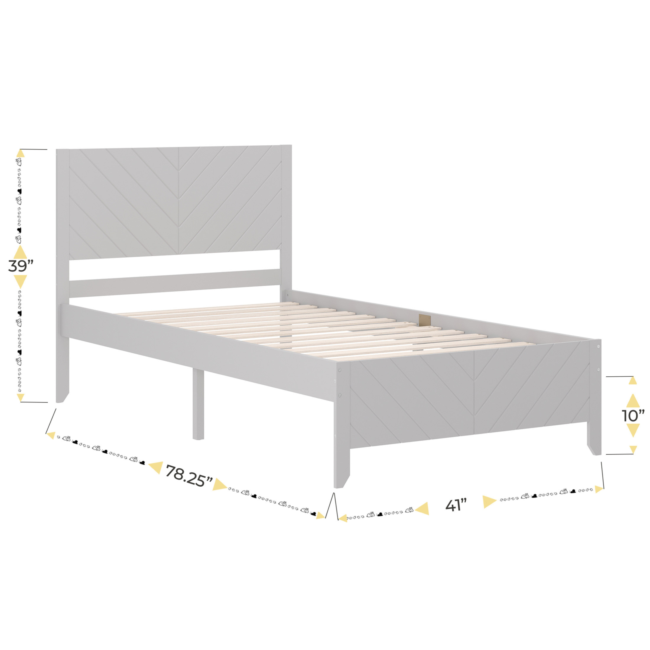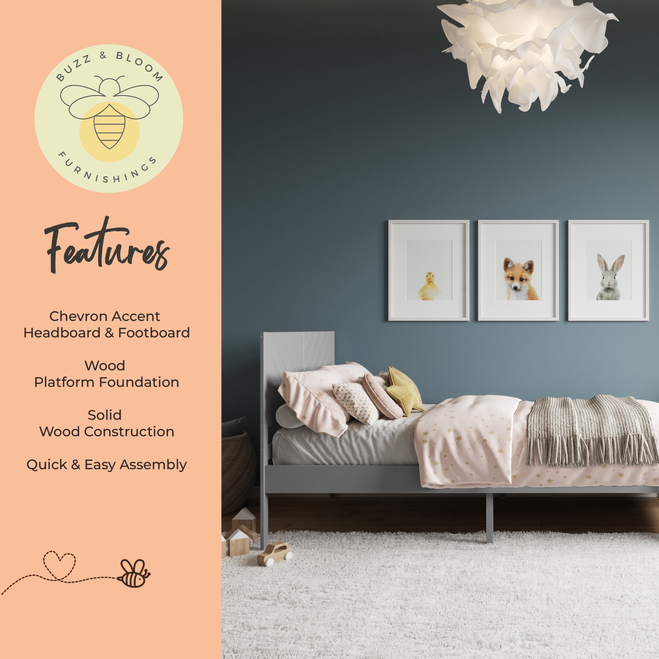 Buzz & Bloom Kids Twin-Size Platform Bed with Panel Headboard and Footboard, Gray Boasts a rectangular headboard adorned with carved chevron detailing Durable wood slat foundation No box spring needed Features approximately 10″ of underbed clearance for convenient storage space Easy to clean – wipe down with a dry cloth All tools and step-by-step instructions are included for a hassle-free assembly Twin-size bed: 41″W x 78.25″D x 39″H