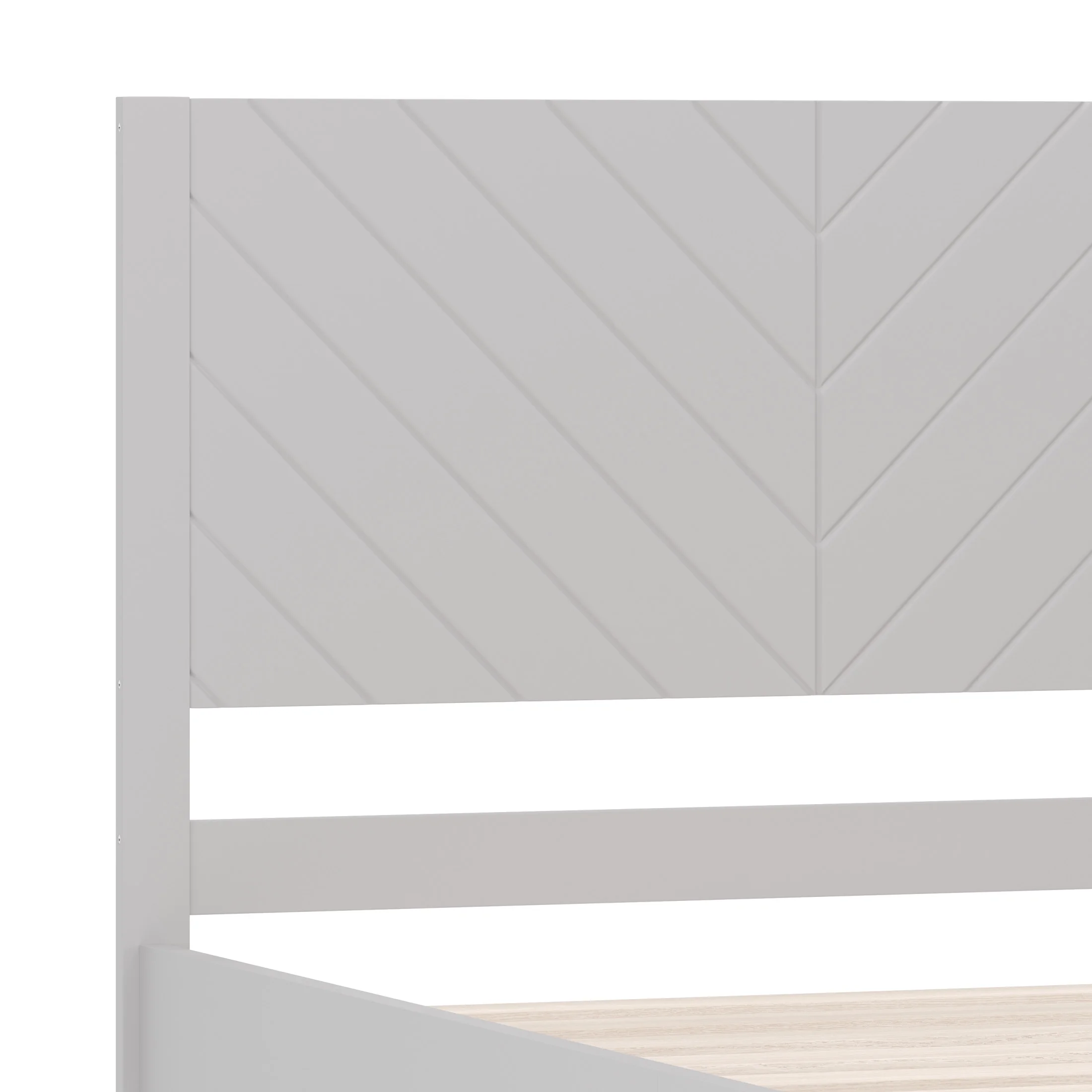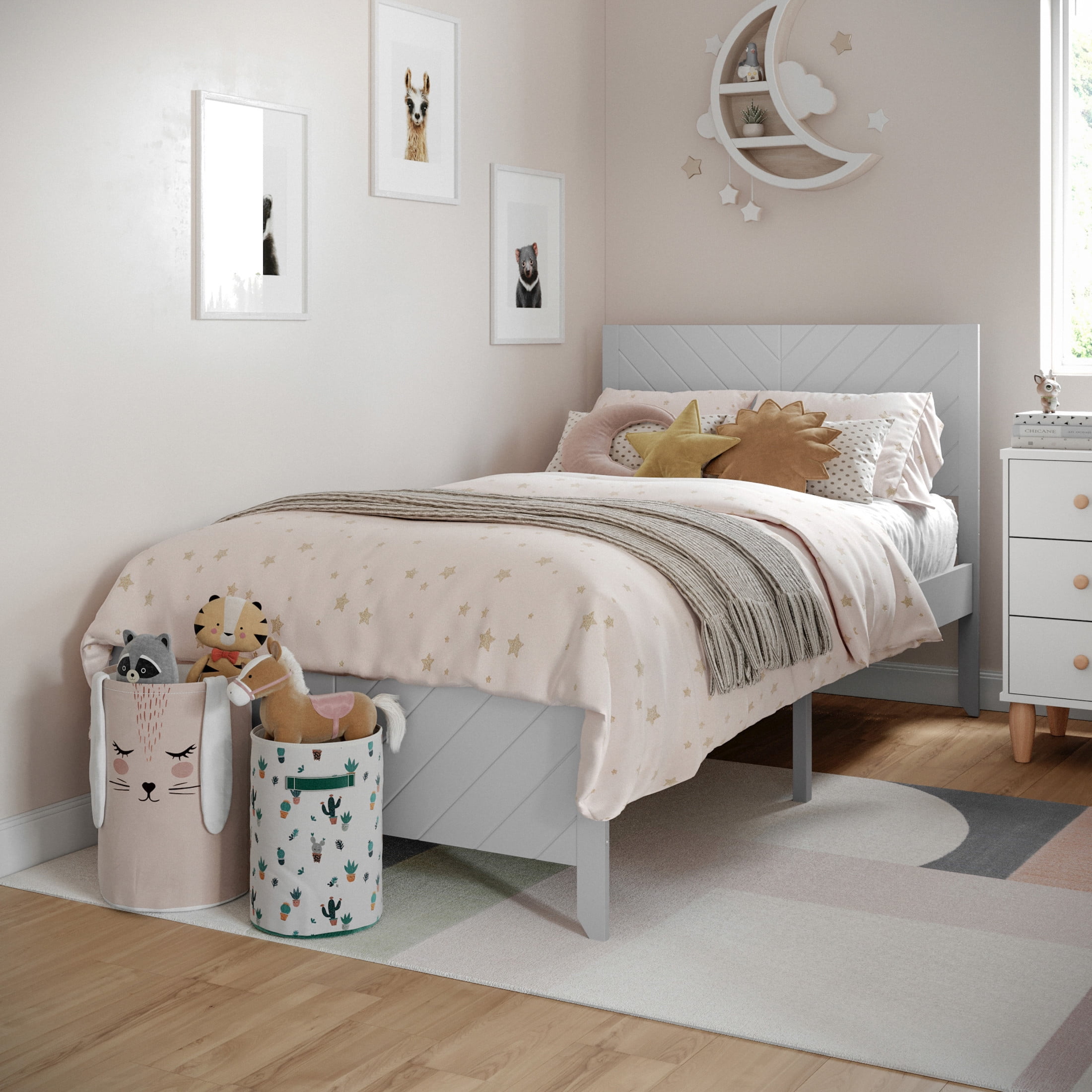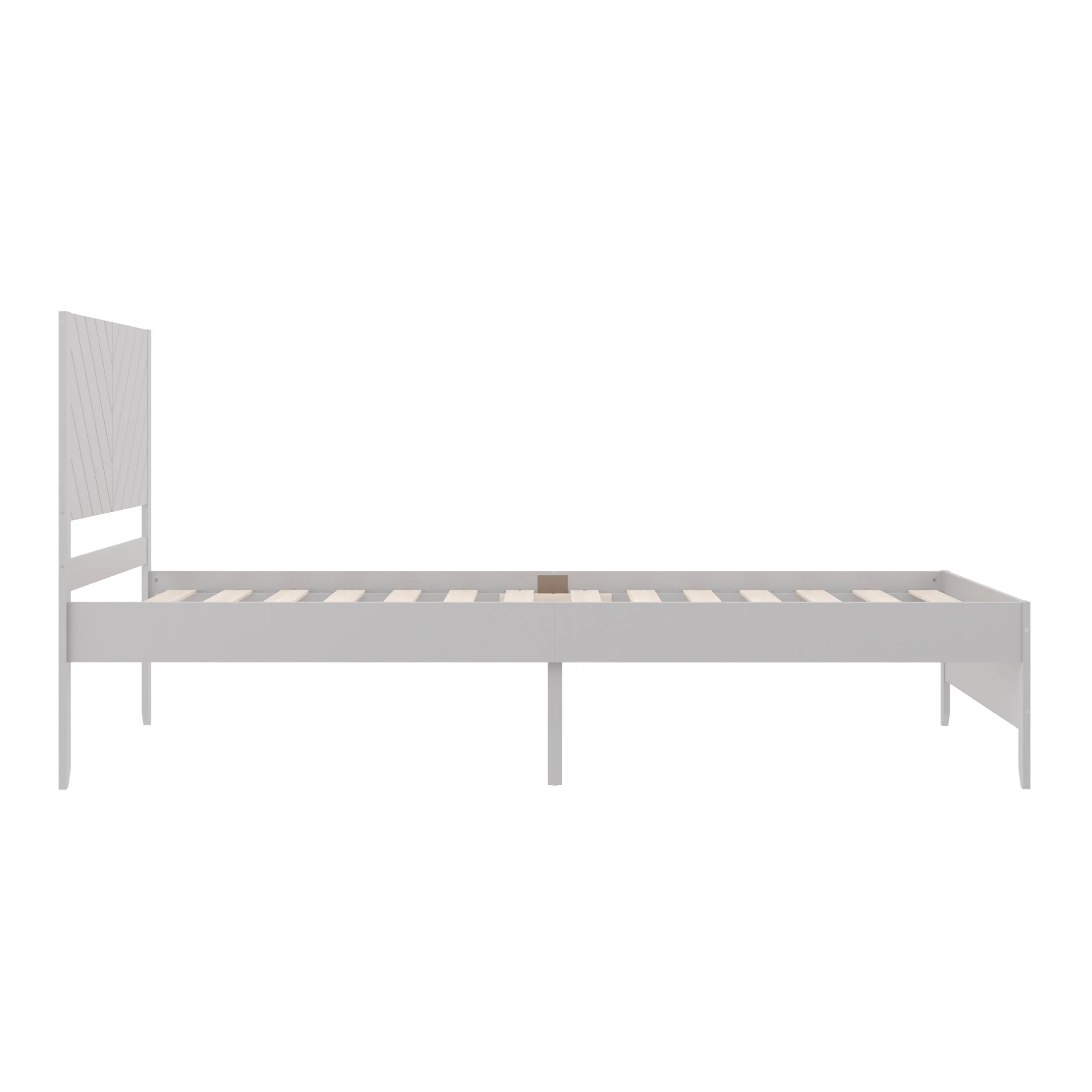 Buzz & Bloom Kids Twin-Size Platform Bed with Panel Headboard and Footboard, Gray Boasts a rectangular headboard adorned with carved chevron detailing Durable wood slat foundation No box spring needed Features approximately 10″ of underbed clearance for convenient storage space Easy to clean – wipe down with a dry cloth All tools and step-by-step instructions are included for a hassle-free assembly Twin-size bed: 41″W x 78.25″D x 39″H