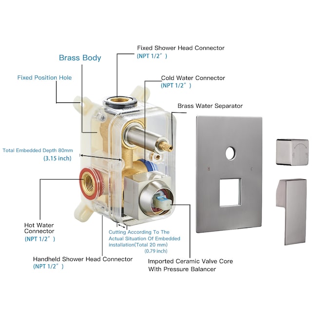 - Brushed nickel appearance – with the polished chrome appearance of European and American style and the multi-layered electroplating passing the salt spray test, it can easily face the surface corrosion by humid environment in the shower room