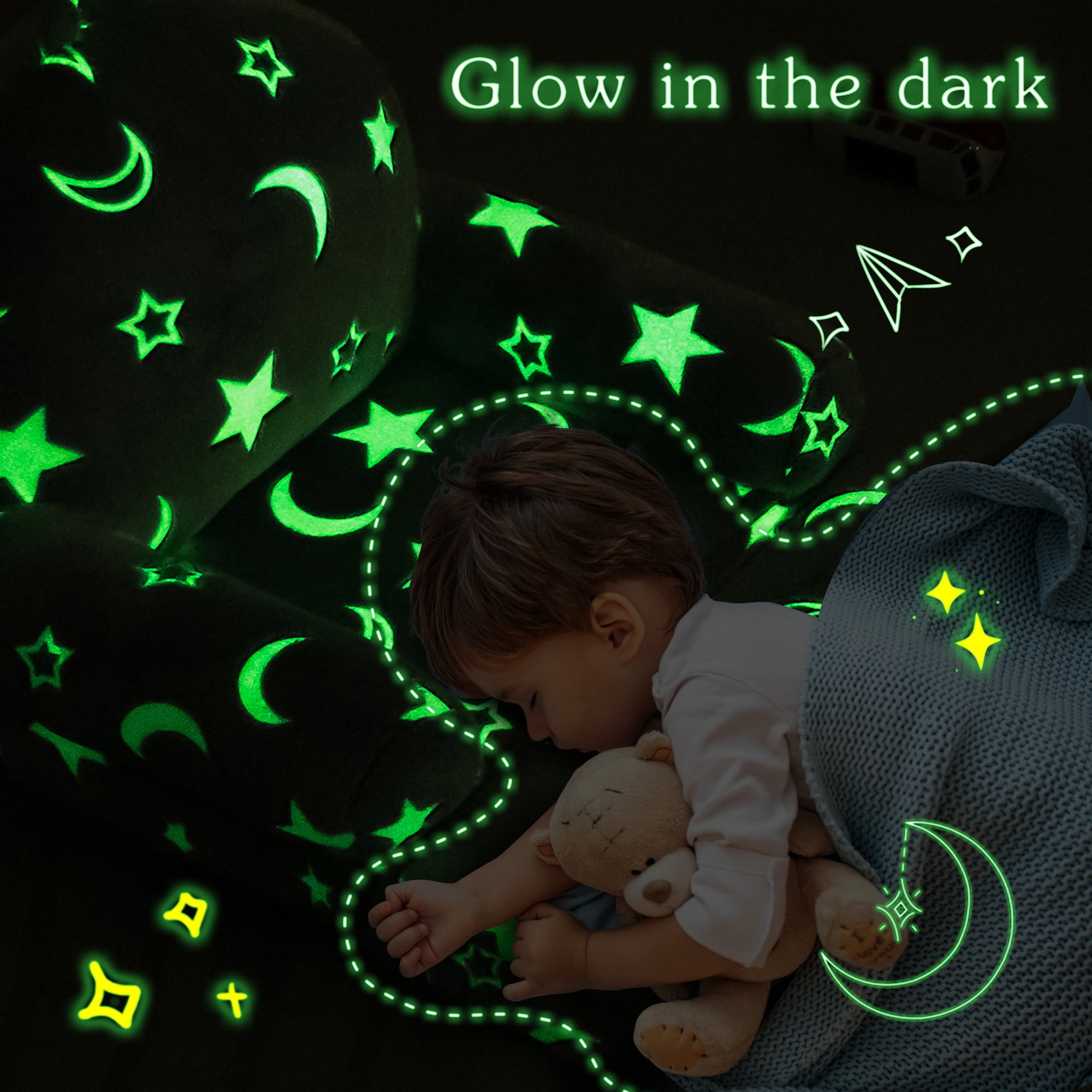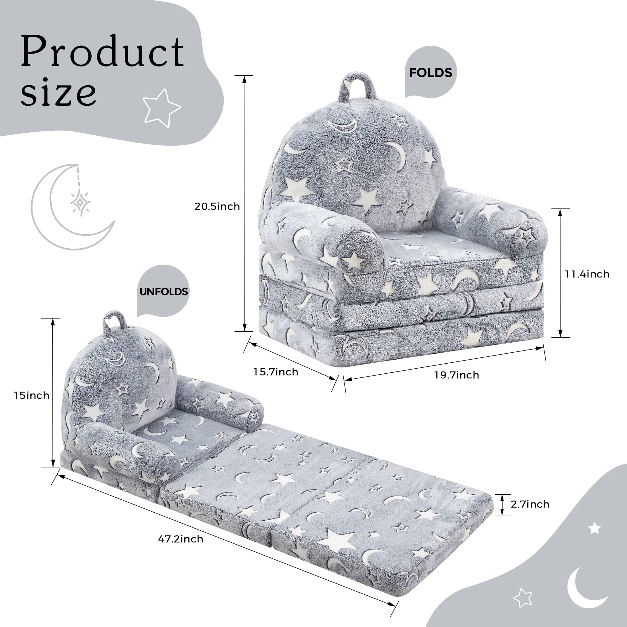 【Glow-In-The-Dark Sofa】Just expose kids couch to a bright light source or sunlight more than 30 minutes.The brighter the light is, the stronger the couch will glow in the dark.The glow light will create a dreamy atmosphere in your room.Full of magic! 【Skin-friendly material】The cushion of the foldable children’s sofa is made of durable and comfortable polypropylene foam, which has a good rebound effect. The sofa cover is made of soft crystal velvet material, which is soft and skin-friendly. Children’s Sofa Beds are wonderful gifts for children at Christmas and birthdays to accompany them through a wonderful childhood. 【2 in 1 Design】: This is a sofa bed that fits a child’s figure. The folding children’s sofa bed is designed so that children can choose to sit or lie down. Your child can play and sleep on the sofa. 【Size】 The sofa size is 19.7″ x 15.7″ x 20.5″ when folds; 47.2″ x 19.7″ x 15″ when unfolds. Lightweight with no solid frame for your tots to carry and safely play wherever they go. Kids can fold and unfold all by themselves. Perfectly sized couch for children, boys and girls. 【Child Safety Zipper】In order to prevent children from opening the sofa by themselves, we use a child safety zipper, no tension, only use a paper clip to open and close the zipper slider. Don’t forget to remove the paper clip when you’re done.Please wait at least 4-6 days for it to return to its normal shape. 【Note】 Packing with compressed package, the sofa will restore to its perfect appearance in a few days after receiving the goods. When disassembling and cleaning the sofa cover, please wash it with warm water to prevent wrinkle deformation. It can be cleaned by hand or machine