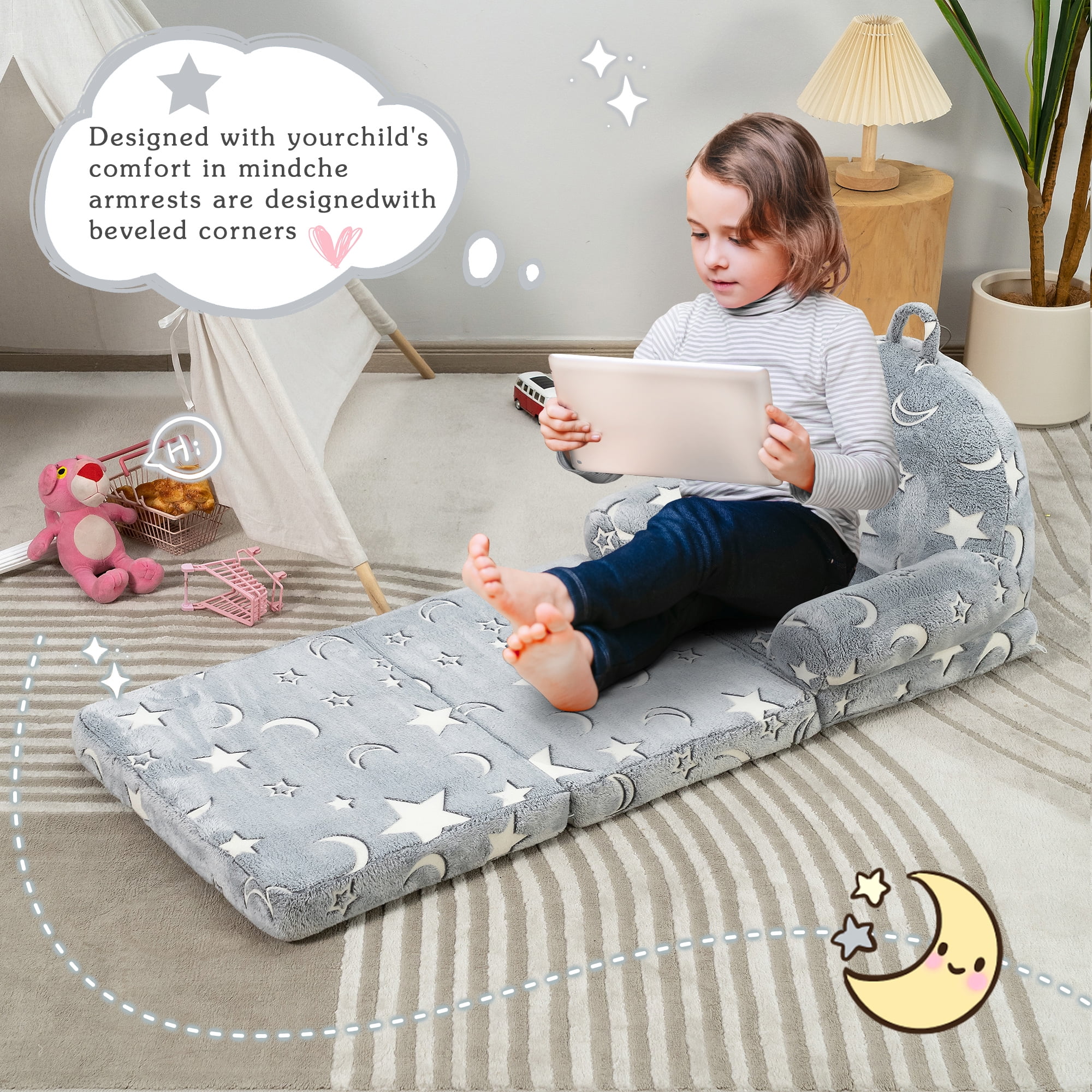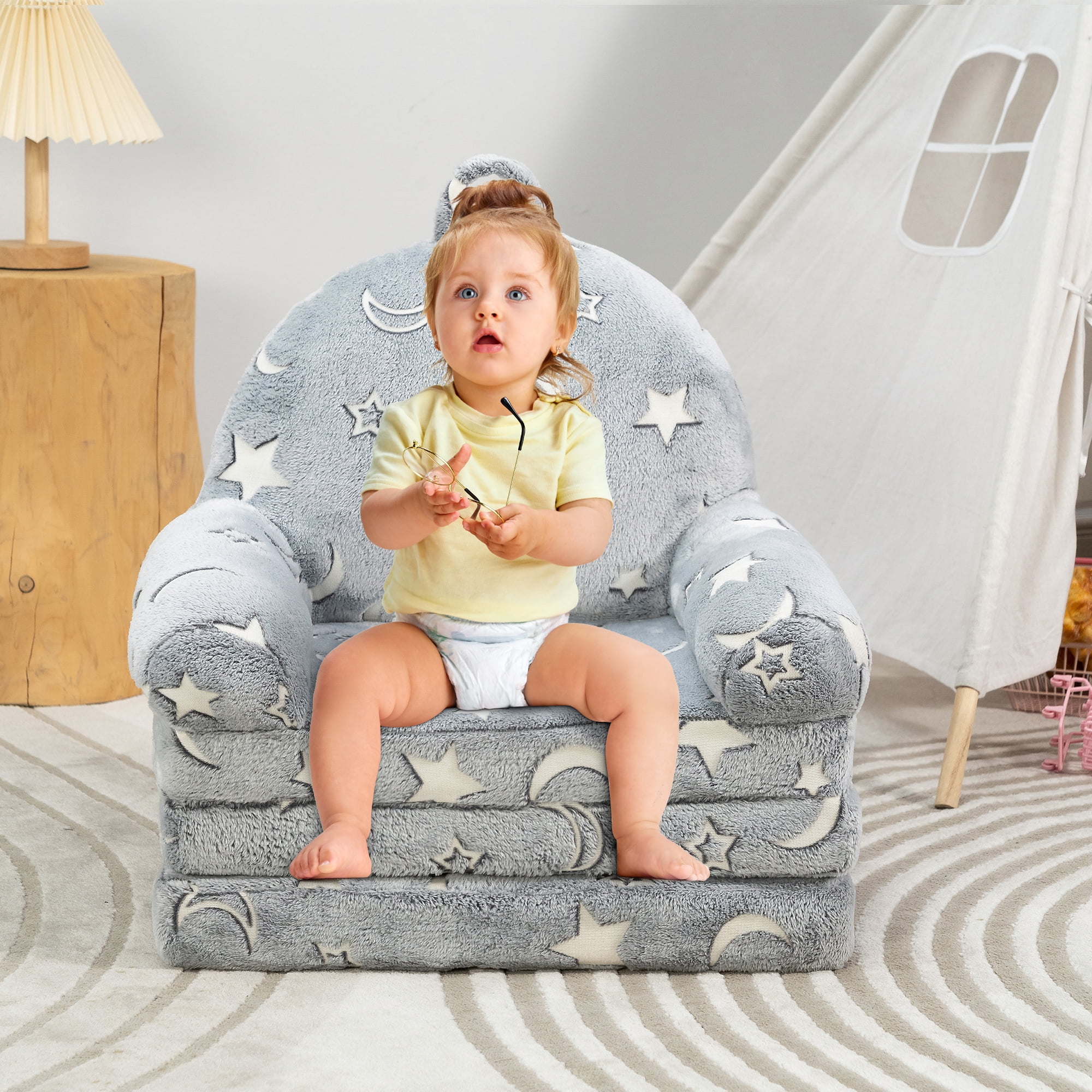 BYBYME Kids Sofa,Glow in The Dark Toddler Chairs Children’s 2 in 1 Convertible Sofa to Lounger with Pockets ,Kid Couch Toddler Chair,star