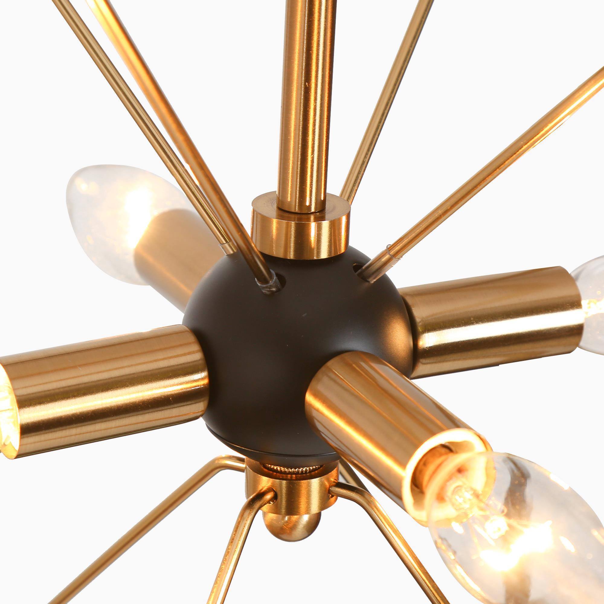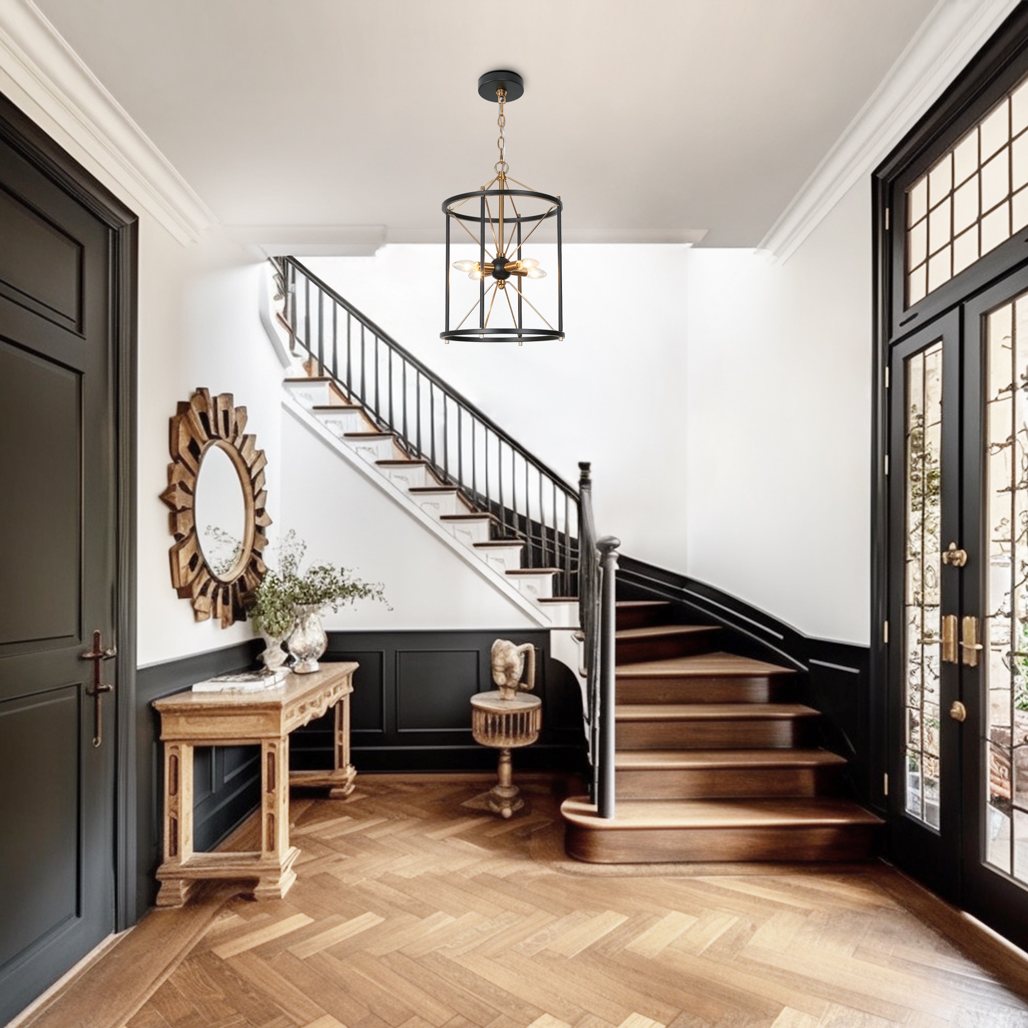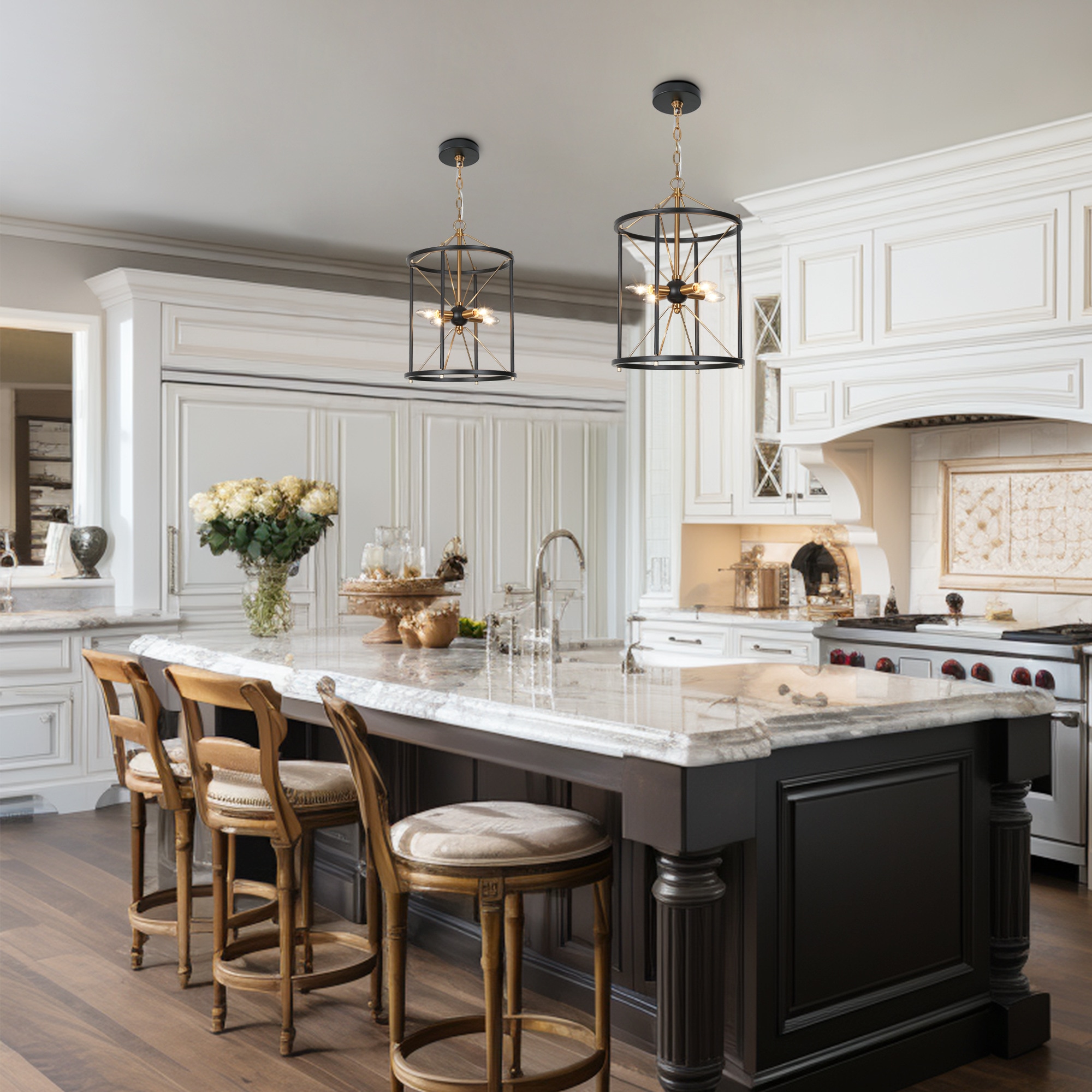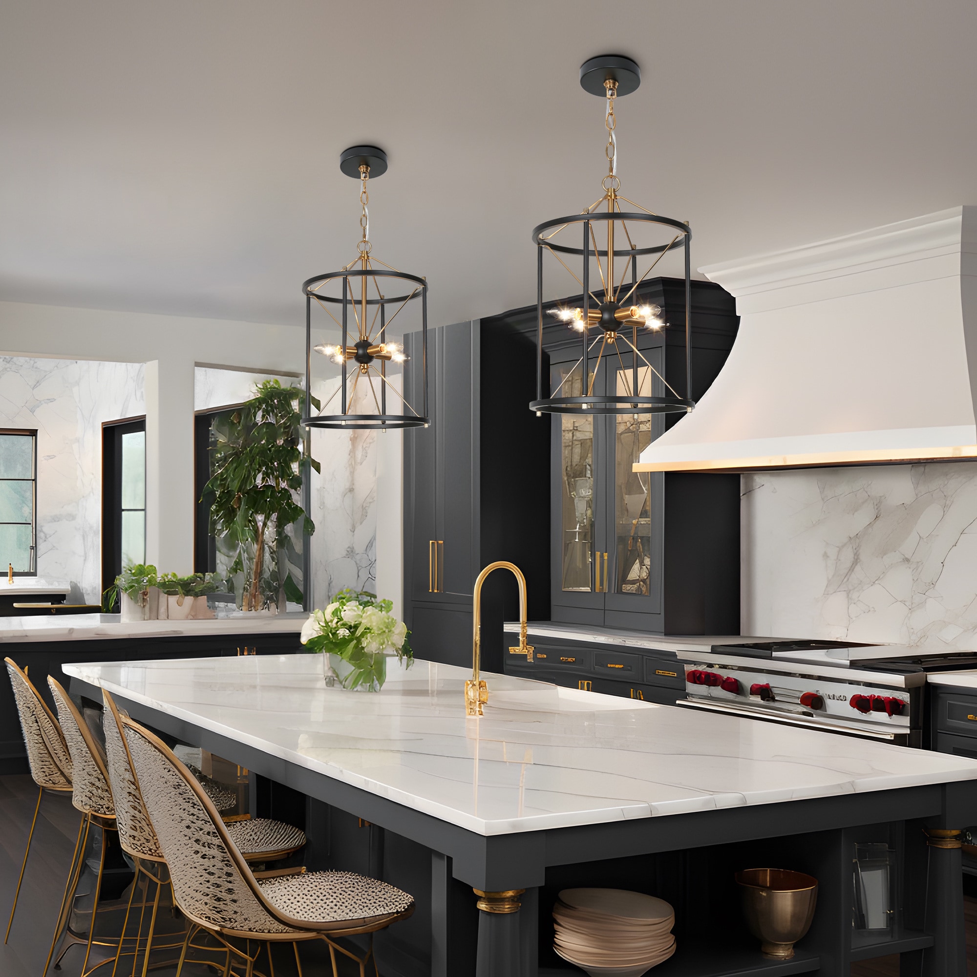The versatility of the black chandelier features metal frame and geometric design. We’ve omitted the glass panes that once shielded the candle’s flame to allow unobstructed illumination. The modern linear chandelier light can be applied to the sloped ceiling for your space needs.