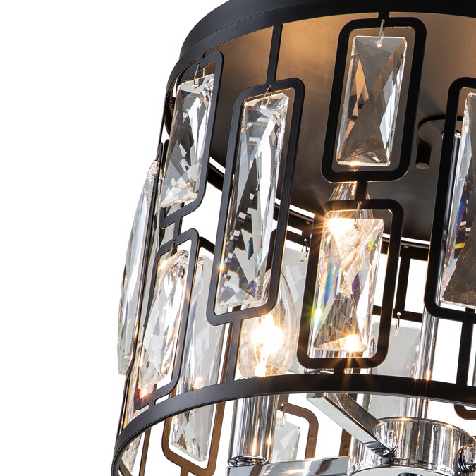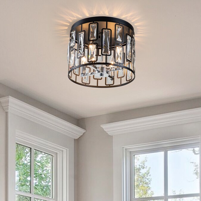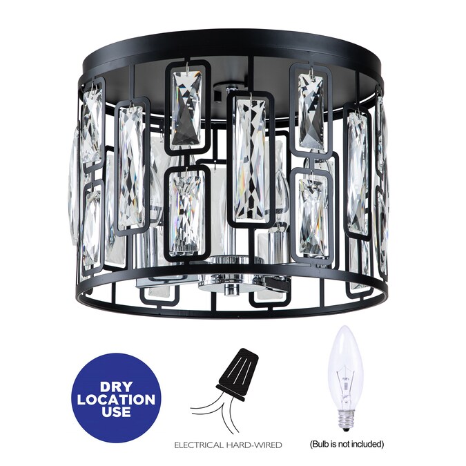 This pretty drum flush mount light features black metal frame inlaid with rectangular faceted crystals. The exaggerated scale and elegant crystal accents are suitable for modern and luxury design styles. Shiny and sparkling clear crystals of this ceiling light could create a superior and classy atmosphere in your home. Three candelabra bulbs sit within the design to provide ample accent lighting. The contemporary inspiration will complement any bedroom, entryway, kitchen, dining room, or hallway.