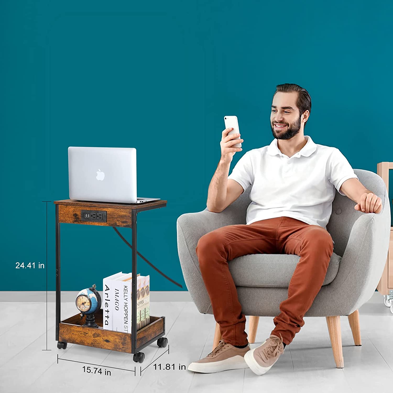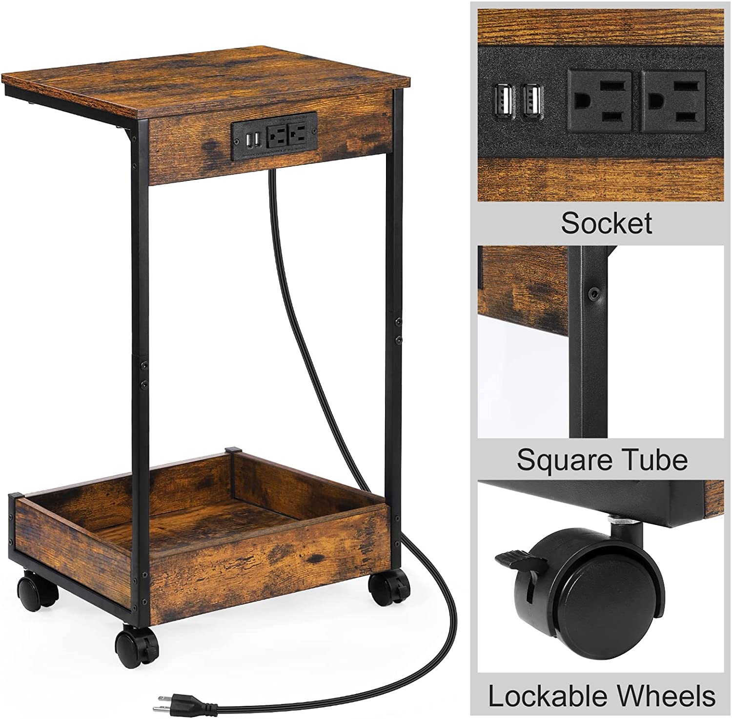 [Charging Station and USB Ports] The charging station includes UL certified socket, two 120V/12A charging ports, two 5V/2A USB charging ports which can easily charge your phone, lamp and even your laptop. The 4.92 ft long power line supply can let you move this end table easily. [Versatile Storage Space] The side table with 1 bottom storage box and 1 top open wooden tabletop shelf offer you ample space to storage. Prop up your drinks and snacks on the tabletop, place your books and miscellaneous on bottom, meet the daily entertainment and relax needs. [Sturdy & Durable] Sturdy metal legs and lockable wheels under the legs ensure stability and effectively protect the floor, the anti-rust square tube frame and robust desktop with simplistic look gives this side table an individual character and remarkable stability, which can be used as sofa table or bedside table. [High-quality Materials] EPA-safe raw materials, the surface of the retro wood veneer is treated with powder coating (baking paint), which can pass the environmental protection test powder, which is non-toxic and harmless, This table with vintage design industrial style, suitable for any decor of your room. Move anytime, anywhere, more convenient in your life. [Fast Setup and Easy to Clean] Comes with numbered parts and just following the clear instruction and using the tools provided assembly complete effortlessly within 20minutes! The tabletop waterproof heat-resistant and dust free you just need a damp cloth to keep the table clean.