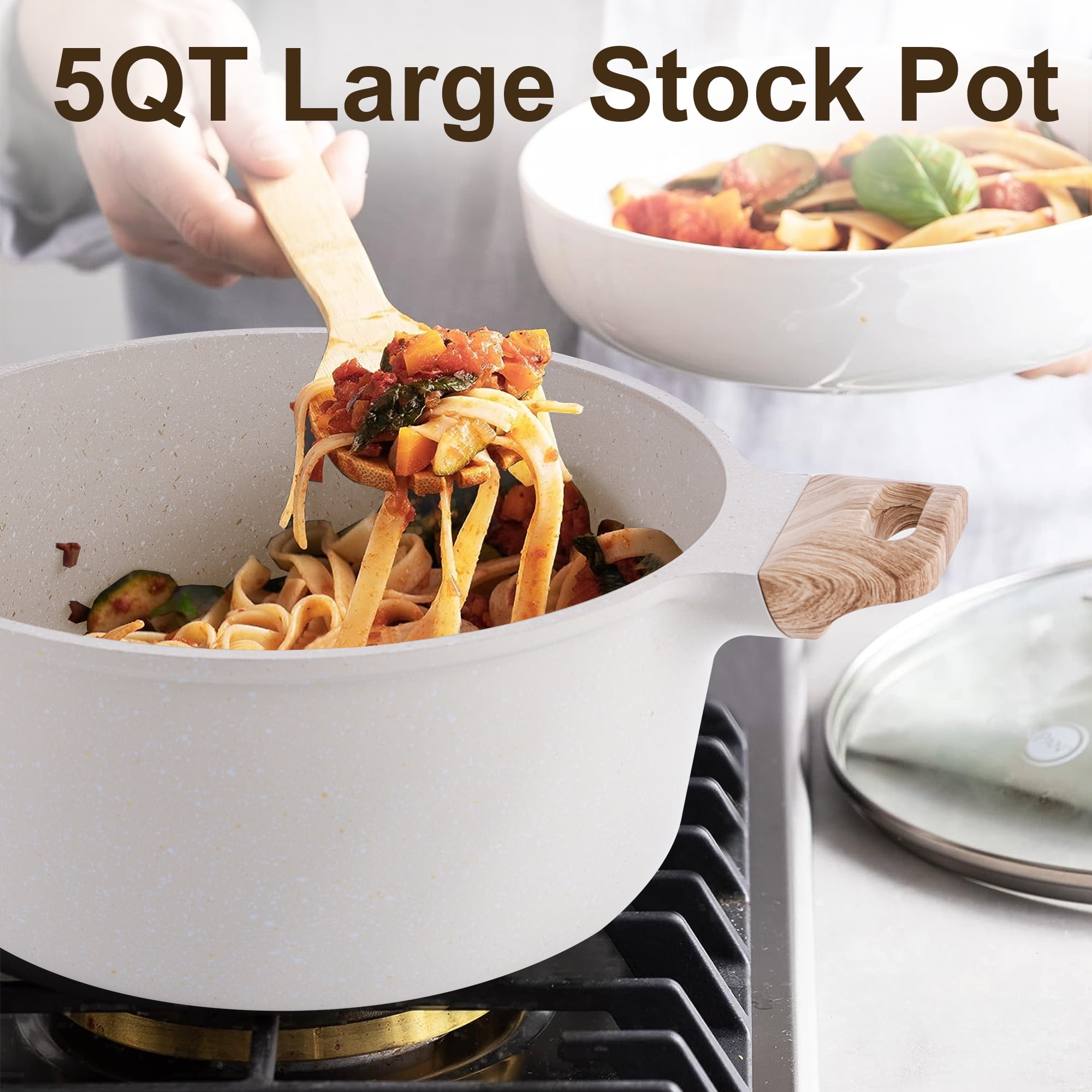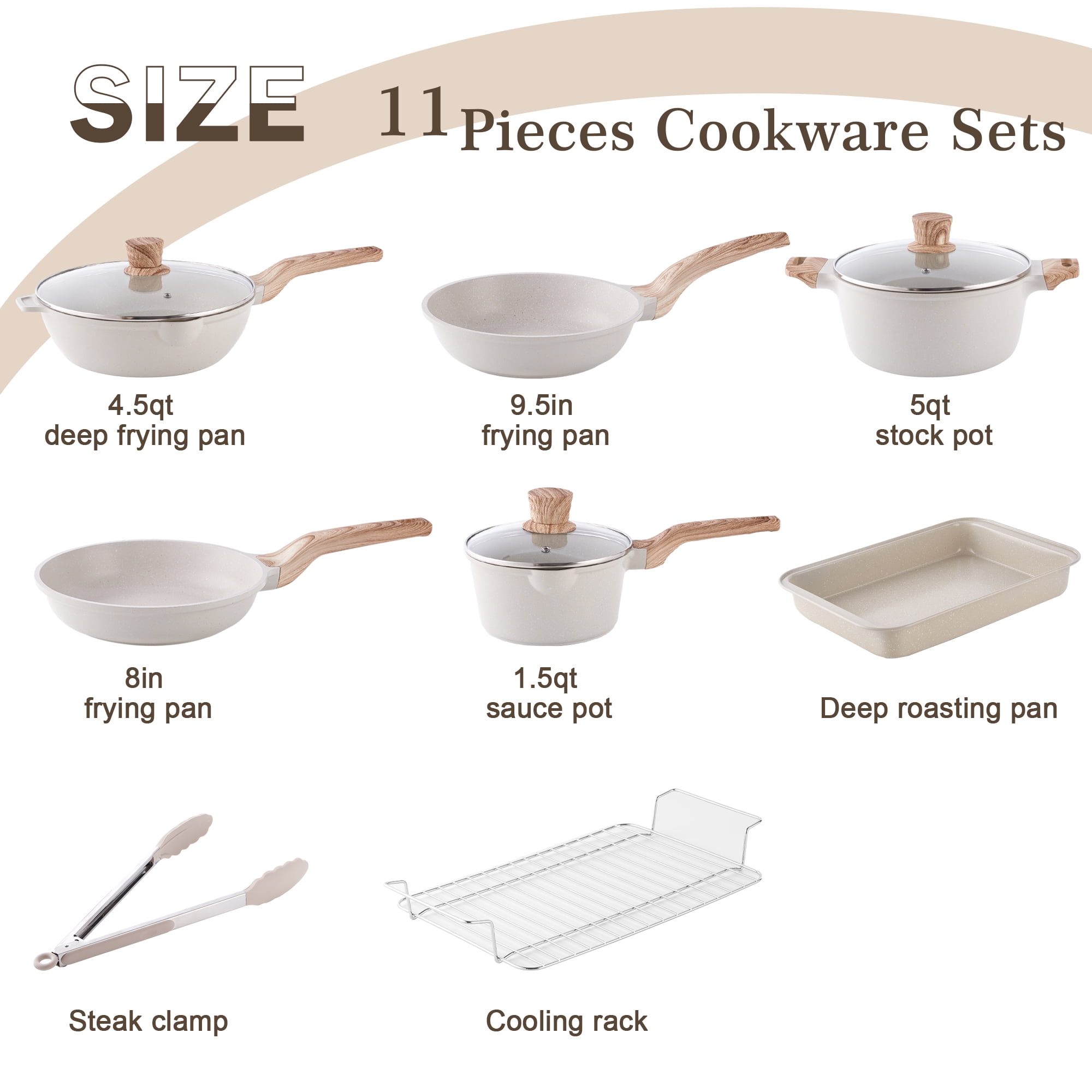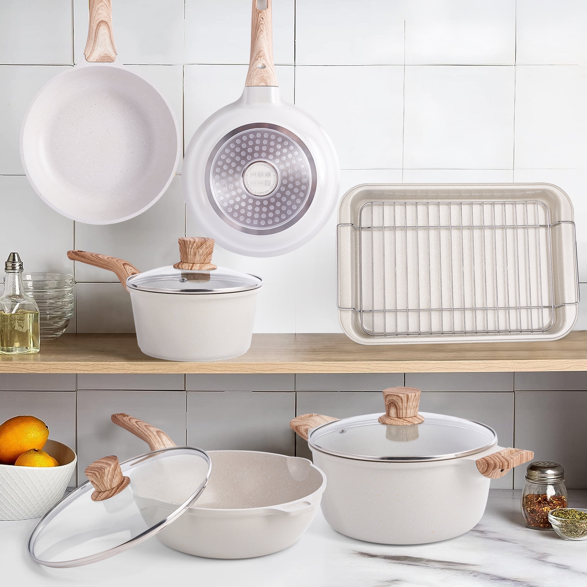 Caannasweis 10 Pieces Pots and Pans Set Non Stick Pot Set Granite Frying Pans Nonstick Cookware Sets with Grill Pan Features: 1: This cookware sets are included 1*8″ frying pan, 1* 9.5″ frying pan, 1*2.2QT sauce pan with glass lid, 1*4.5QT deep frying pan with lid, 1*5QT stock pot with glass lid, and 1*9.5″ baking pan. This 10-pieces granite pots and pans set is everything you need to get cooking in your kitchen. Not just that, the cooking set also makes an appreciable housewarming gift or holiday gift for your loved ones. 2: Our pots and pans use scratch-proof nonstick granite coating, which can keep food sliding smoothly along the surface, preventing food to stick, and making cooking easier. Sturdy interiors can avoid chipping and coming off. 4: The pots and pans in this cookware set do not have a magnetic induction bottom, which allows faster heating on other cooktops, designed for people who do not use induction cooktops. 5: All-in-one design. Rivetless interior to prevent snags and food buildup. Just rinse with a rag or water to finish cleaning. Details: Brand: Caannasweis Material: Aluminum Is oven safe: No Is induction safe: Yes Color: Gray Package Included: 1* 8″ frying pan 1* 11″ frying pan 1* 2.2qt sauce pan with glass lid 1* 4.5qt deep frying pan with lid 1* 5qt stockpot with lid 1* 9.5″ baking pan