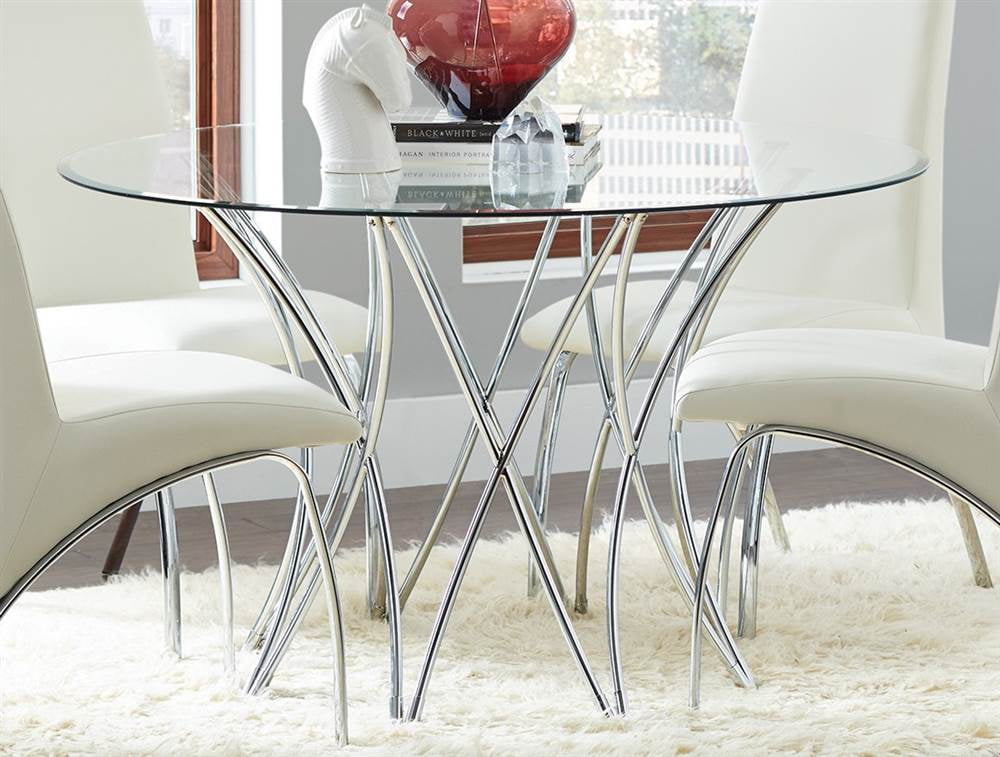 Set includes: One (1) dining table base Curvaceous sculptural table base resembles a queen’s crown Metal with polished chrome finish is strong and durable Round tempered beveled glass top keeps the focus on the stunning table base Exclusive table design Tempered glass: Provides strength and durability Mix and match: Combine pieces to match your personal style Table base finish: Chrome Assembly required: Yes