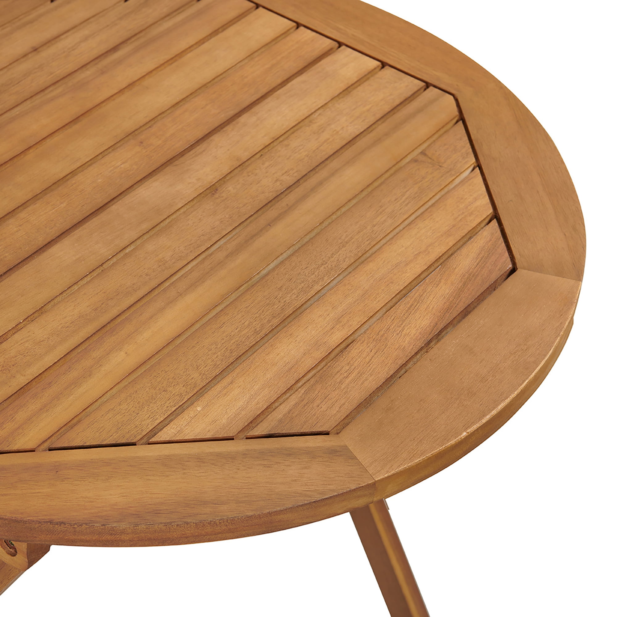 FOLDING DESIGN: Find space-saving convenience with this charming acacia wood bistro set as it quickly folds for easy storage and transport WEATHER RESISTANCE: Enjoy outdoor dining and conversations without worry, as this set is crafted from weather resistant acacia wood to last all seasons COMPACT TABLE: Perfect for the modern patio, balcony or garden, this set includes a 24” round table with a height of 28” SPACE-SAVING ELEGANCE: The Cabot Folding Bistro Set transforms your space; chairs and table fold flat for easy storage OUTDOOR FURNITURE: Everyone needs a place to gather and dine with family and friends. With this patio set, you will have everything you need for a great outdoor, weather-resistant, indoor/outdoor dining experience
