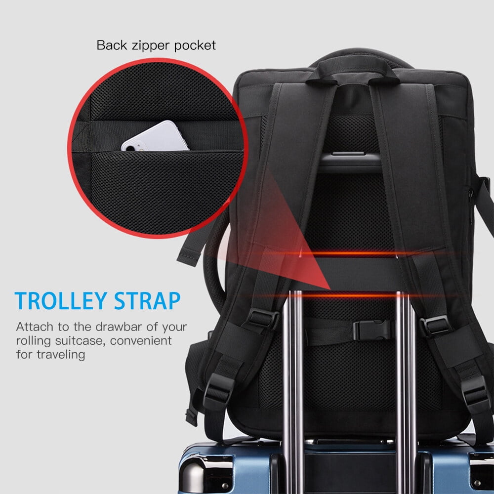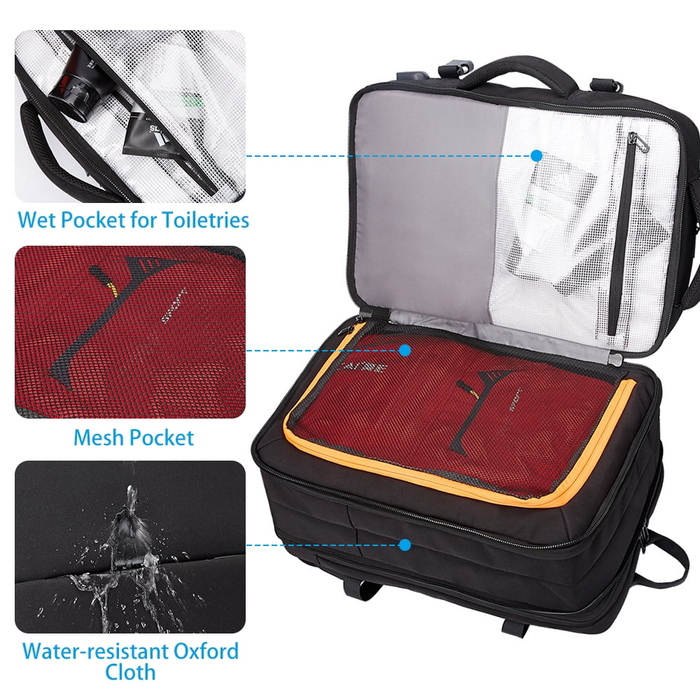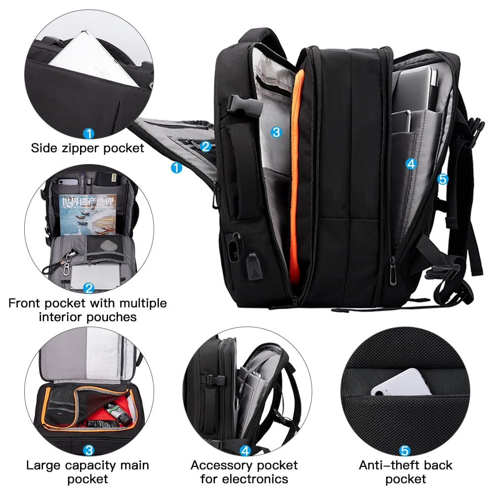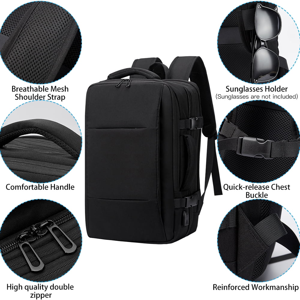 CACAGOO Expandable Carry-On Backpack with USB Charging Port Travel Weekender Backpack Fits 15.6 Inch Laptop for Men and Women Water-resistant oxford cloth material protects your belongings from the elements. Expands from 22L to 37L to hold your items safely and securely for convenient travel. Multiple compartments with plentiful interior pockets keep your items organized. Laptop pocket fits 15.6 laptop; special pocket for the sundries. External USB port offers a convenience to your mobile phone.