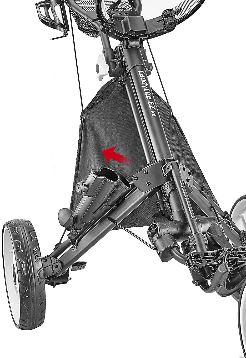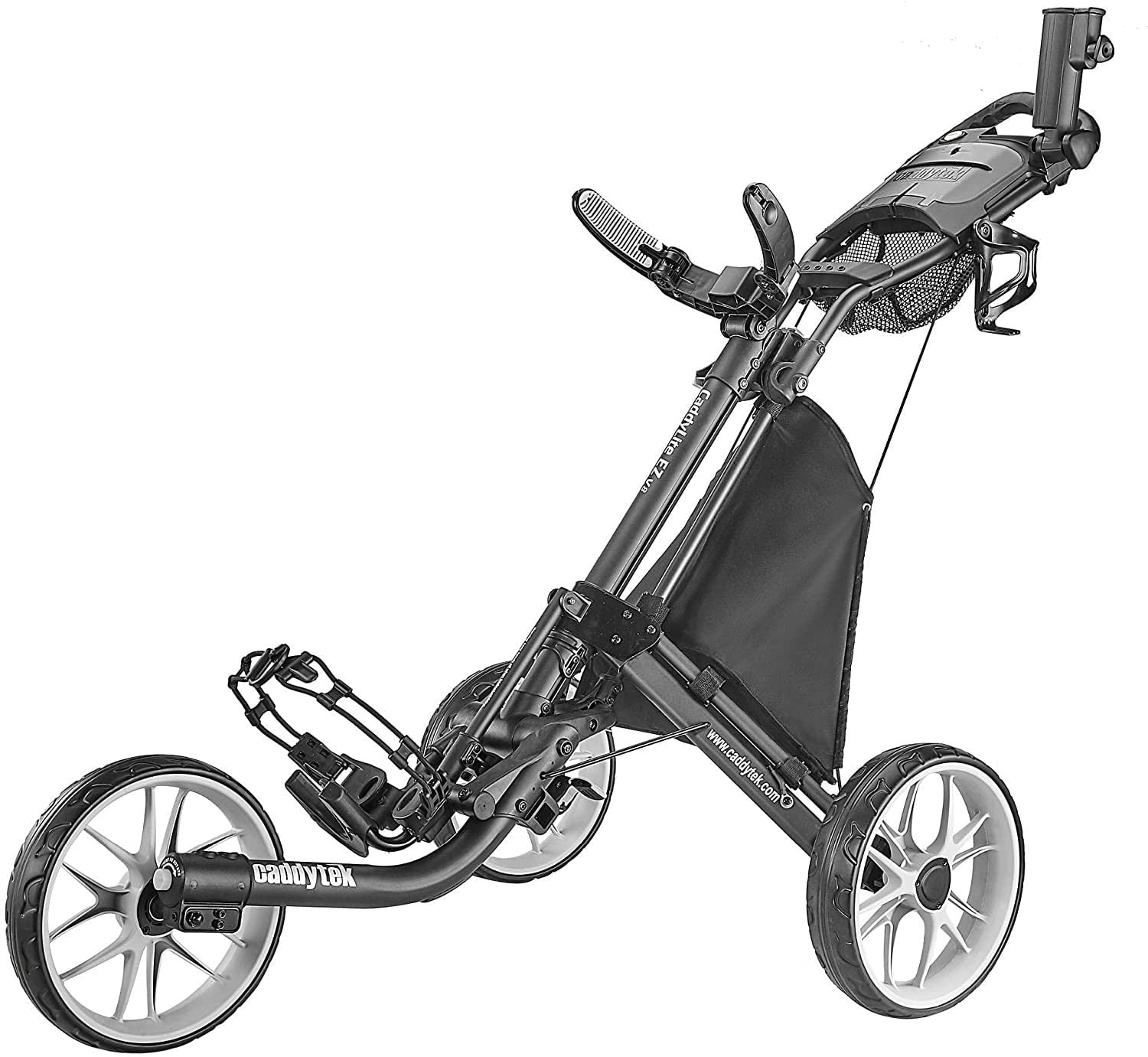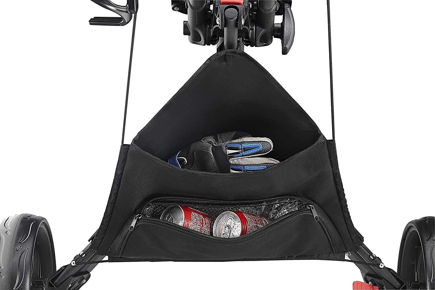 The patented one-click button mechanism folds the cart to a compact size (28.15″ x 16.3″ x 14.4″) in 2 simple steps. Designed with a strong aluminum frame, weighs less than 18.5 lbs. Three large 11.5″ x 2.6″ EVA maintenance-free wheels with ball bearings provide perfect traction on all types of terrain 31″ wide body design for effortless pushing. A new clamp-type bag holder secures the golf bag easily. Patented miscellaneous basket with built-in cooler