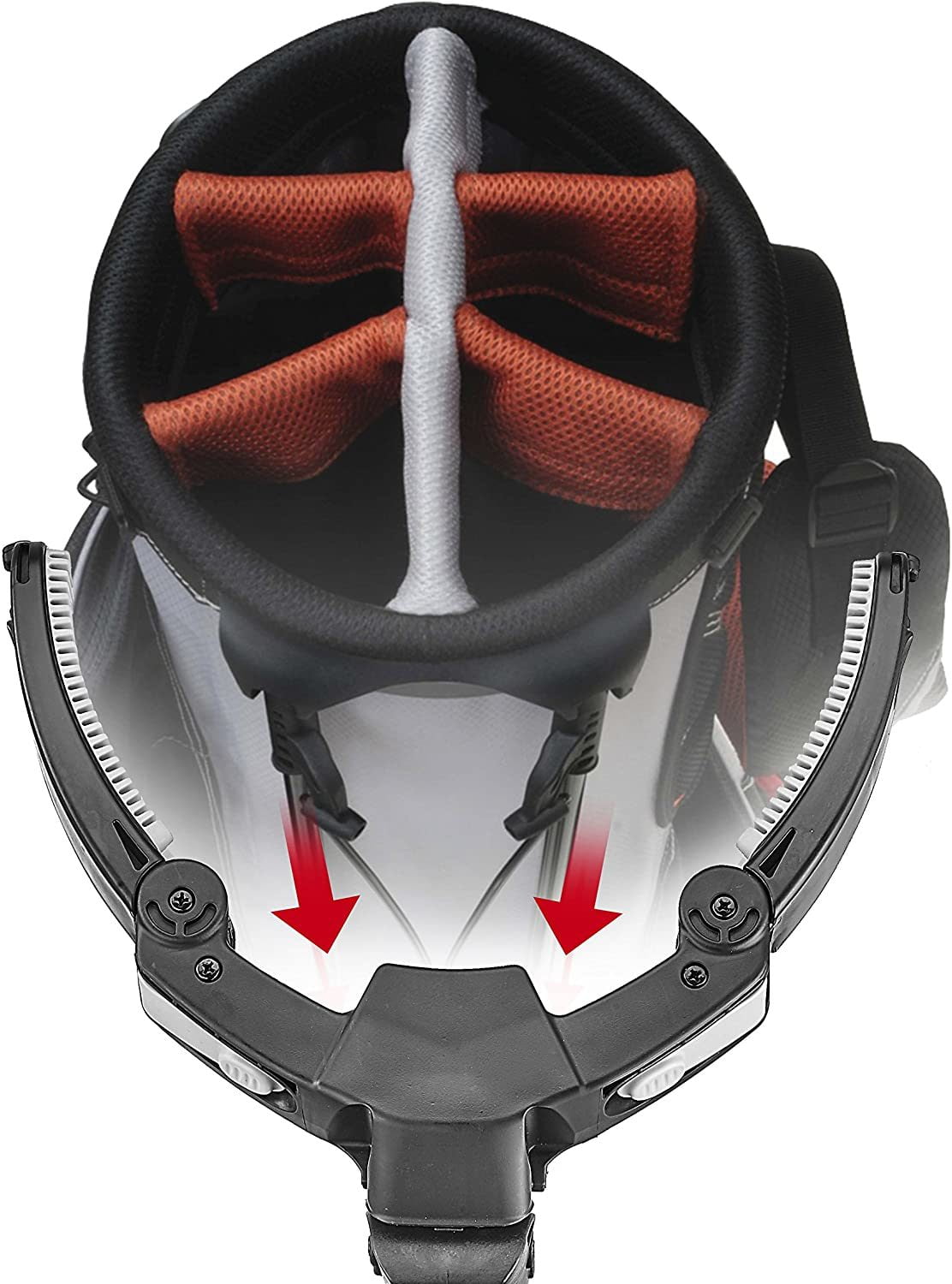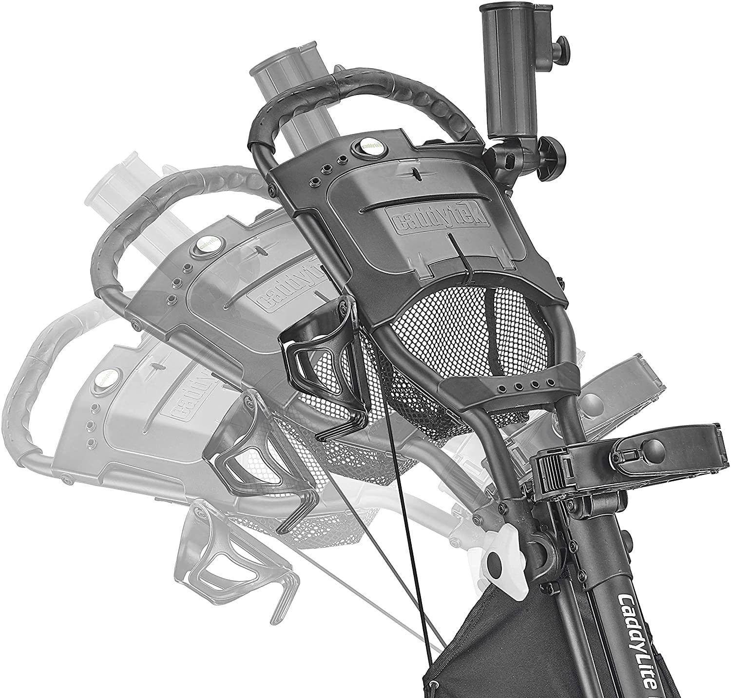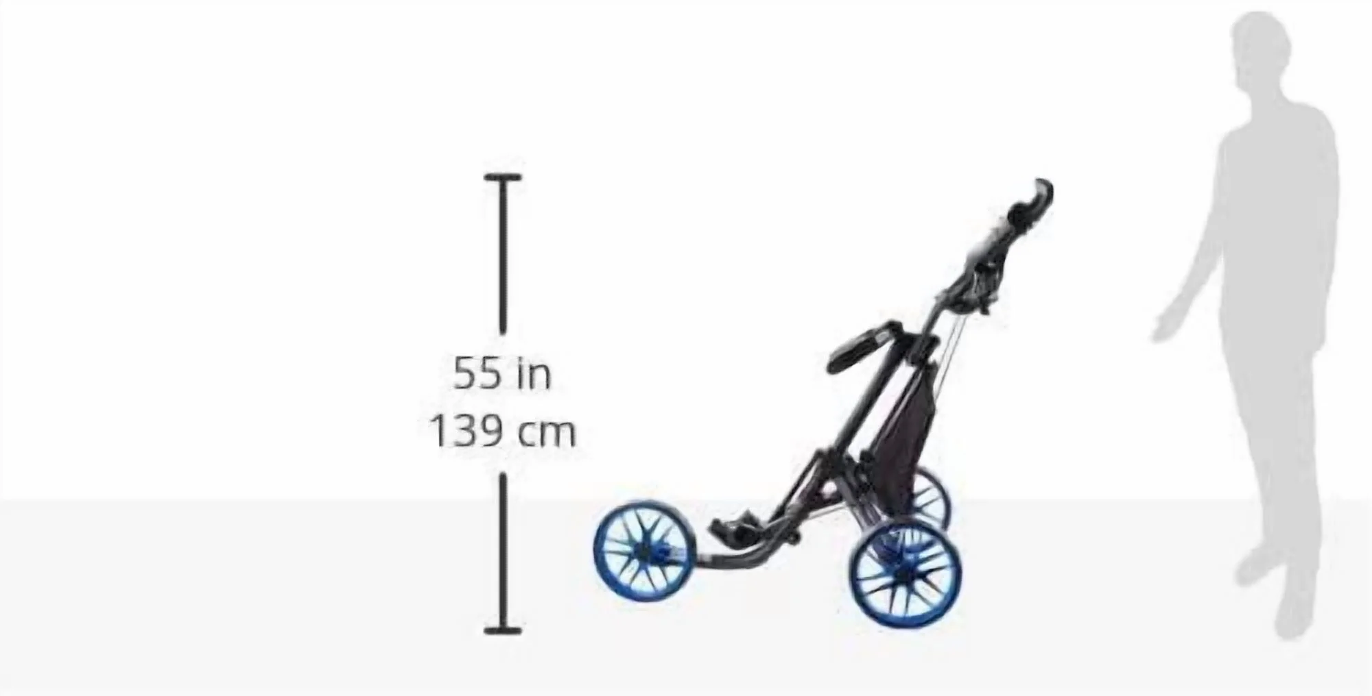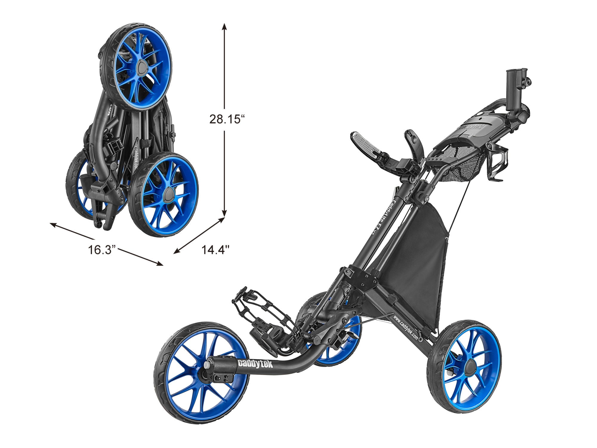 The patented one-click button mechanism folds the cart to a compact size (28.15″ x 16.3″ x 14.4″) in 2 simple steps. Designed with a strong aluminum frame, weighs less than 18.5 lbs. Three large 11.5″ x 2.6″ EVA maintenance-free wheels with ball bearings provide perfect traction on all types of terrain 31″ wide body design for effortless pushing. A new clamp-type bag holder secures the golf bag easily. Patented miscellaneous basket with built-in cooler