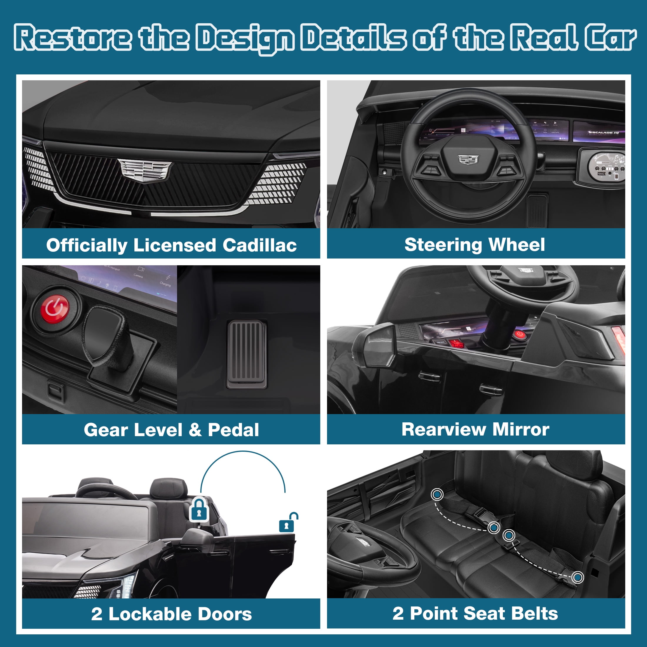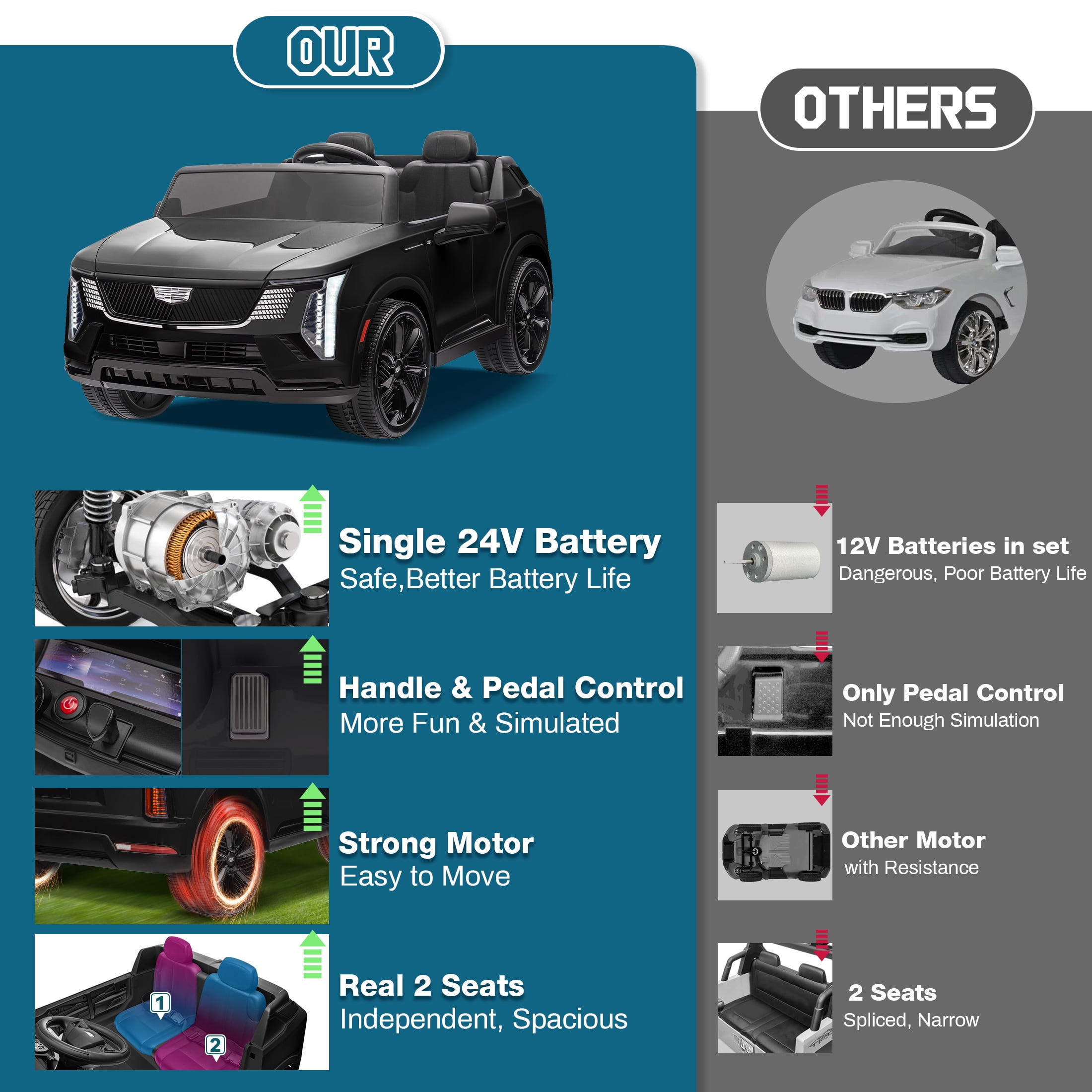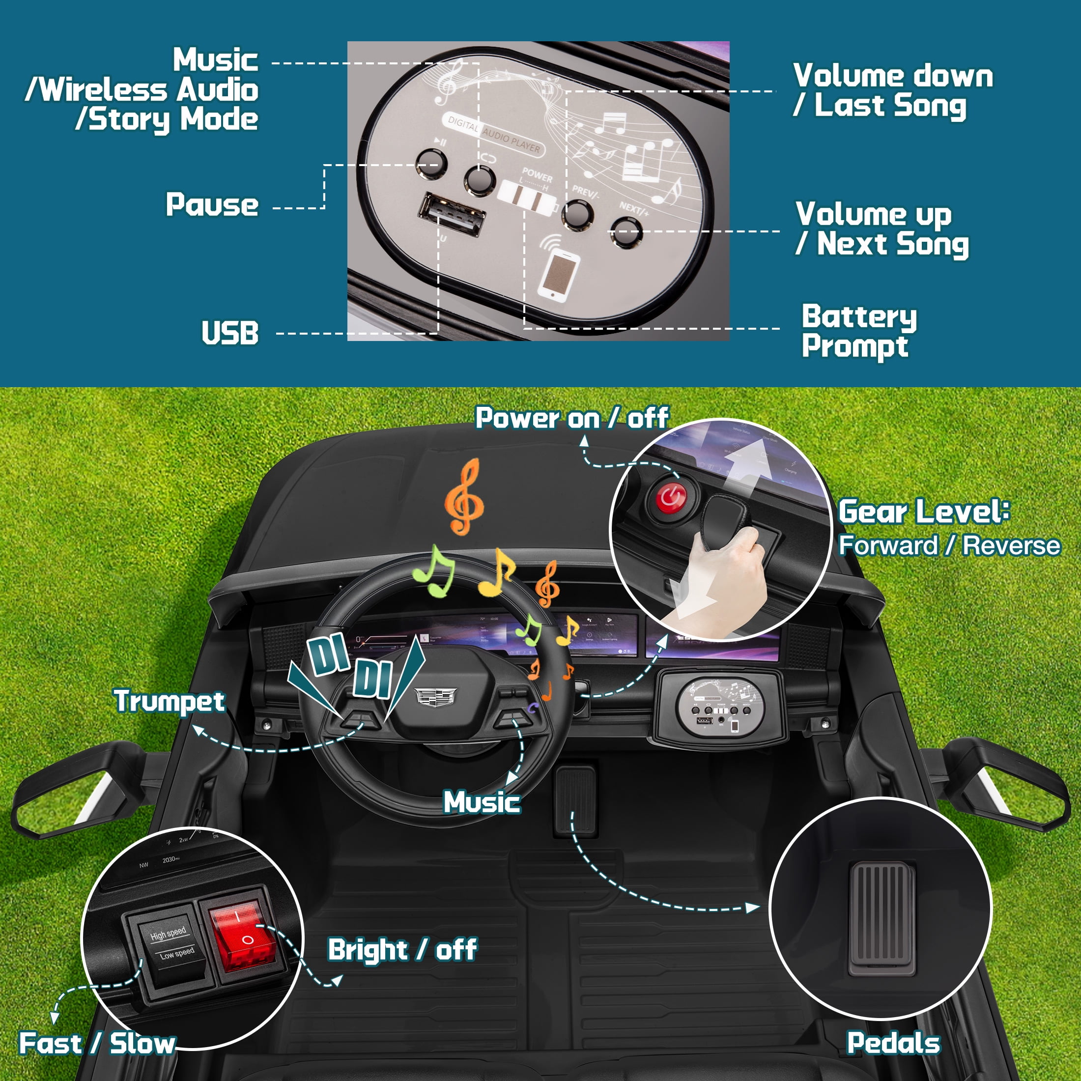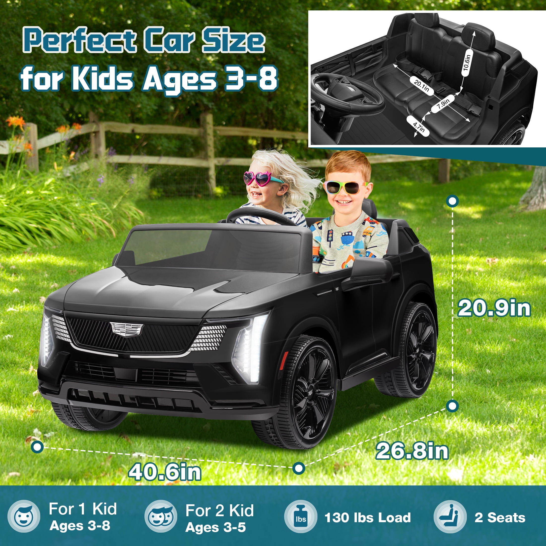 Cadillac Official Authorization: Cadillac is officially authorized to produce, this stroller restores the design of the real car. Your little driver can enjoy a comfortable, relaxed driving experience. This kids ride-on car makes an exciting surprise gift for kids ages 3-8. Two driving modes: This car provides two modes of parental remote control and manual control. Through the 2.4GHz remote control, parents can control their children’s vehicles at any time, ensuring a safer driving experience and minimizing potential risks. In manual mode, children can use the steering handle, pedals and steering wheel to operate the car and exercise children’s motor skills. 24V Battery & Real 2 Seats: The package includes a 24V rechargeable battery and two motors, which can be fully charged within 8-12 hours, providing your child with 1-2 hours of playing time. The two-seater allows the baby and his little partner to enjoy the fun of children’s rides. Multifunctional Entertainment: This kids car is equipped with an MP3 control panel with power indicator light, which allows you to play your child’s favorite music via FM radio or Bluetooth. Colorful and bright LED lights and dynamic music enhance the fun of driving experience. This electric car for kids is the perfect gift for birthdays, parties, Christmas, New Years and more. Safety First & Shock Absorption: This kids ride-on car is made of kid-friendly and safe materials, ensuring your kids’ health. In addition, it is also equipped with four wear-resistant wheels, and the shock absorption design is suitable for various terrains. A convenient handle makes it easy to move the car when there is no power. Notes! ! ! 1. Children under the age of 6 should drive under the supervision of their parents 2. Due to manual measurement, please allow 1-3cm error 3. Due to display reasons, please allow errors in actual colors and pictures 4.This ride on cars cannot be used for commuting. How to maintain the battery? 1. When charging for the first time, make sure it has been fully charged for 8-12 hours to ensure performance and battery life. 2. Normal charging time should not exceed 18 hours to avoid damage. 3. When the power is low, please charge it in time to maintain the battery life. Please do not wait for the battery to run out before charging it. 4. If you don’t use it for a long time, it is recommended to unplug the power cord of the battery inside the body. And unplug the batteries (not included) from the remote control and steering wheel and store them separately. 5. It is recommended to charge the battery every 1 month or so to prevent excessive discharge.
