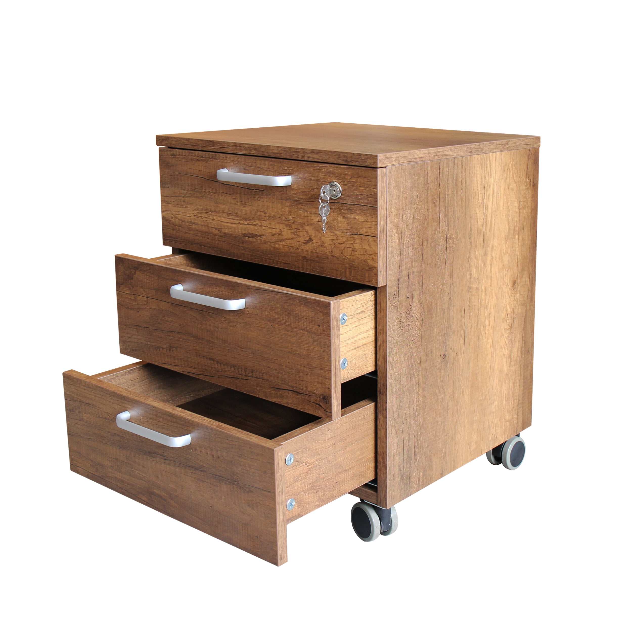 Blend style, flexibility and reliability at work or in your home. The office cabinet by Caesar Hardware is a 3-drawer mobile file cabinet that combines a modern natural oak or dark maple finish with fashionable stainless-steel hardware to inspire your professional best.Give your workspace commercial-grade quality that promotes growth and productivity with convenient, reliable features. The contemporary cabinet provides two box drawers to store office supplies with a full-extension file drawer for letter-size paperwork. Make organization easy with this mobile file cabinet. Drawers glide on smooth ball-bearing slides for a trouble-free open and close, while the cabinet rolls effortlessly on dual-wheeled hooded casters. Slide the mobile file cabinet under your desk or move wherever you need supplies and documents. A durable, thermally fused laminate finish maintains the beautiful contemporary look for years. Celebrate your unique style and personality with the Caesar Hardware Office collection. Browse our full line of contemporary and modern furniture to create an office set you’ll love for years to come.