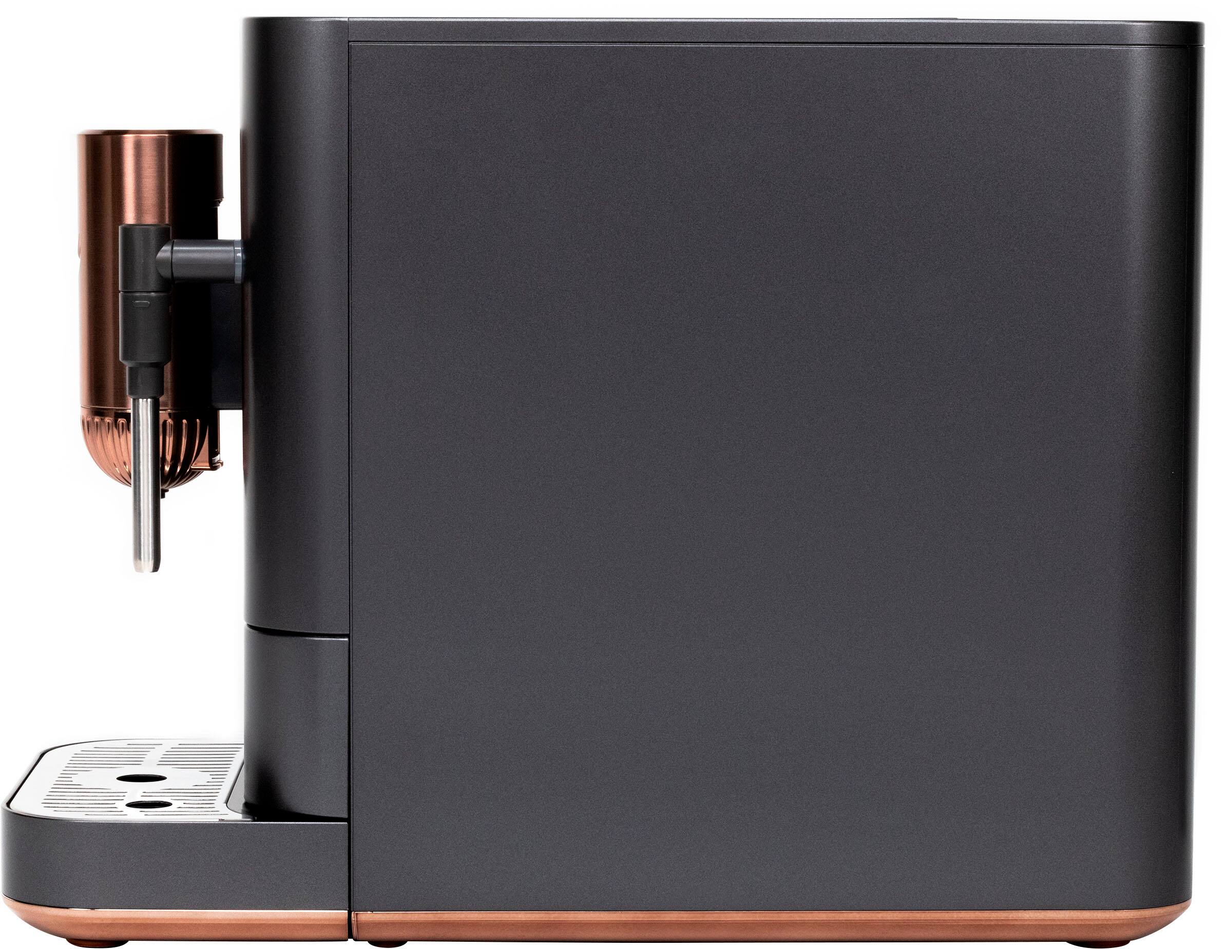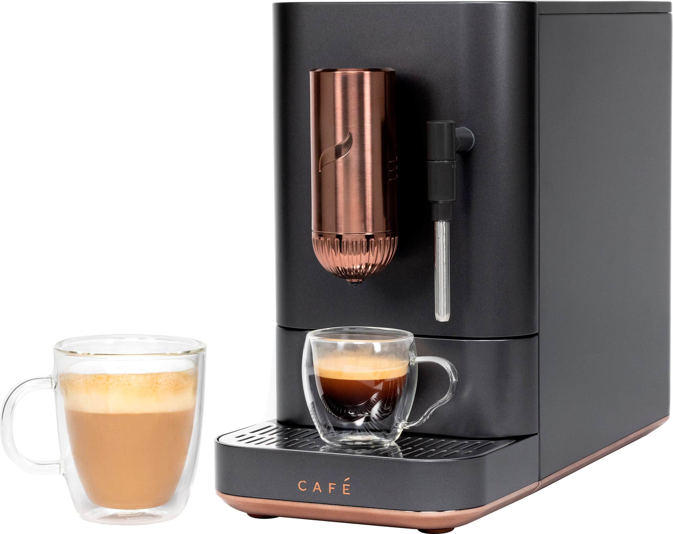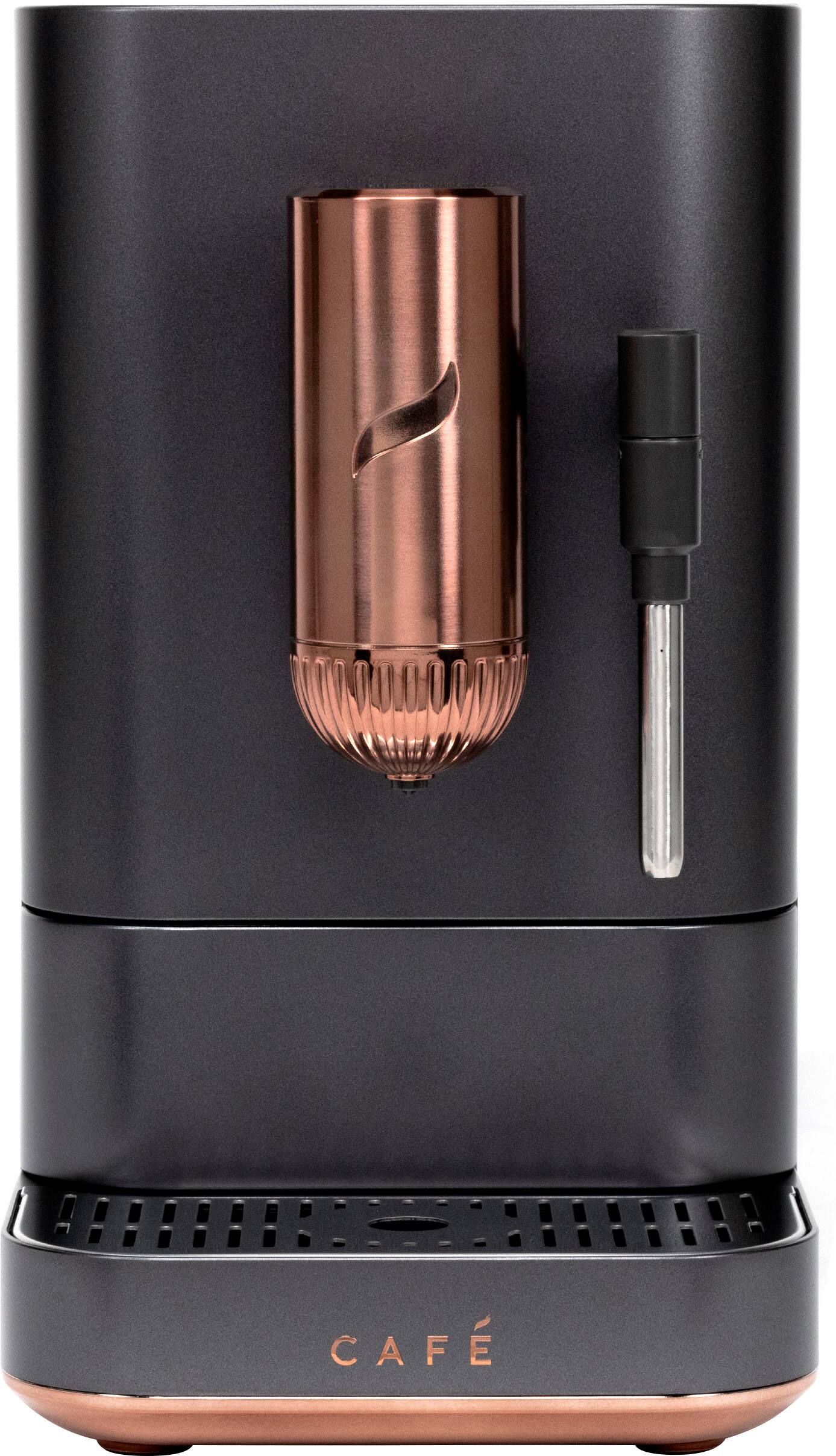 This compact espresso machine has a 7″ wide footprint and is adorned with signature copper accents, adding style and sophistication to any countertop.