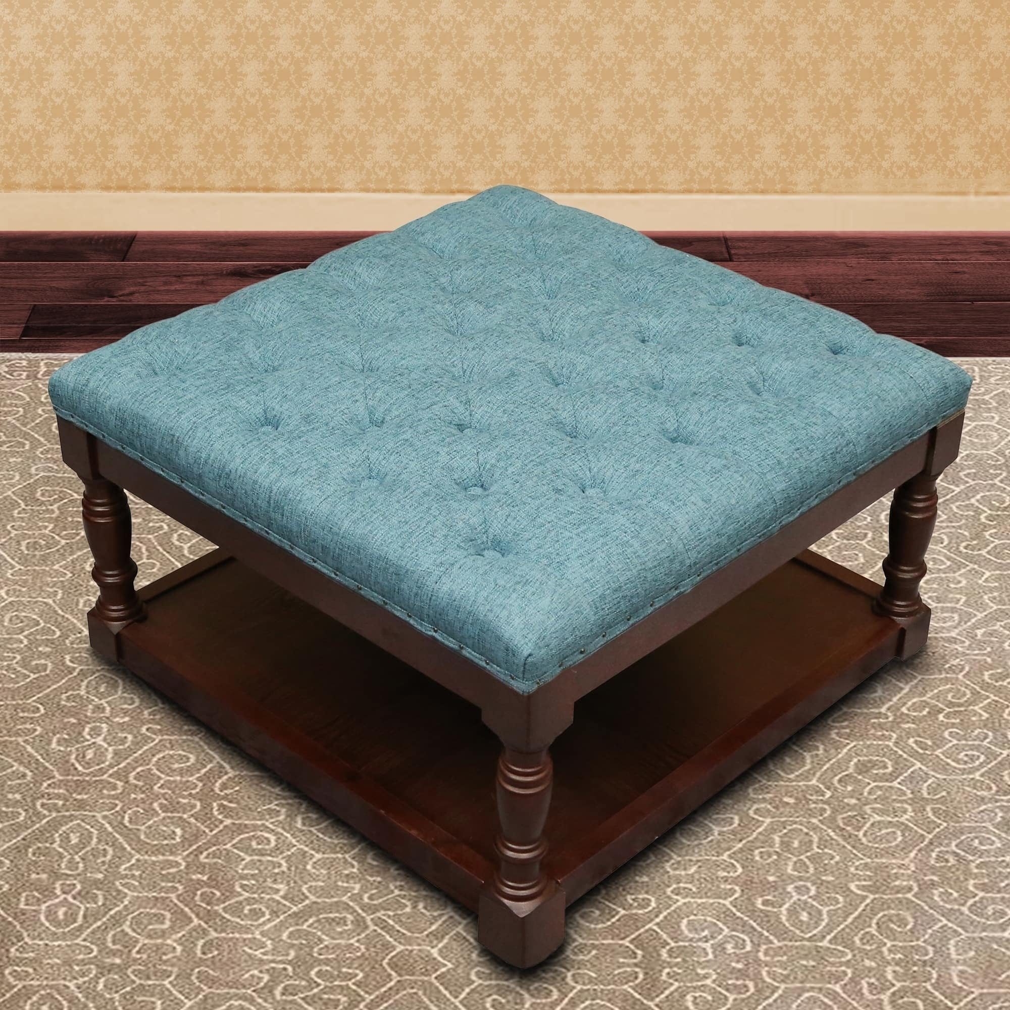 Indulge in a touch of old world charm with this Cairona Fabric 30-inch Tufted Shelved Ottoman. With elegant carved base details and a button-tufted linen fabric top, this ottoman exudes sophistication and flair. Use the ample top space to hold snacks, decor, or magazines while taking in the stunning design. The shelf space below provides additional storage. Available in various color and finish options to suit your style. Features: Button-tufted linen fabric Wood frame with shelf space below Standard cocktail ottoman Made with fabric, wood, foam, and nailheads Brown, natural, or white base finish Measures 30 inches wide x 30 inches deep x 16 inches high Assembly required