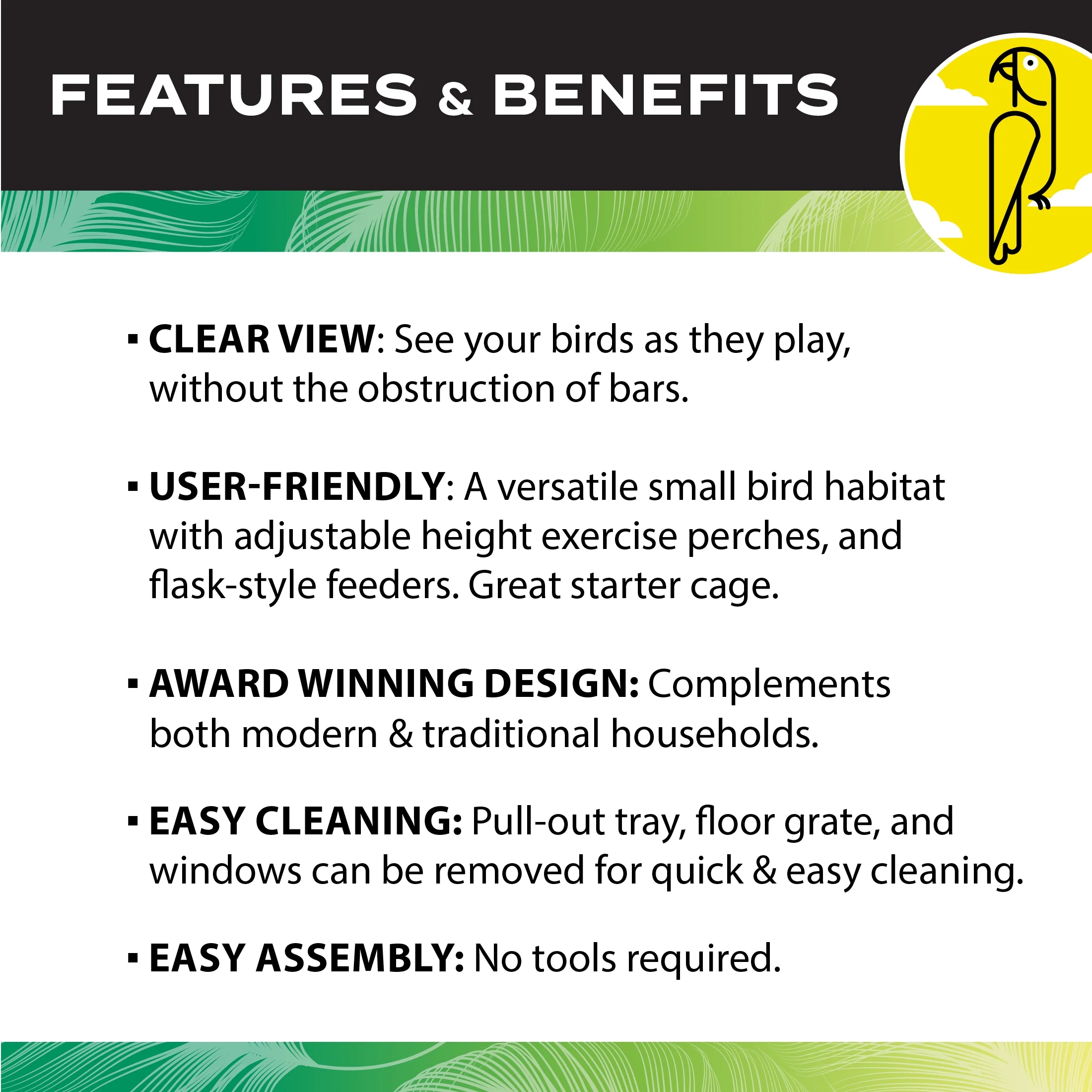 Clear acrylic bowed front and back panels for an unimpeded view of your bird Wire sides each have a latching top access door Includes feeder and waterer cups, wood perch, and pull-out bottom grill and tray Intended for small birds like Finches and Parakeets Makes a great travel or temporary cage