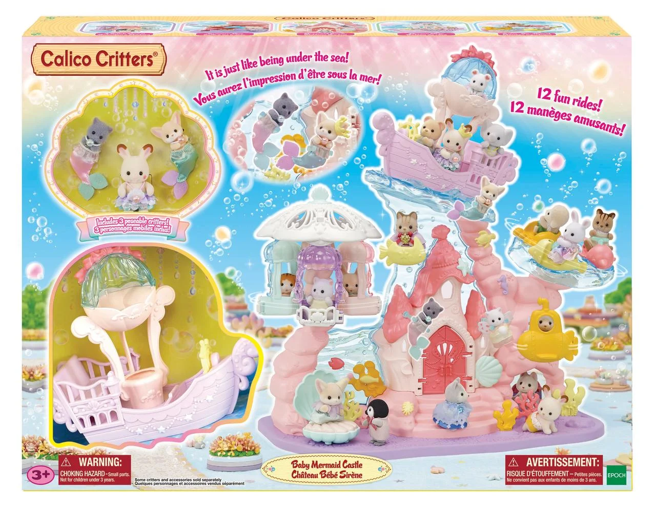 Calico Critters Baby Amusement Park Playset with Figures and Accessories Includes 3 poseable baby figures who are dressed in removeable mermaid costumes including Chocolate Rabbit baby, Persian Cat cradle baby and Fennec Fox cradle baby Four main attractions for babies to ride including the Dreamy Pirate Ship, rotating Jellyfish Swing with three gondolas, Merry Go Round with Crab, Whale and Dolphin Rides and Submarine and Fish swings! Play together with the Baby Sea Friends Series collectibles and Baby Amusement Park!