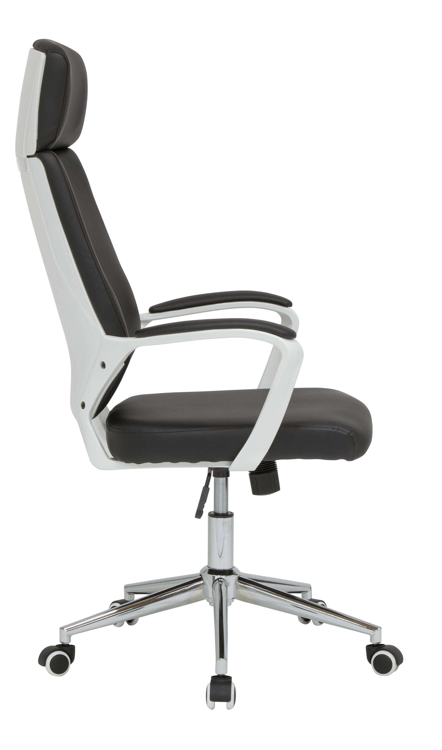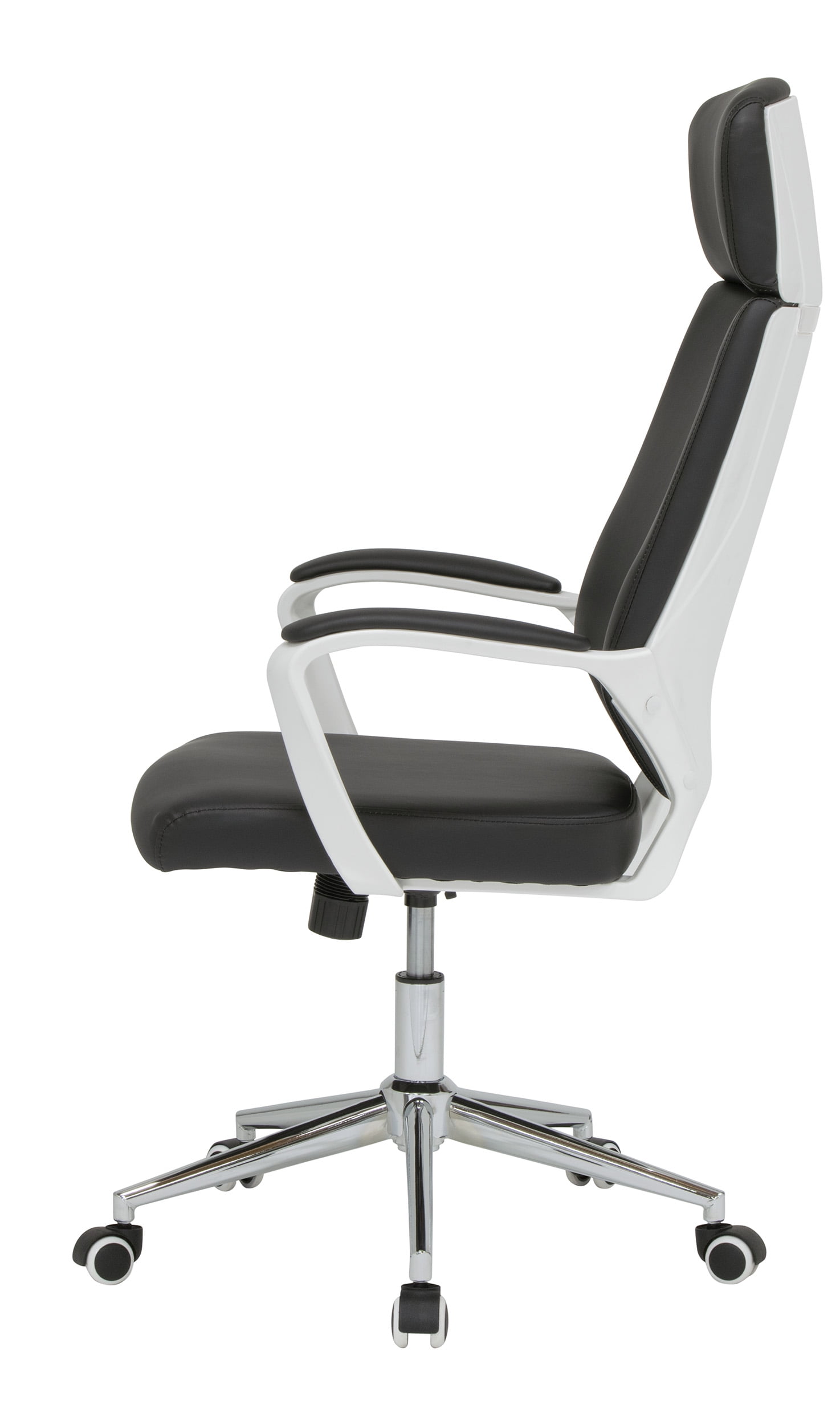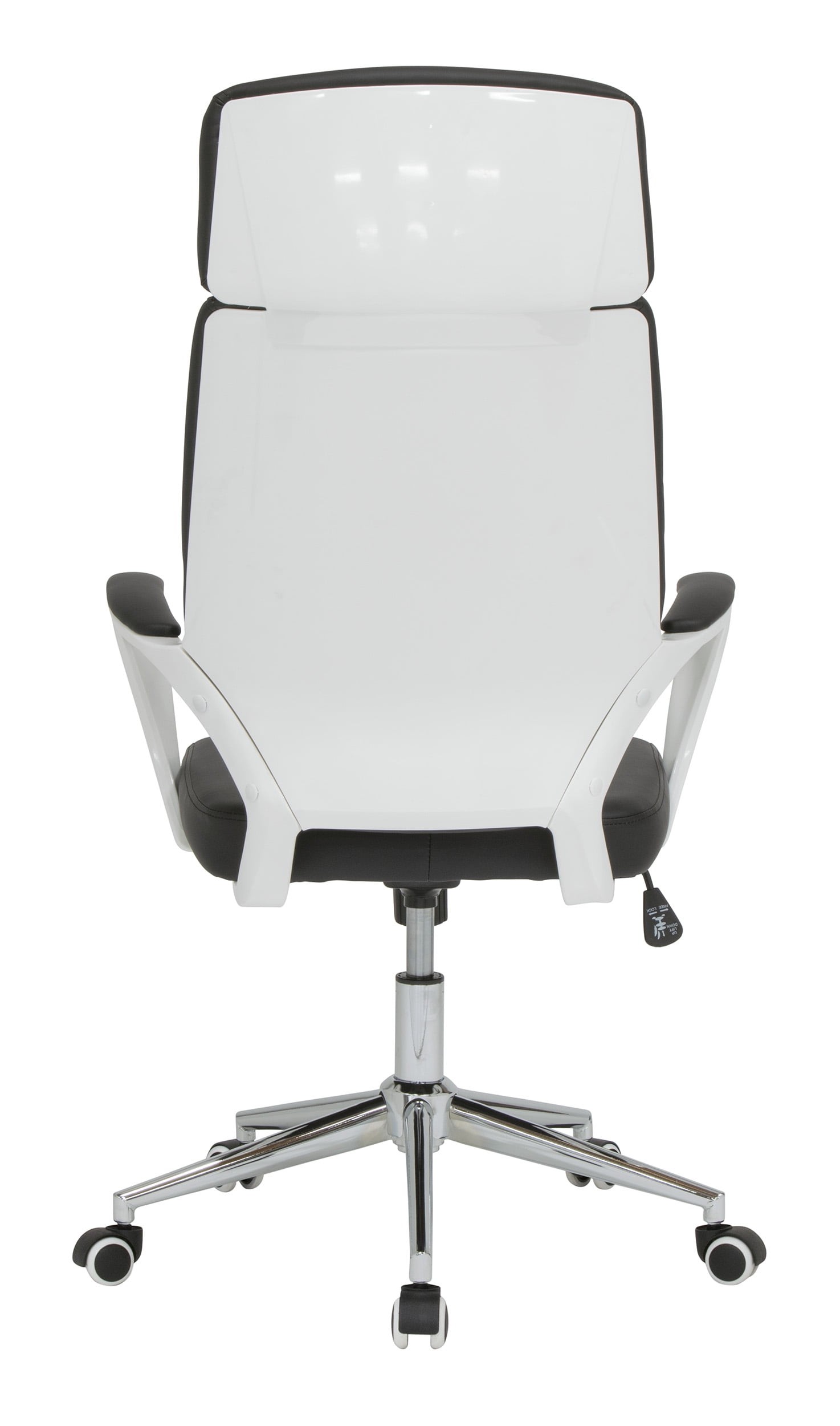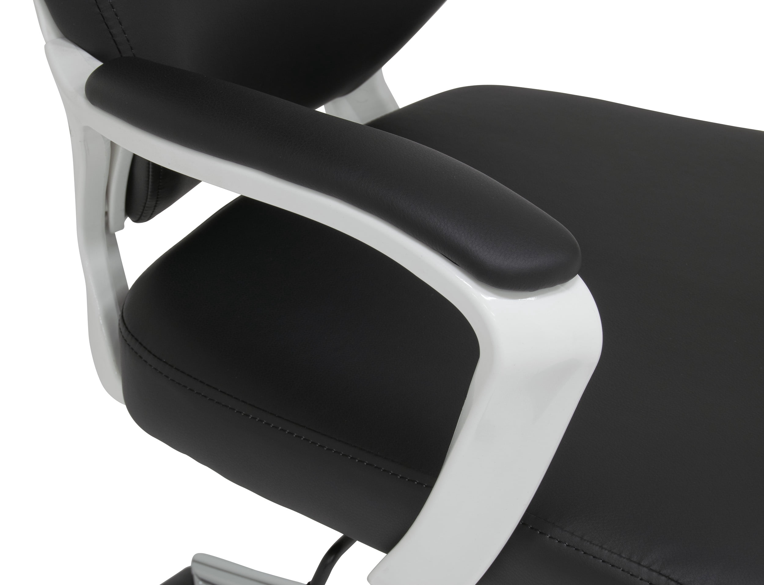 Overall dimensions:25″ W x 27″ D x 47.5″ H Padded Leather Seat:19.5″ W x 19.5″ D HEIGHT ADJUSTABLE:18″ ? 21″ seat to floor Contoured Padded Back with Built In Headrest:17.5″ W x 28″ H Free Recline with Tension Control Knob and Locking Upright Position Fixed Padded Leather Armrests:25.25″ ? 28.25″ arm to floor Glossy White Frame and Black Leather Five Star Chrome Base with 2″ Covered Casters Weight Limit:330 lbs. Prop:65 – YES