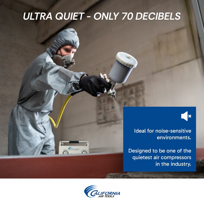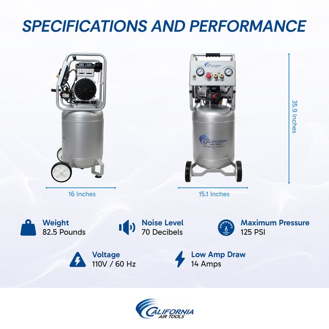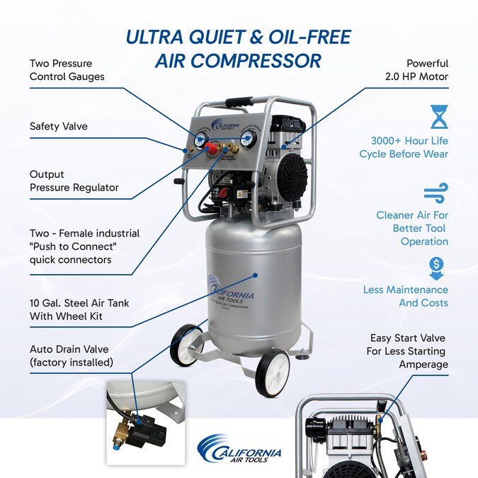 The California Air Tools 10020CAD Ultra Quiet and Oil-Free Air Compressor is designed to be one of the quietest 2.0 HP air compressors in the industry having only 70 dB of sound. The Powerful “New” 2.0 HP (SP-9421) motor operates at only 1,680 RPM creating less noise and less wear. The “New” SP Series of Ultra Quiet Air Compressor Motors have been designed to increase duty cycle and allow for longer continuous run times. The Oil-Free Dual Piston Pump System is engineered for high performance and durability. The CAT-10020CAD Air Compressor has an Oil-Free Dual Piston pump designed to have a life cycle before wear of 3000 plus hours compared to other comparable air compressors with life cycles of 500 hours or less. The Oil-Free pump allows for use in a variety of temperatures (cold starts) and uneven terrains (no oil in the pump). The Easy Start Valve feature allows for an easier start up using less starting amps. The large 10 gal. Steel Air Tank with wheel kit makes it very easy to move around the job site, shop or garage. The California Air Tools EZ-1 Automatic Drain Valve has been designed to eliminate manually draining your air compressor air tank. Designed for the person looking for Power, Air Flow, Less Service and Maintenance with at Least 30% Less Noise.