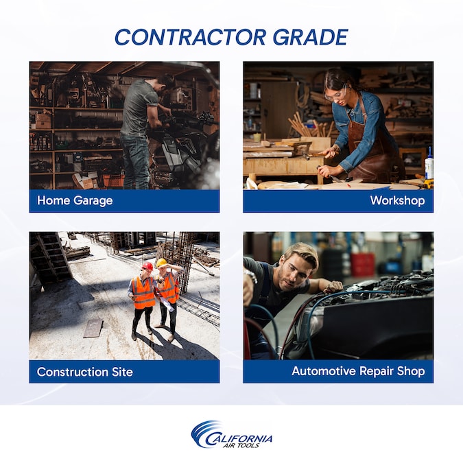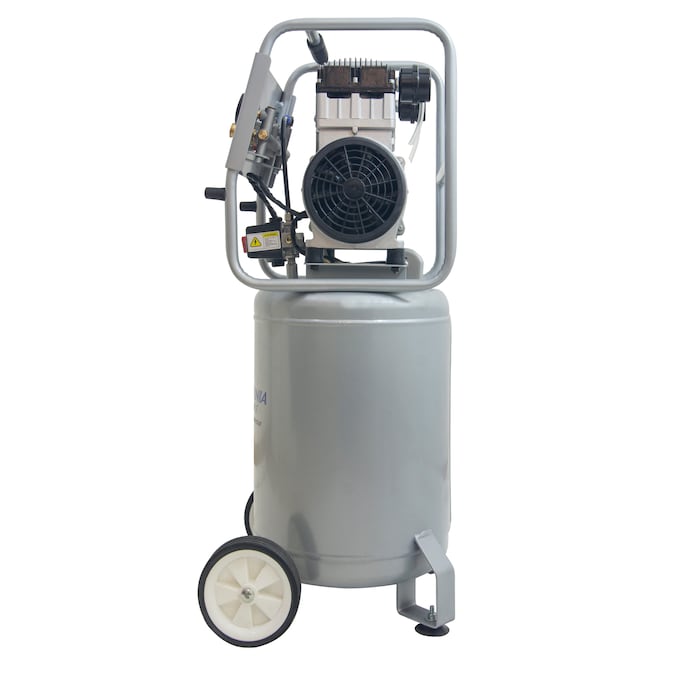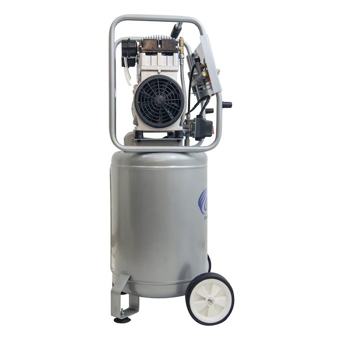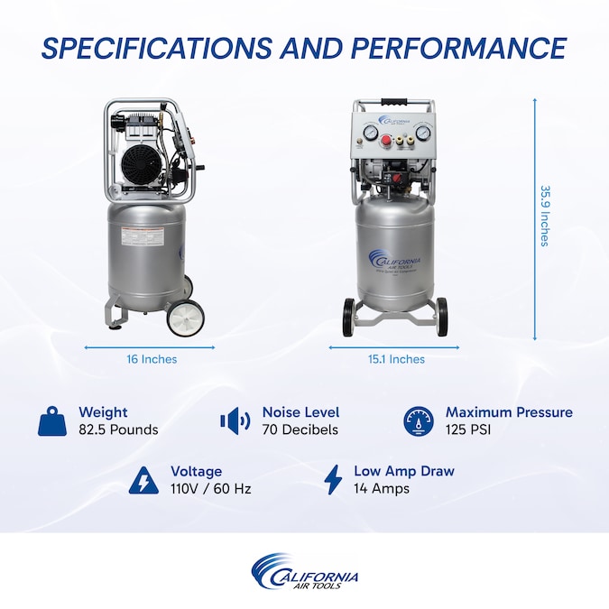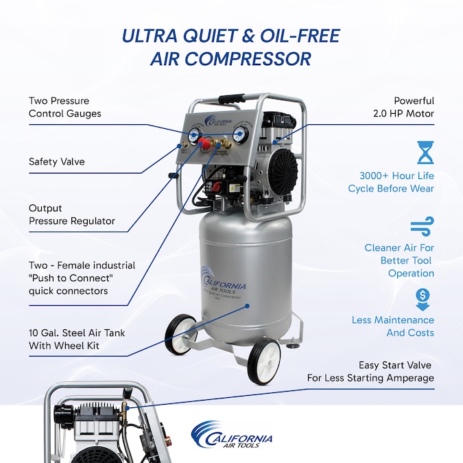 The CALIFORNIA AIR TOOLS 10020C 10-gallon electric air compressor delivers reliable power and air flow with less maintenance and noise. Operating at an ultra-quiet 70 dBA, the powerful 2.0 HP (SP-9421) motor produces 1680 RPM creating less noise and less wear. It is designed to increase duty cycle and allow for longer, continuous run times. Enabling a variety of use in varying temperatures and uneven terrains, the machine’s oil-free dual piston pump system is engineered for high performance and durability. The oil-free function extends the compressor’s life cycle to more than 3,000 hours before wear compared to comparable compressor’s 100 hours or fewer. You can start this compressor using fewer starting amps with the easy-start valve, which also releases a small amount of air from the pump to produce a no-load condition that allows the motor to spin freely. The included wheel kit permits easy movement around your jobsite, shop or garage.