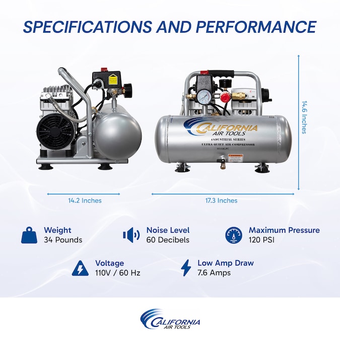 The California Air Tools 2010ALFC Ultra Quiet air compressor is designed to be one of the quietest air compressors in the industry having only 60 decibels of sound. The powerful 1 HP motor operates at only 1400 RPM creating less noise and less wear. The Oil-Free Dual Piston Pump System is engineered for high performance and durability. The Dual Piston Pump System produces 25% more air compared to other 1.0 HP air compressor motors. The MP100LF motor/pump is tested for a minimum life of 4000 hours before wear. The 2-Gal. aluminum air tanks are lightweight (35 lbs.) and rust resistant making it very easy to transport. This air compressor is ideal for anyone working inside where noise is a major issue.