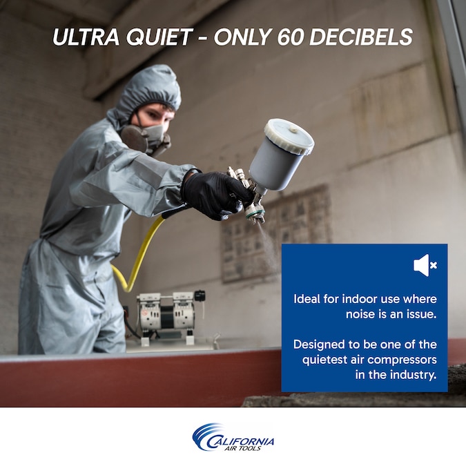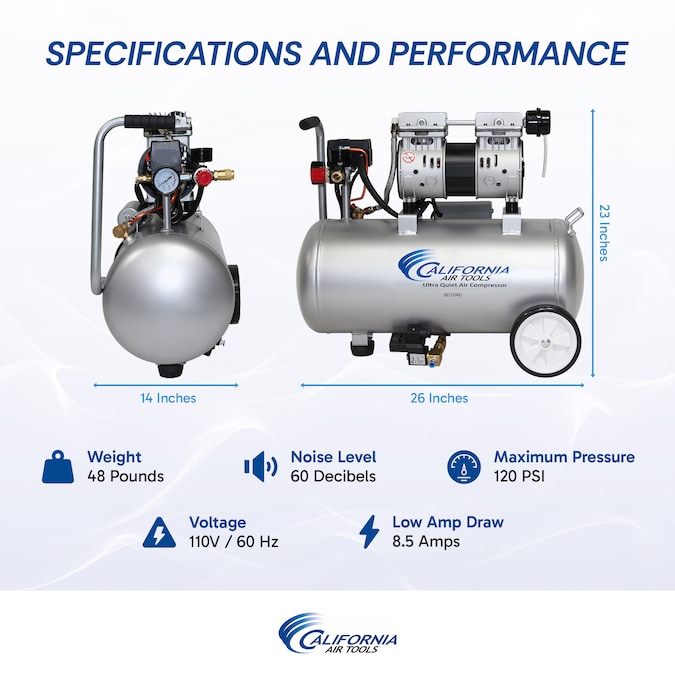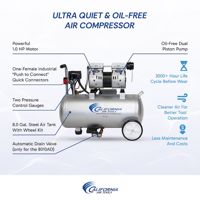 The California Air Tools 8010AD Ultra Quiet & Oil-Free Air Compressor is designed to be one of the quietest air compressors in the industry having only 60 decibels of sound.1.0 HP (Rated/Running) – 2.0 HP (Peak), 8.0 Gallon Steel Tank, 3.00 CFM @ 40 PSI, 2.20 CFM @ 90 PSI. The powerful 1.0 HP motor operates at only 1680 RPM creating less noise and less wear. The Oil-Free Dual Piston Pump System is engineered for high performance and durability. The 8010AD Air Compressor has a Oil-Free Dual Piston pump designed to have a life cycle before wear of 3000 Plus hours. The Oil-Free pump allows for use in a variety of temperatures and uneven terrains. The large 8.0 Gallon Steel Air Tank is Lightweight (49 lbs) and the wheel kit makes it very easy to transport. The factory installed California Air Tools EZ-1 Automatic Drain Valve has been designed to automatically drain your air compressor air tank.