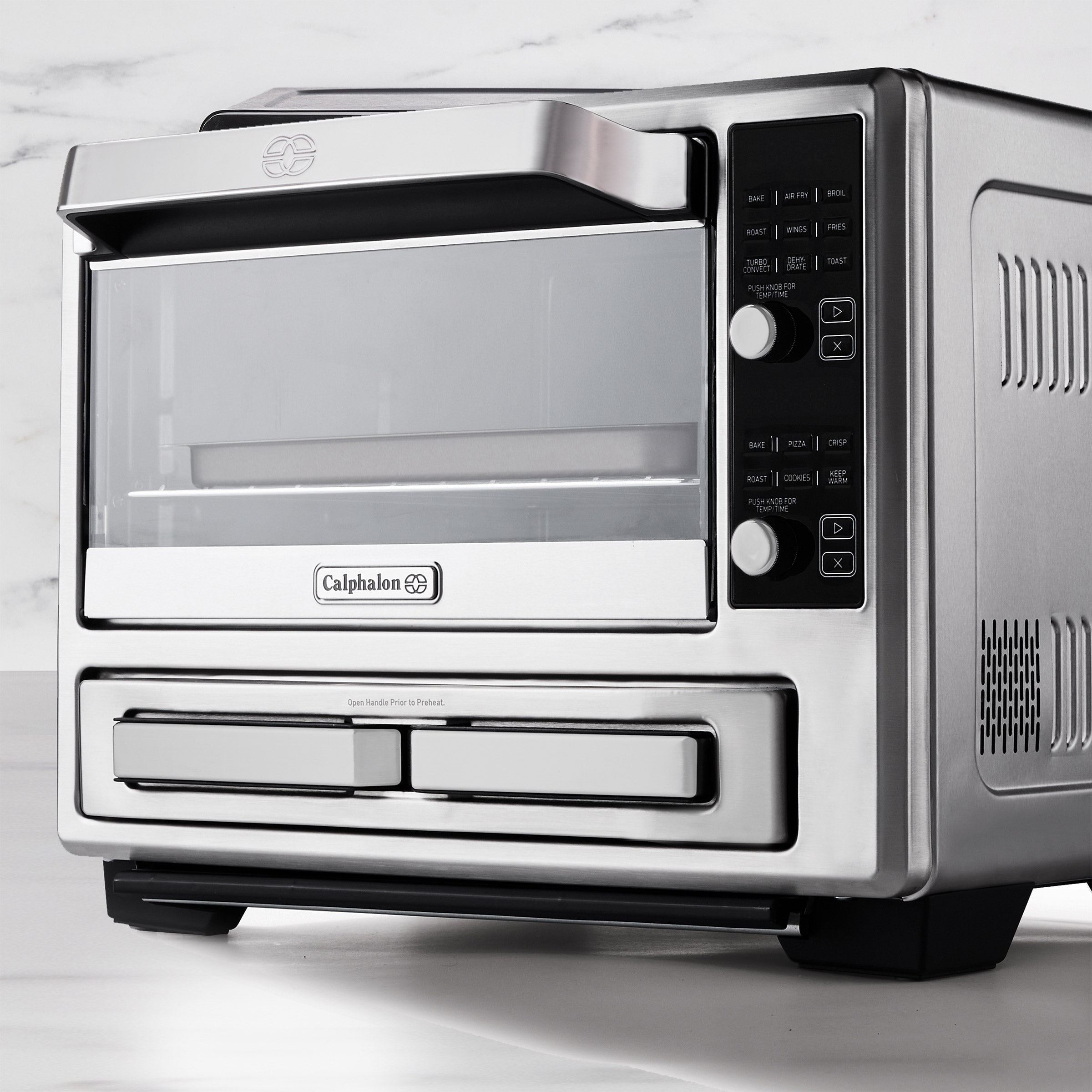 15 Precision Cooking Functions 2 Independent Cooking Chambers Turbo Convection Heat Technology Dishwasher-Safe Accessories Prepare multiple meals at one time with the Calphalon Performance Dual Air Fry Convection Oven. This premium countertop oven features two individual cooking zones that allow you to simultaneously prepare a main course with a side or two separate main courses, with professional-grade precision. Enjoy crispy meals and snacks with the Air Fry function or choose from any of the 15 precision cooking functions for unrivaled multifunctional use. Cook larger meals in the upper chambers with the Bake, Air Fry, Broil, Roast, Wings, Fries, Turbo Convection, Dehydrate, and Toast functions. Prepare sides, desserts, and smaller entrees in the lower chamber with Bake, Pizza, Crisp, Roast, Cookies, and Keep Warm functions. This convection oven includes Turbo Convection Heat Technology, which increases airflow circulation for faster, more efficient countertop cooking. The elevated stainless steel design enhances the look of any kitchen. Product Features: Dishwasher-Safe Accessories Includes air fry rack, nonstick baking pan, wire rack, and removable crumb tray Two Meals at Once: Simultaneously cook a main course with a side, or two separate main courses to make multiple meals in half the time Two Independent Controls: Program time and temperature separately for each zone to ensure perfectly timed meals Versatile Cooking: Choose from 15 precision cooking functions including Bake, Air Fry, Broil, Roast, Wings, Fries, Turbo Convection, Dehydrate, and Toast on the upper chamber, and Bake, Pizza, Crisp, Roast, Cookies, and Keep Warm on the lower chamber Two Precision Cooking Zones: Upper chamber features a large capacity to cook full-sized meals and proteins while lower chamber is perfect for pizza, sides, and more Turbo Convection Heat Technology: Increases airflow circulation for faster and more even cooking Sleek Stainless Steel: Durable stainless-steel construction provides a modern addition to any kitchen Dimensions & More Info: Model: 2168575 Item Dimensions (inches): 16.2 W x 17.56 L x 13.7 H Weight: 14.99 lbs Made in China