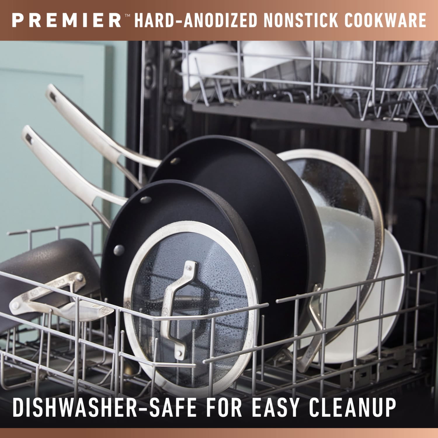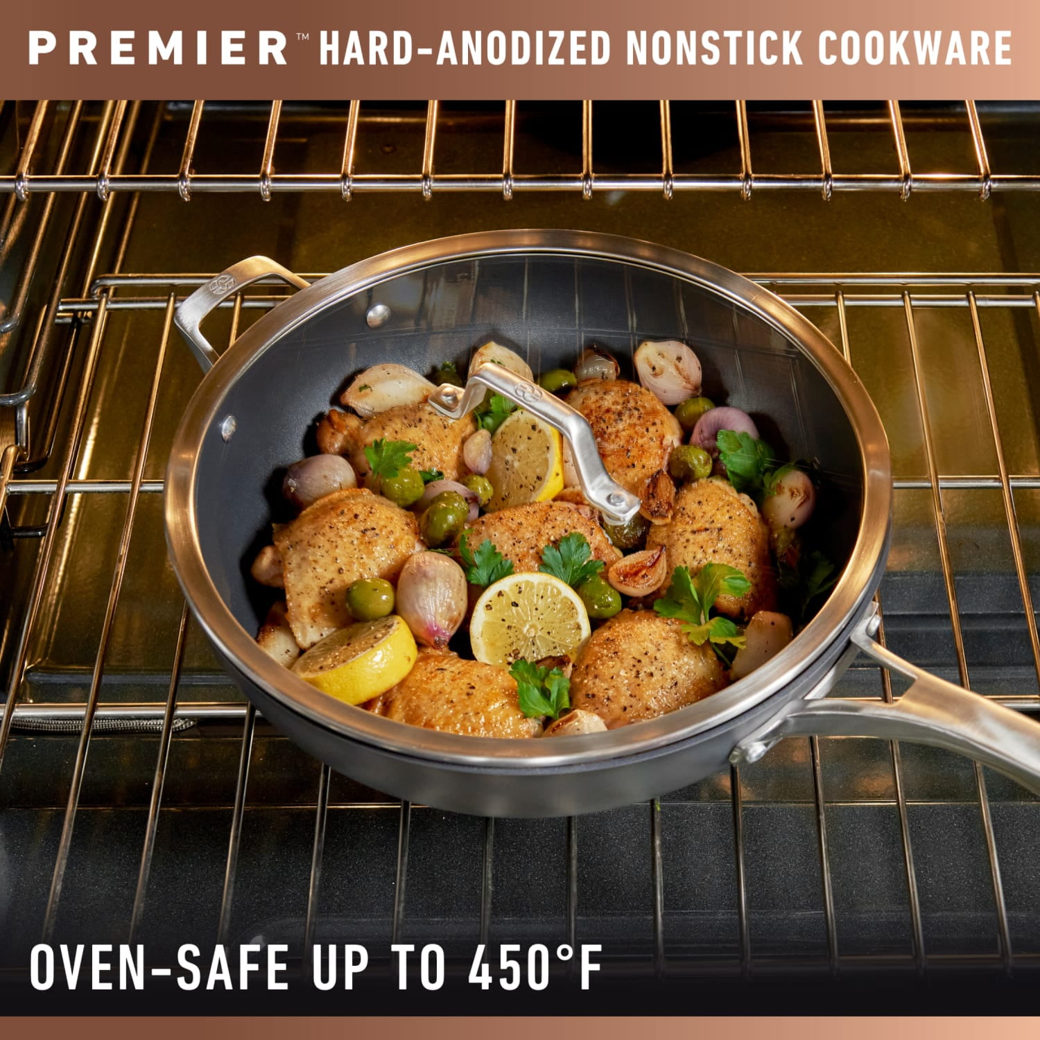 Featuring MineralShield nonstick technology, Calphalon Premier Hard-Anodized Nonstick Cookware is now 5x more durable than before when compared to the previous generation of Calphalon Classic. This nonstick skillet delivers superior long-lasting performance for effortless food release over and over again, so you can cook with confidence and serve even the most delicate food with ease. The 3-layer nonstick interior is made with some of the Earth’s hardest minerals to withstand metal utensils and everyday use and the hard-anodized exterior is dishwasher-safe for easy cleanup. Calphalon Premier Hard-Anodized Cookware is oven-safe up to 450 degrees F, so the nonstick pots and pans can go from the stovetop into the oven for heating and cooking versatility. Elevate your cooking experience with Calphalon Premier, and enjoy exceptional performance with endless possibilities.