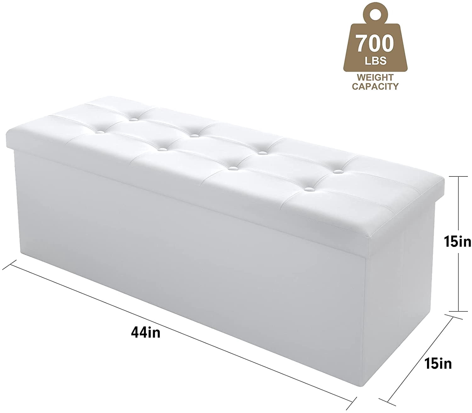 Sturdy and hold up to 700lbs: the collapsible folding storage ottoman bench size is 43″lx15″wx15″h.This rectangular foldable storage chest is made of thickened carb p2 mdf,and the storage chest holds up to 700lbs,the storage ottoman bench cube seats 2-3 adults easily,highly resilient foam padding ensures a comfortable sitting experience. Extra storage space: the large storage ottoman space makes it easy for to meet your various needs,you can put this collapsible storage ottoman bench at the end of your bed to store extra blankets and pillows,and you can also use it as a toy chest box storage the toys.The perfect space-saving storage makes your room tidier. Flip lid and collapsible: the foldable storage chest is collapsible design and it makes the storage ottoman easy for you to set up a comfort padded bench within seconds,the collapsible ottoman storage can be easily folded flat when not in use.You can place it in your bedroom,living room,hallway or utility room to organize books,clothes,blankets,pillows,toys and many other sundries. Premium material: this foldable storage ottoman is covered with premium faux leather, and the collapsible storage chest is super easy to wipe clean with damp cloth,button-tufted bench top with double stitching lines and sponge padding makes users seat comfortable. Multifunctional collapsible storage ottoman used as footstool,shoe bench,bed stool, toy chest, coffee table, puppy step, etc.,And perfectly matches your room. Quality service : we offers premium products for you while exceeding highest industry standards and offering impeccable customer care.