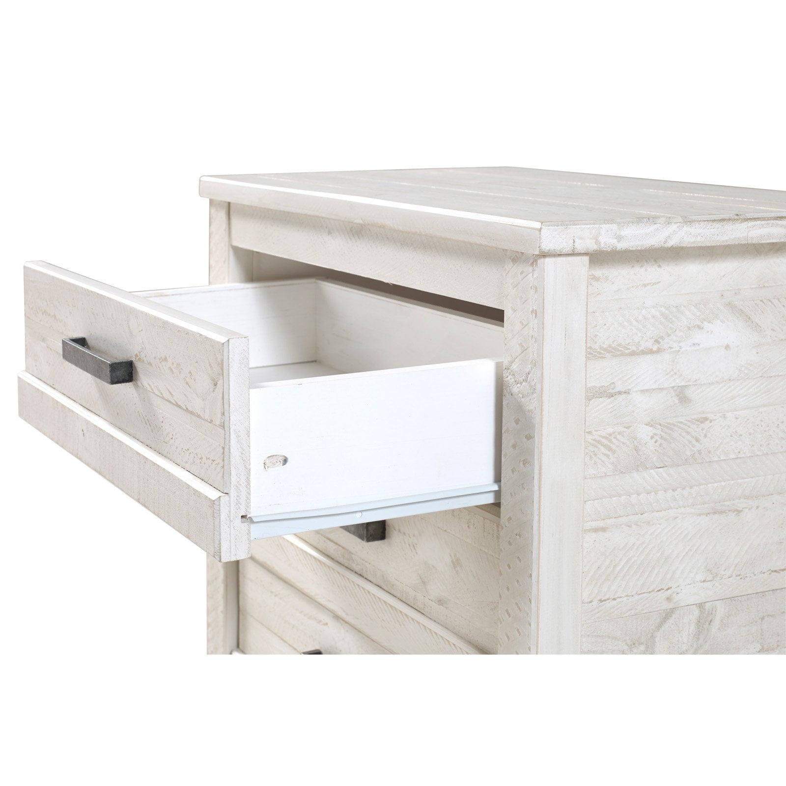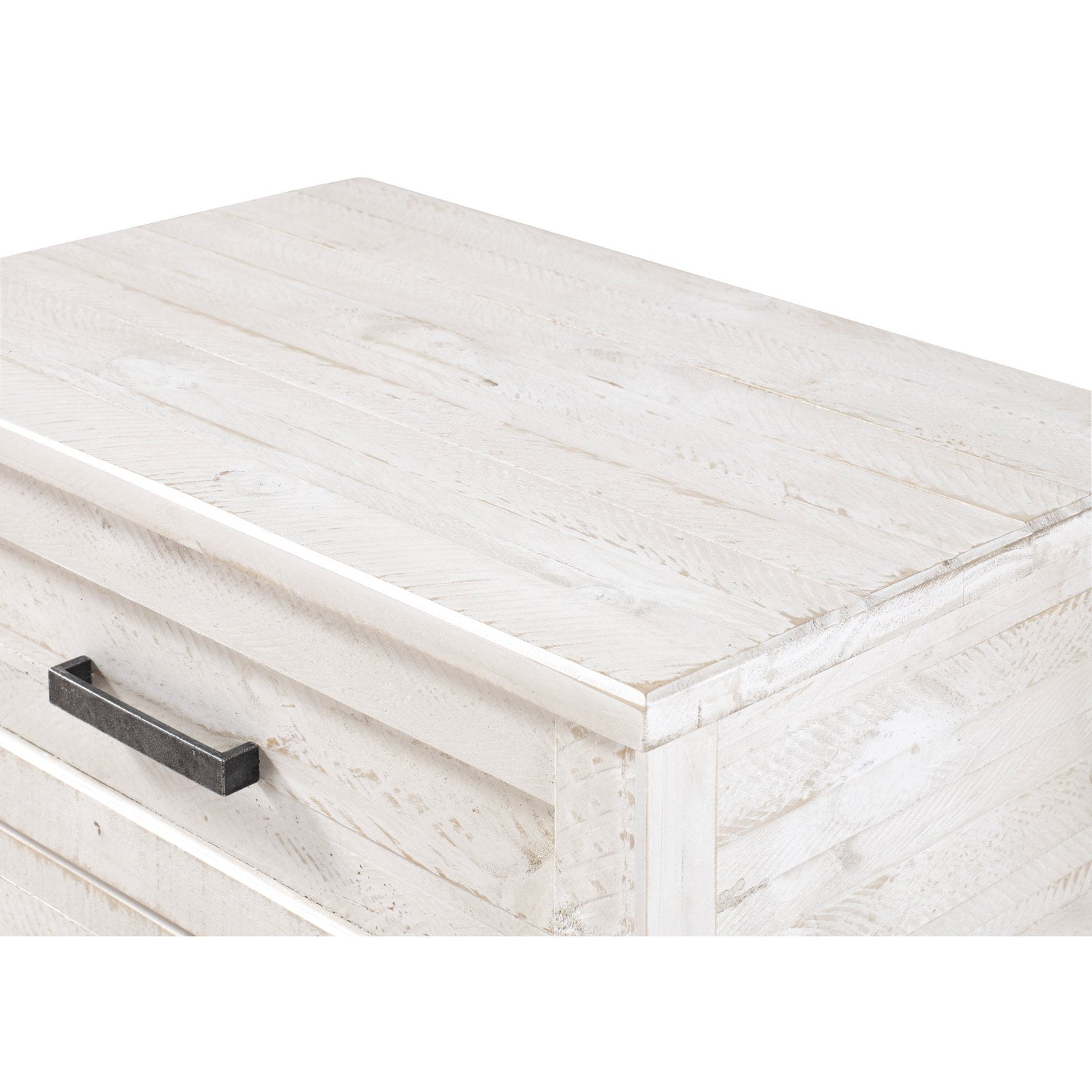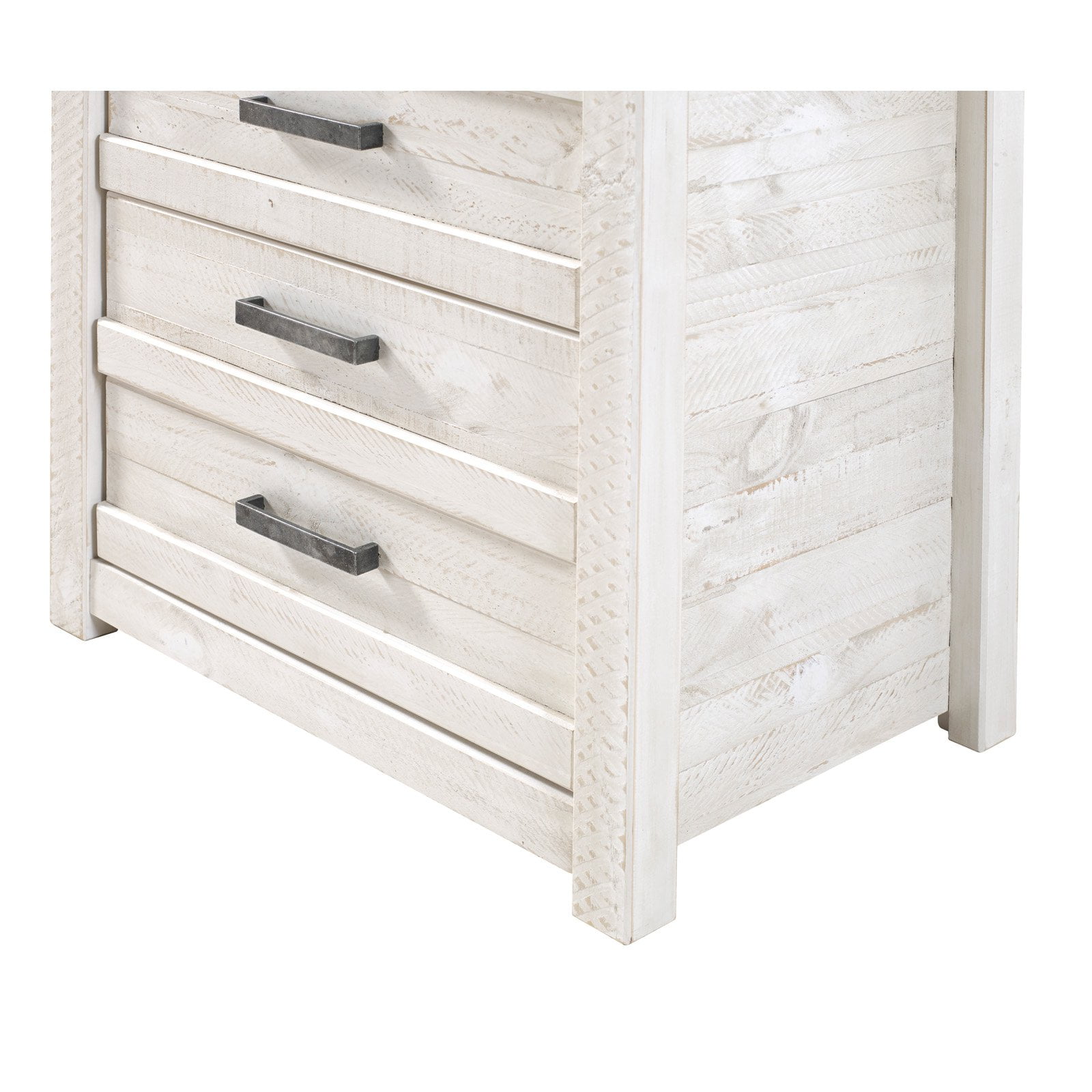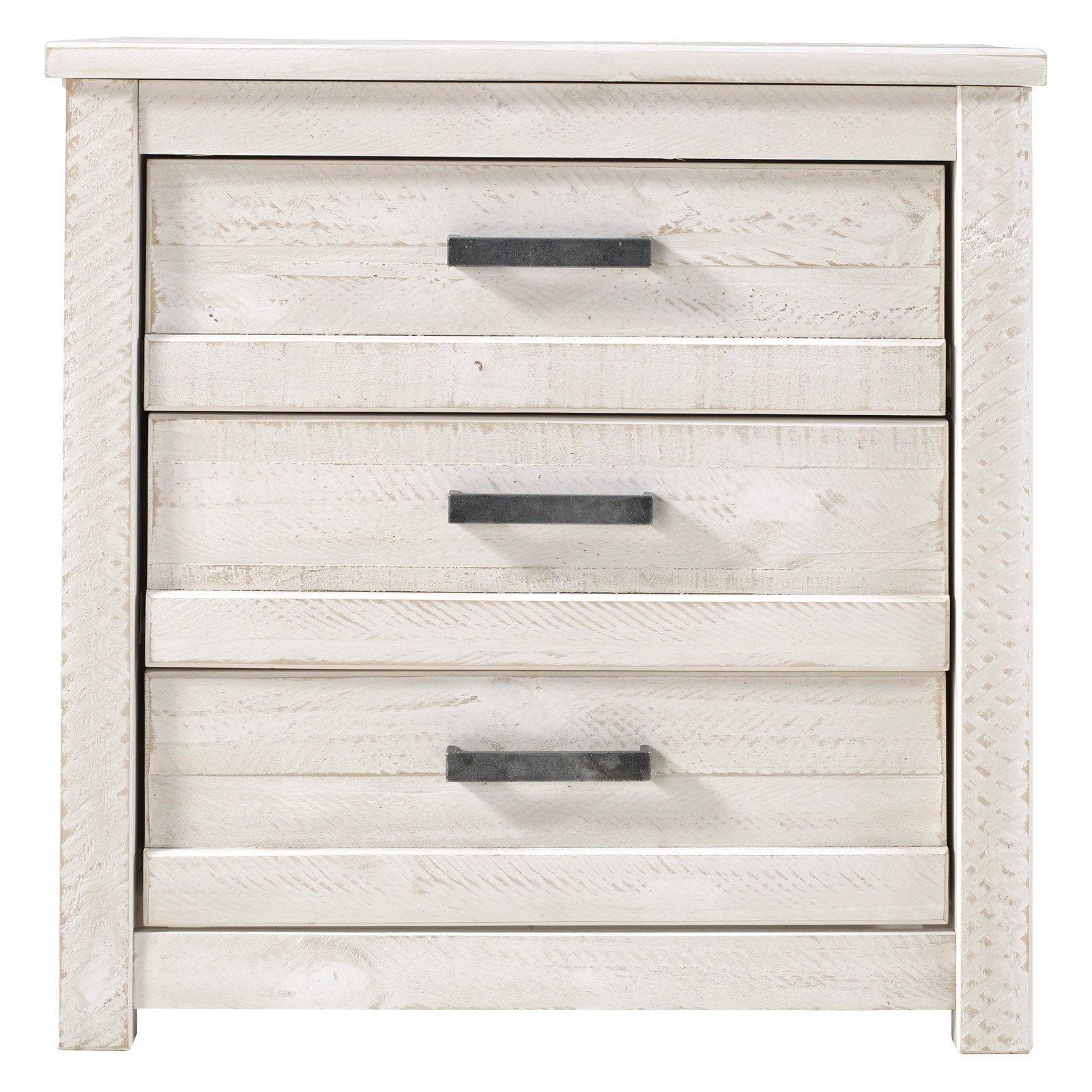 Antique white wooden rustic night stand Durable solid hewn pine planks with exposed pits and natural knots Features 3 drawers for various storage needs Metal roller glides enable smooth and effortless motion Construction materials are sustainably sourced