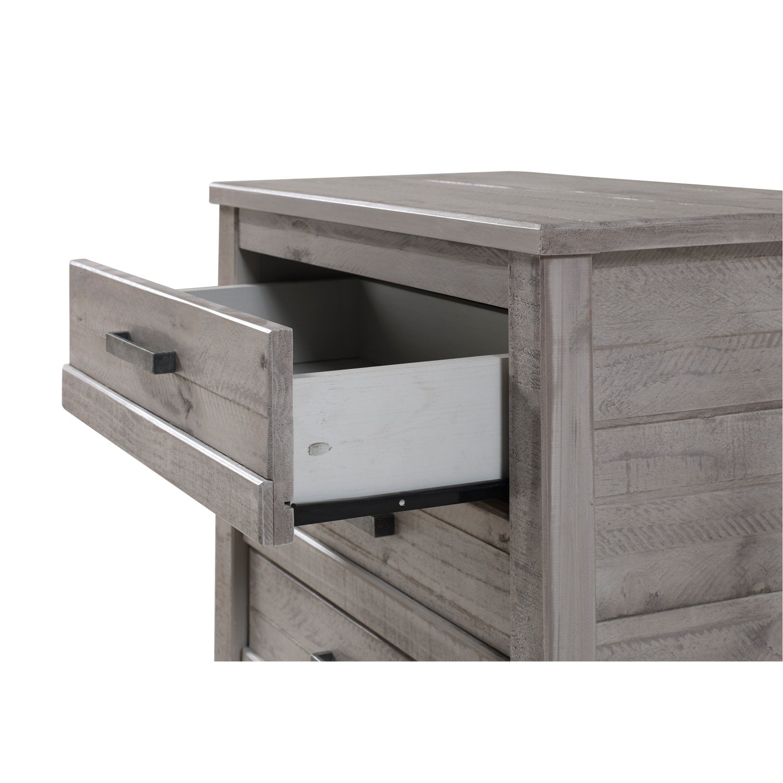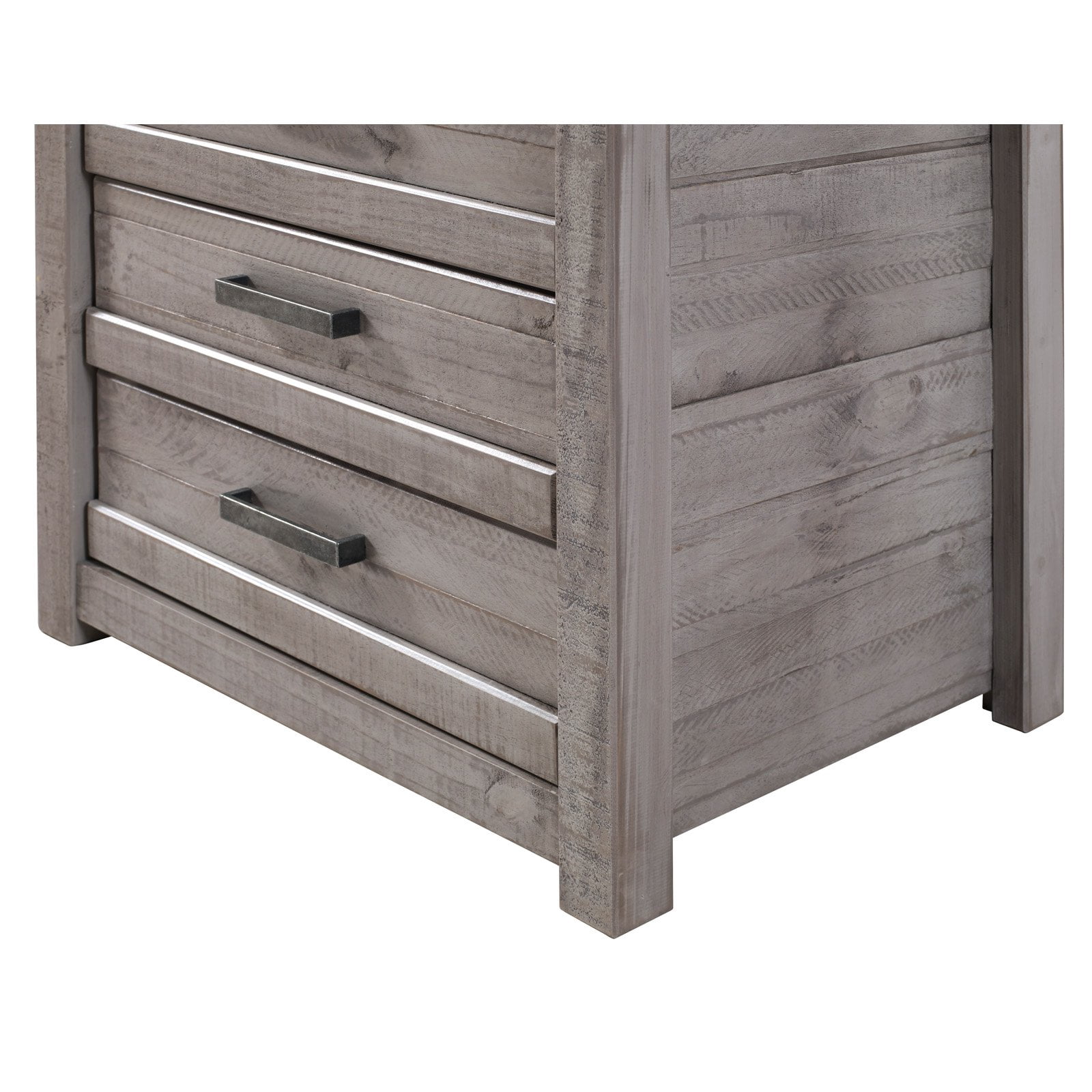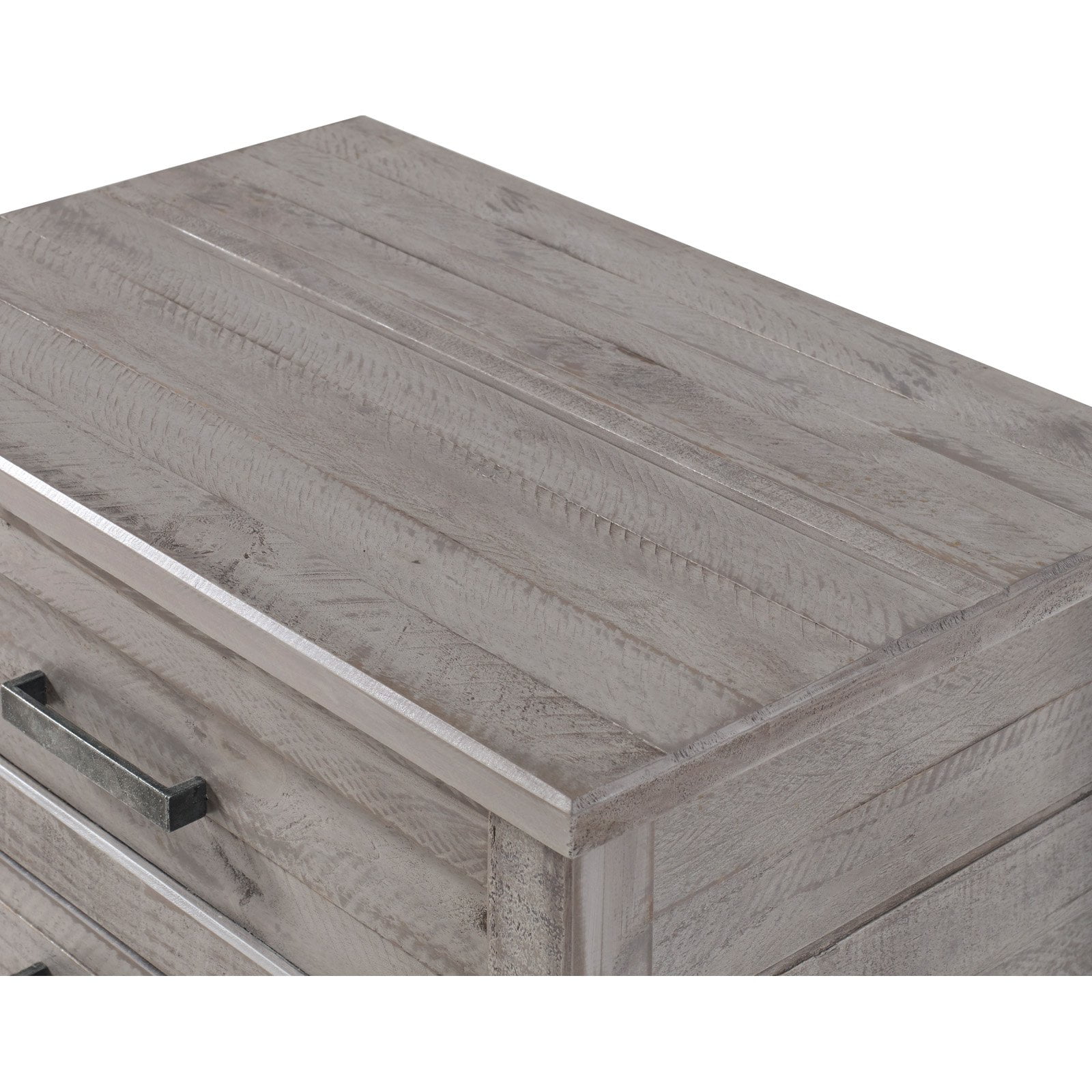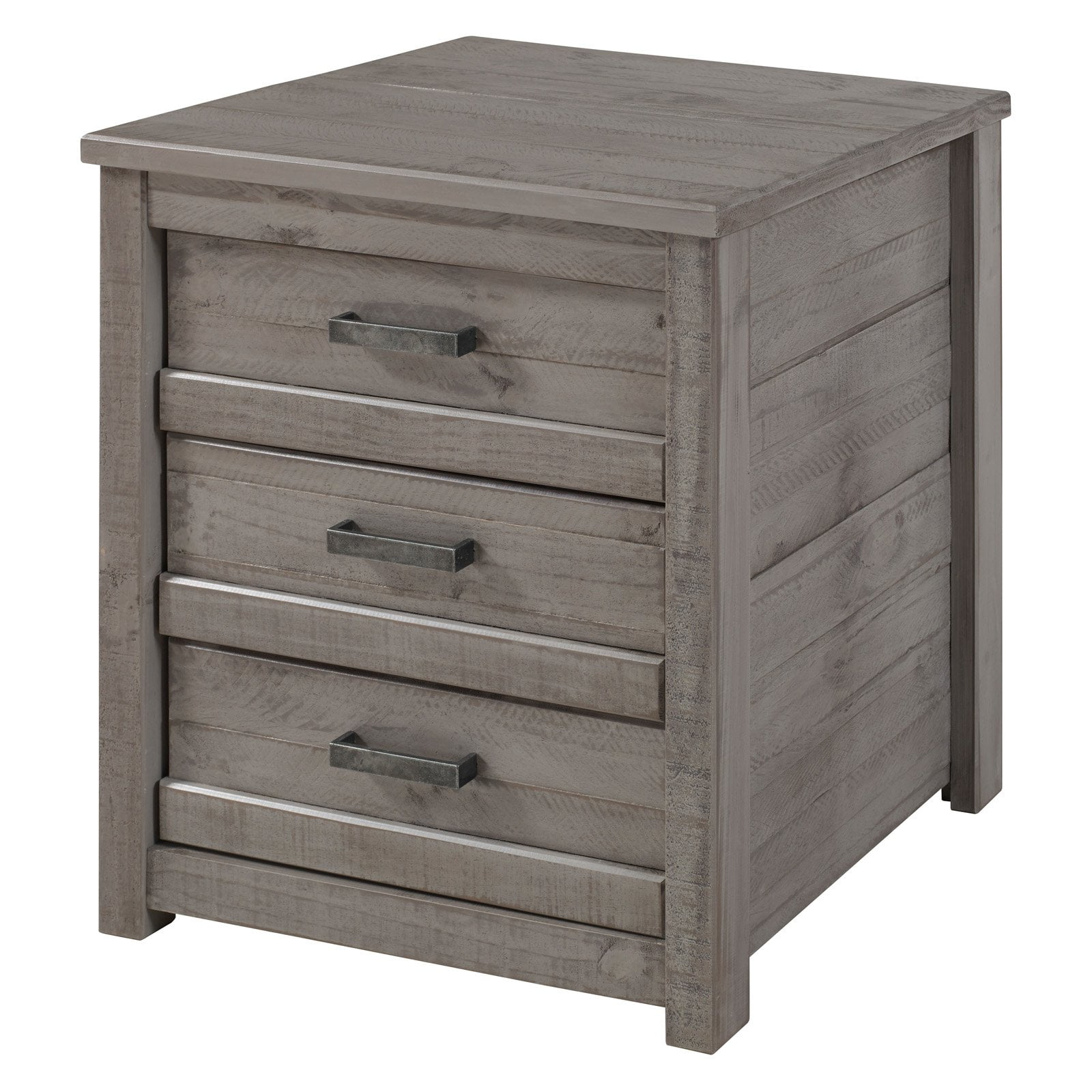 Antique white wooden rustic night stand Durable solid hewn pine planks with exposed pits and natural knots Features 3 drawers for various storage needs Metal roller glides enable smooth and effortless motion Construction materials are sustainably sourced