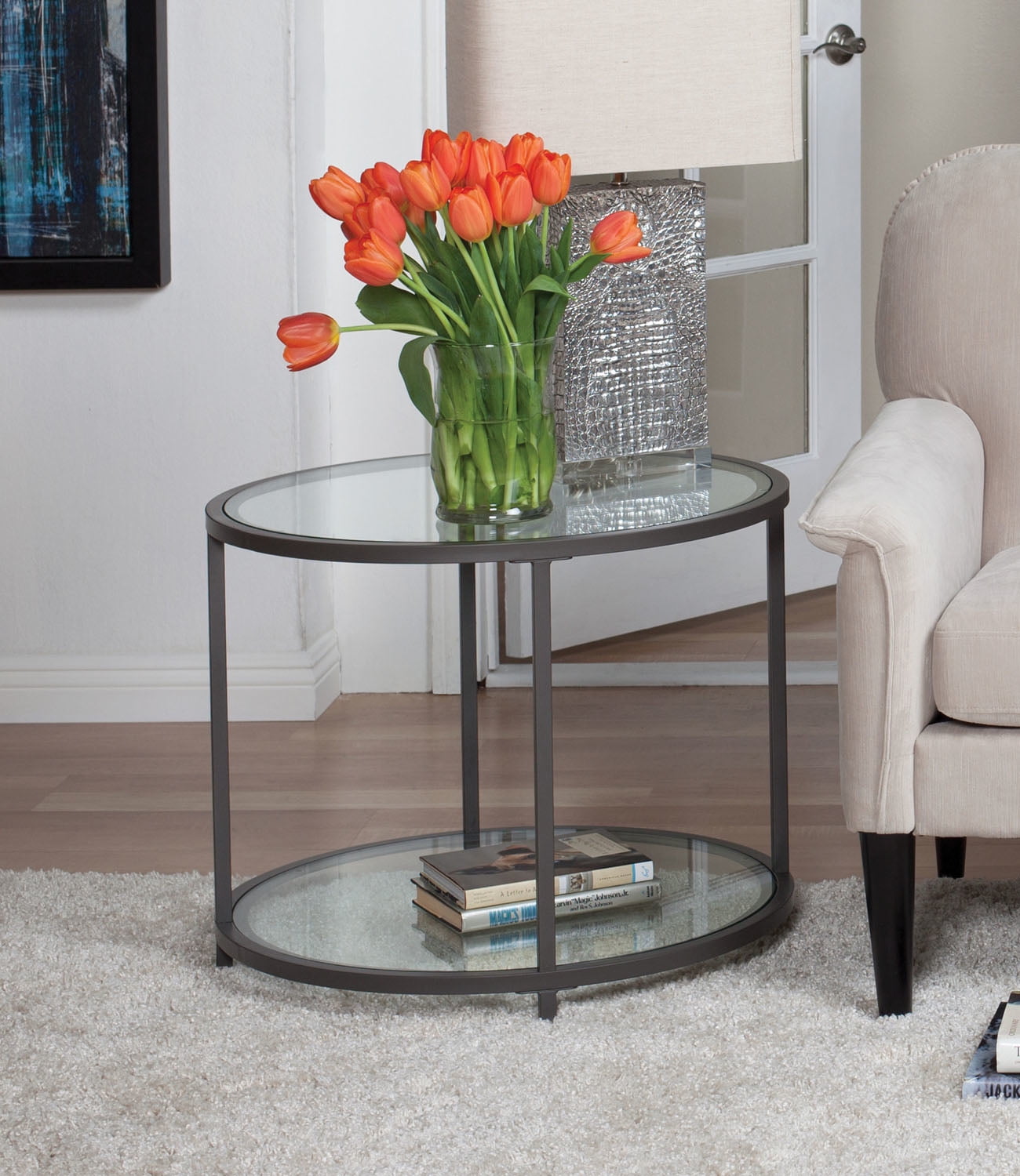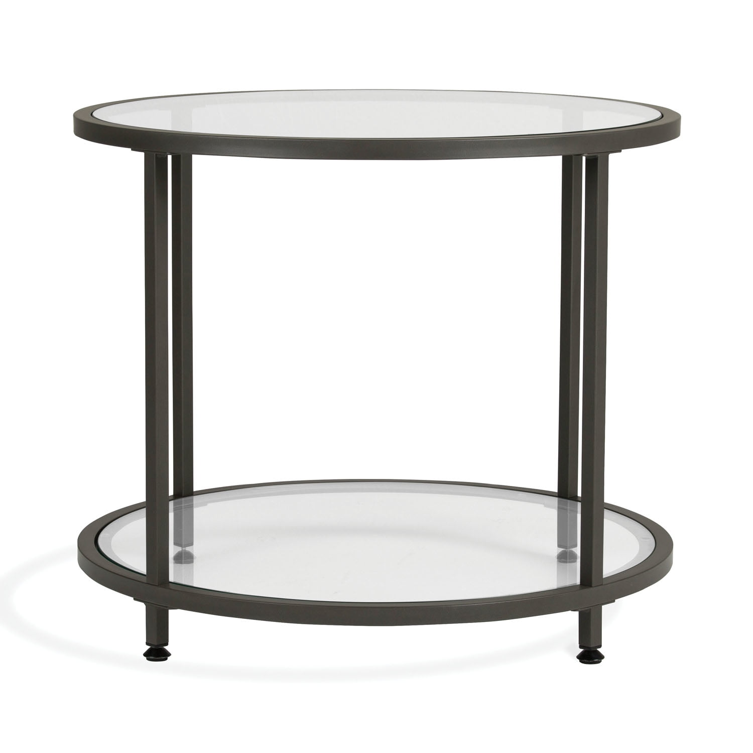 Studio Designs Home Camber Modern Round Glass End Table, Pewter Gray Features Style: Modern/Contemporary Color/Finish: Pewter Gray Powder Coated Steel Frame for Durability Tempered Glass for Safety Four Floor Levelers for Stability Product Specifications Overall Dimensions: 26″ W x 26″ D x 22″ H Shelf Clearance: 17.75″ Tempered Glass Thickness: 8mm Weight Capacity: 20 lbs. ea. shelf Materials: Metal, Glass 10 year warranty