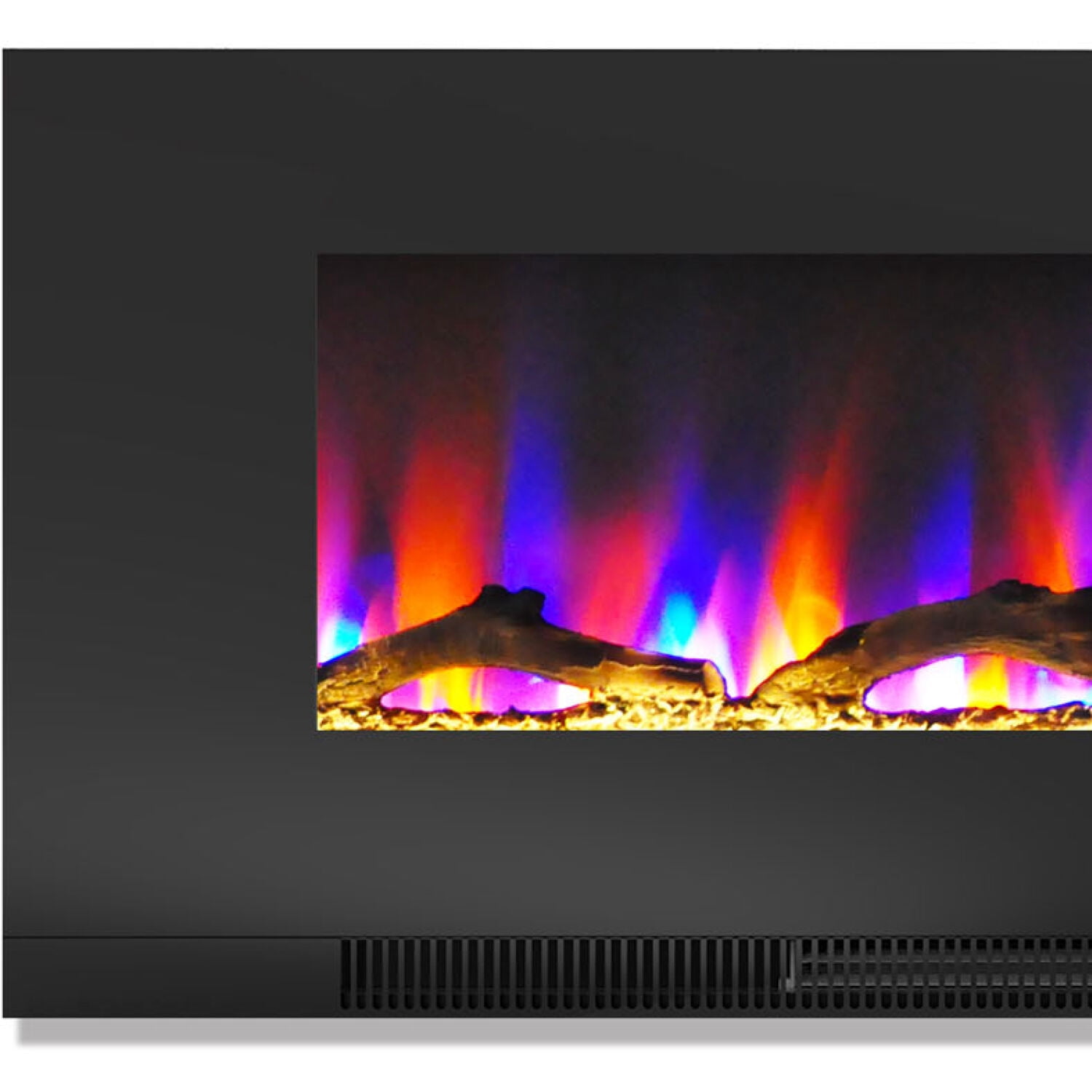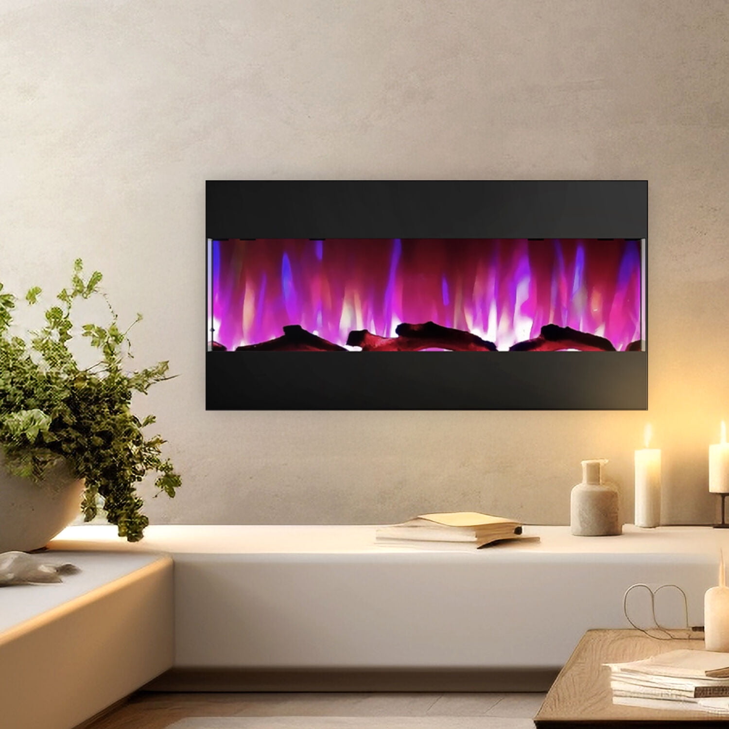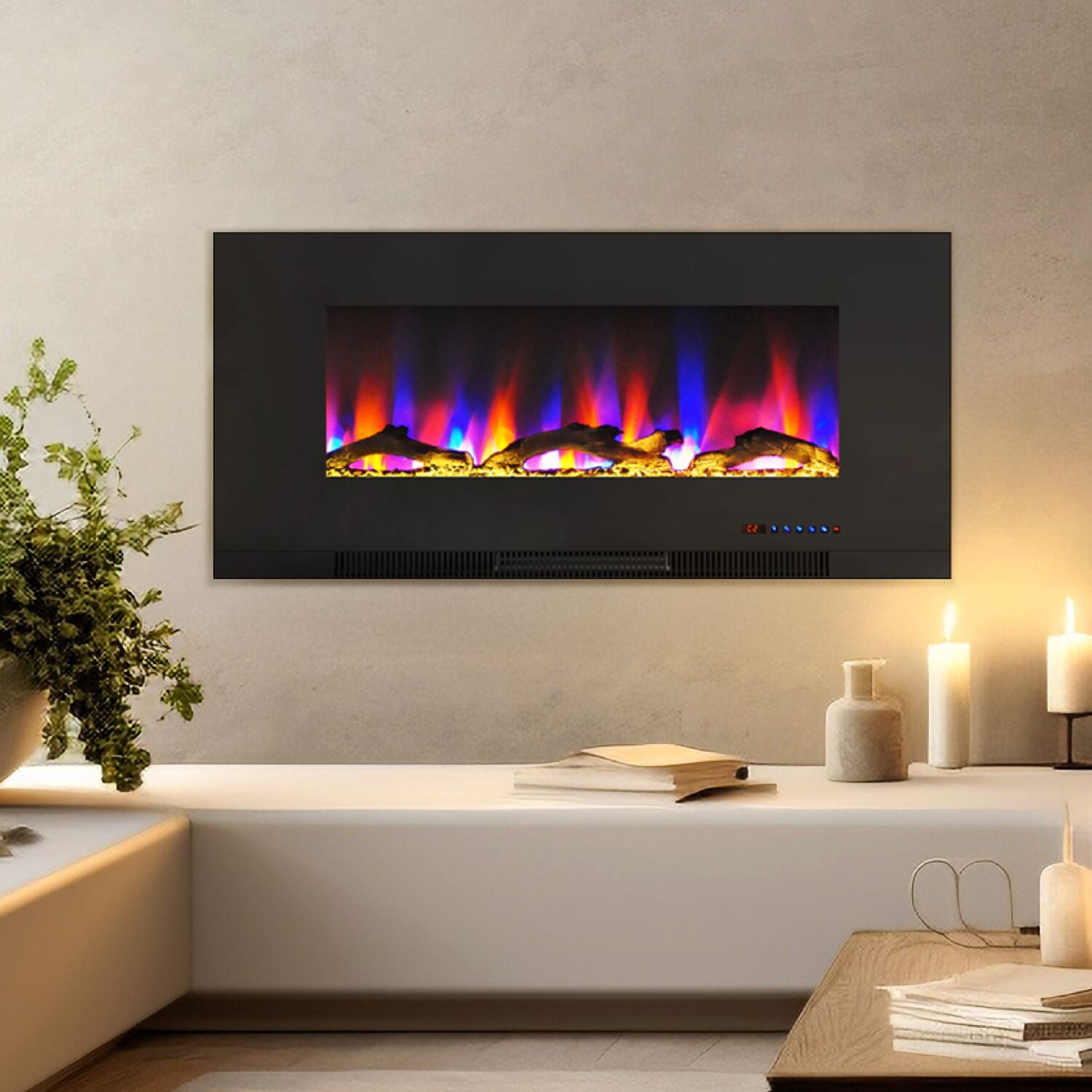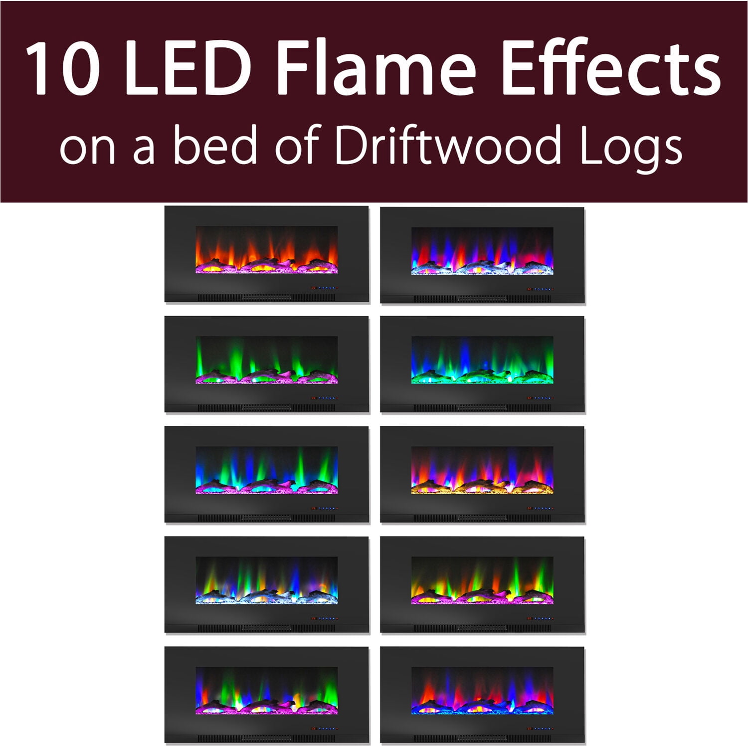 42-inch electric fireplace heater for wall mounting Driftwood log display behind smooth tempered glass surrounded by a sleek black frame Choose from 10 different LED flame colors and 10 different LED fire bed colors Fan-forced air heater warms an indoor space up to 210 square feet Flames operate with and without heat for year-round enjoyment 2 heat settings (700W on low /1300W on high) 9-hour on/off timer Built-in automatic thermal safety switch for overheating protection Adjust all settings from across the room with the remote control