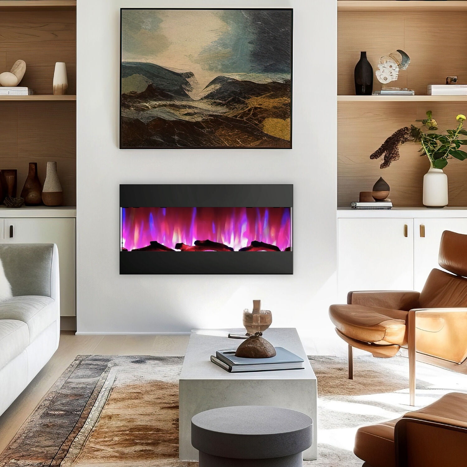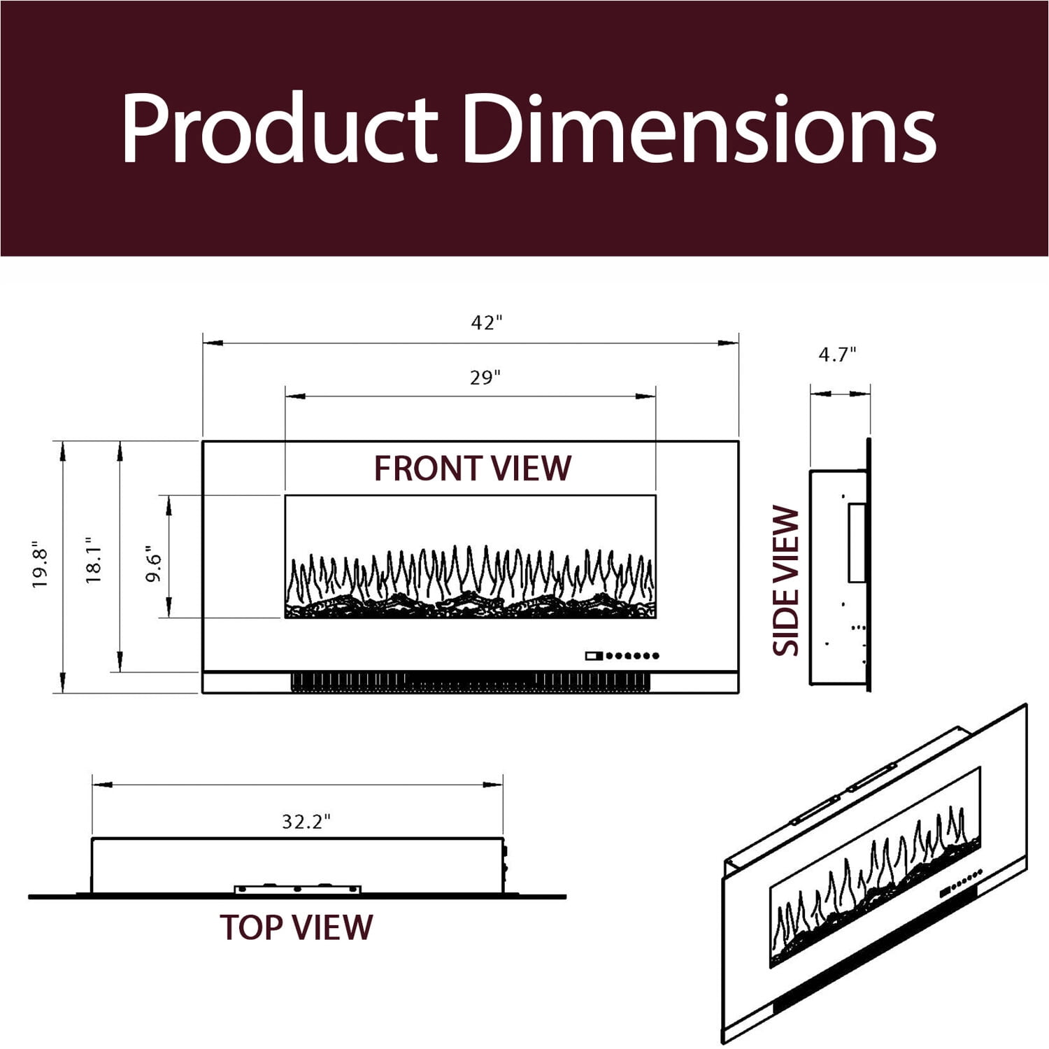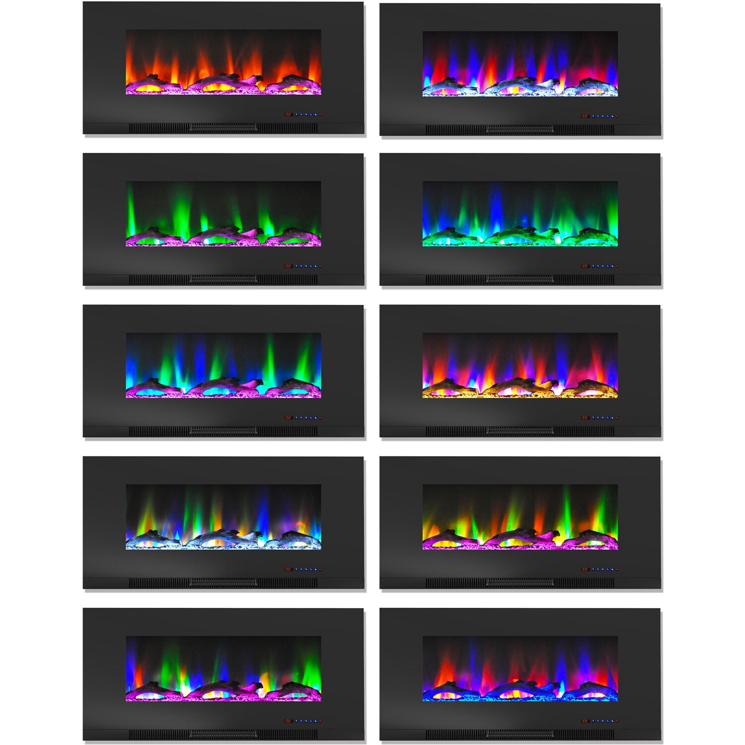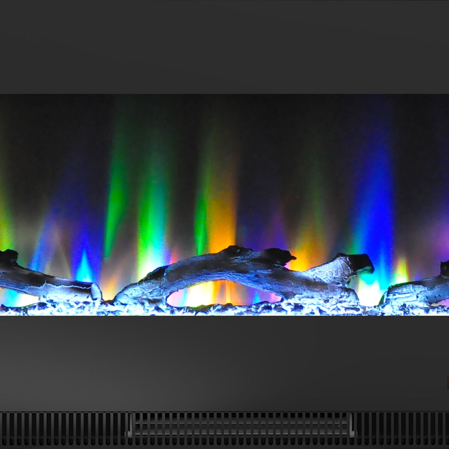 42-inch electric fireplace heater for wall mounting Driftwood log display behind smooth tempered glass surrounded by a sleek black frame Choose from 10 different LED flame colors and 10 different LED fire bed colors Fan-forced air heater warms an indoor space up to 210 square feet Flames operate with and without heat for year-round enjoyment 2 heat settings (700W on low /1300W on high) 9-hour on/off timer Built-in automatic thermal safety switch for overheating protection Adjust all settings from across the room with the remote control