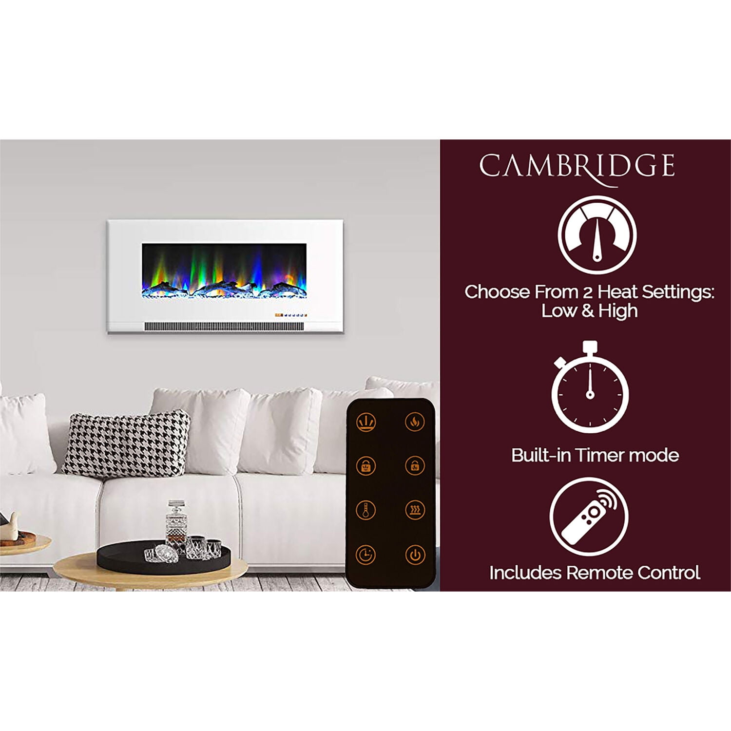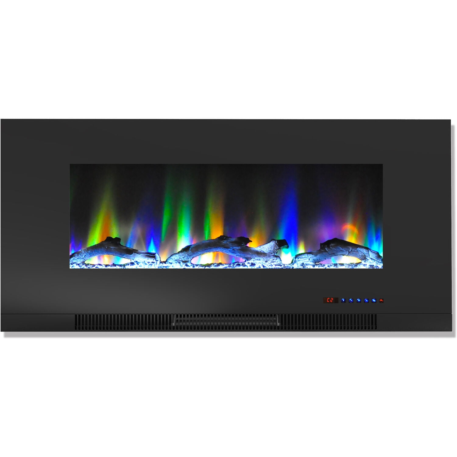 Treat yourself to cozy evenings by the fire with a 42-inch color-changing wall fireplace by Cambridge. Featuring a stunning array of flame colors and effects that flicker and glow across a bed of driftwood logs, you can customize a beautiful fire to suit your mood. Whether you’re feeling classic orange, ultraviolet, or a mix of colors, our unique color spectrum is sure to please. Designed for wall mounting to maximize floor space, you can easily install this electric fireplace heater in your living room, family room, bedroom, or home office. Heated fan-forced air efficiently warms an indoor space up to 210 square feet with 2 heat settings, a 9-hour on/off timer, and built-in overheat protection for your safety and peace of mind. The enchanting LED flames operate with or without heat, providing year-round enjoyment whenever you desire. With an electric wall fireplace by Cambridge, you’ll rest and relax in true fireside bliss without the smoke and mess of a traditional fireplace.