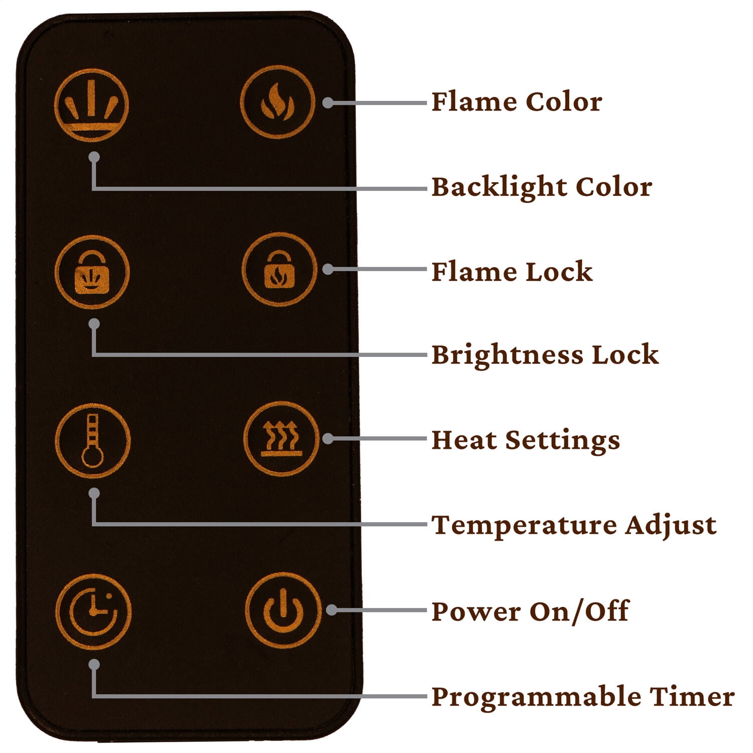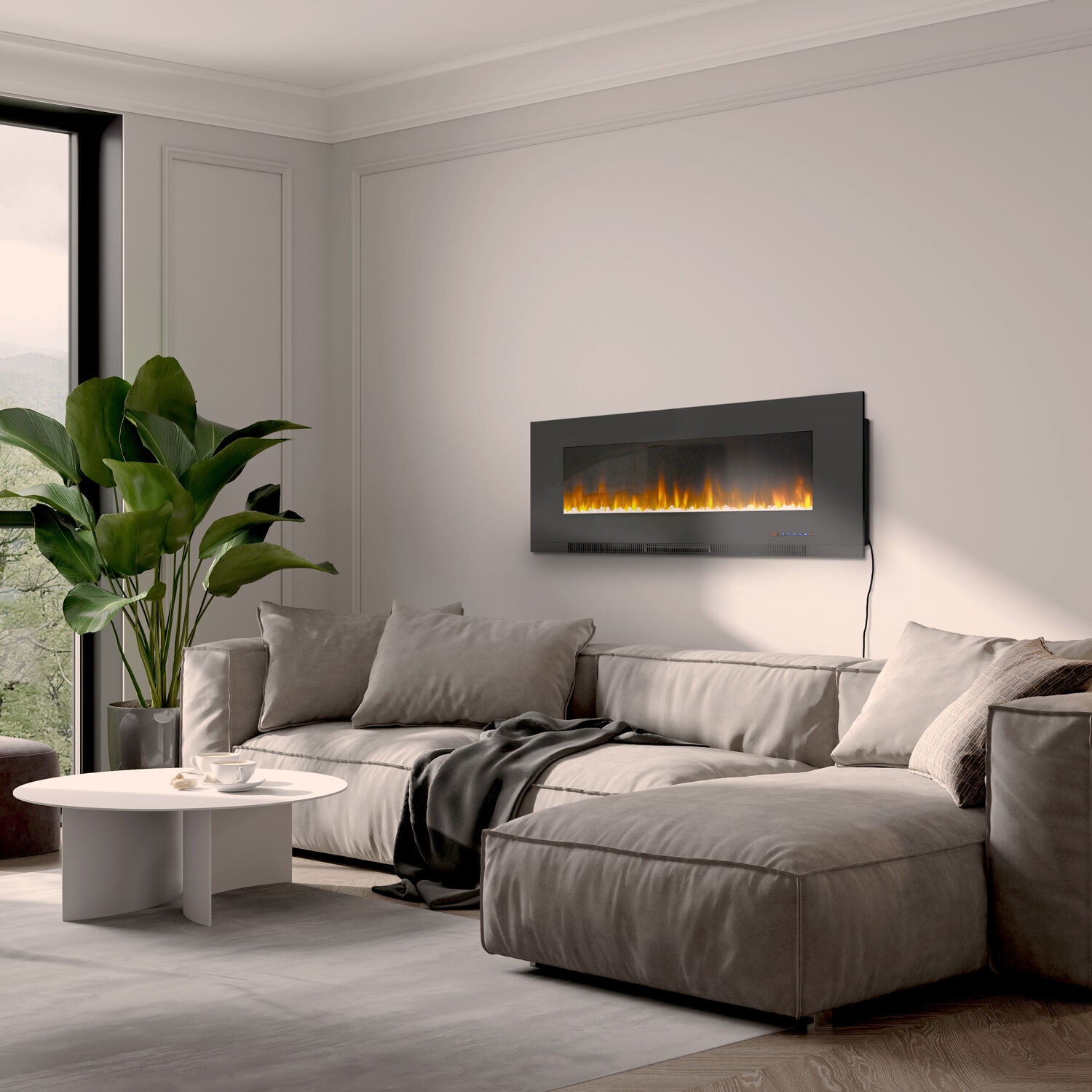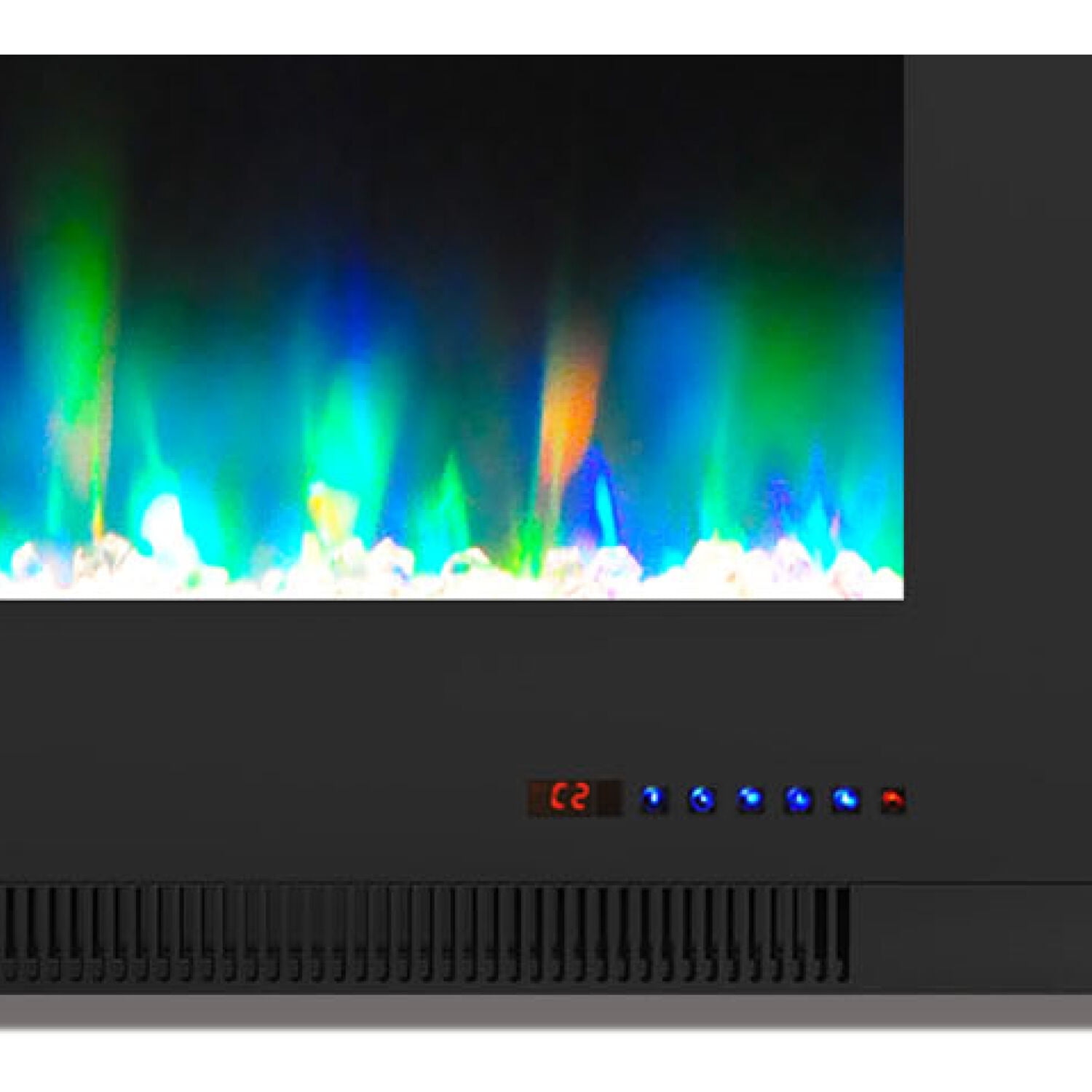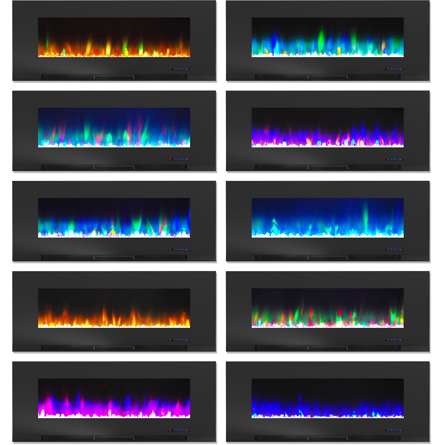 50-inch electric fireplace heater for wall mounting Crystal rock display behind smooth tempered glass surrounded by a modern white frame Choose from 10 different LED flame colors and 10 different LED fire bed colors Fan-forced air heater warms an indoor space up to 210 square feet Flames operate with and without heat for year-round enjoyment 2 heat settings (700W on low /1300W on high) 9-hour on/off timer Built-in automatic thermal safety switch for overheating protection Adjust all settings from across the room with the remote control
