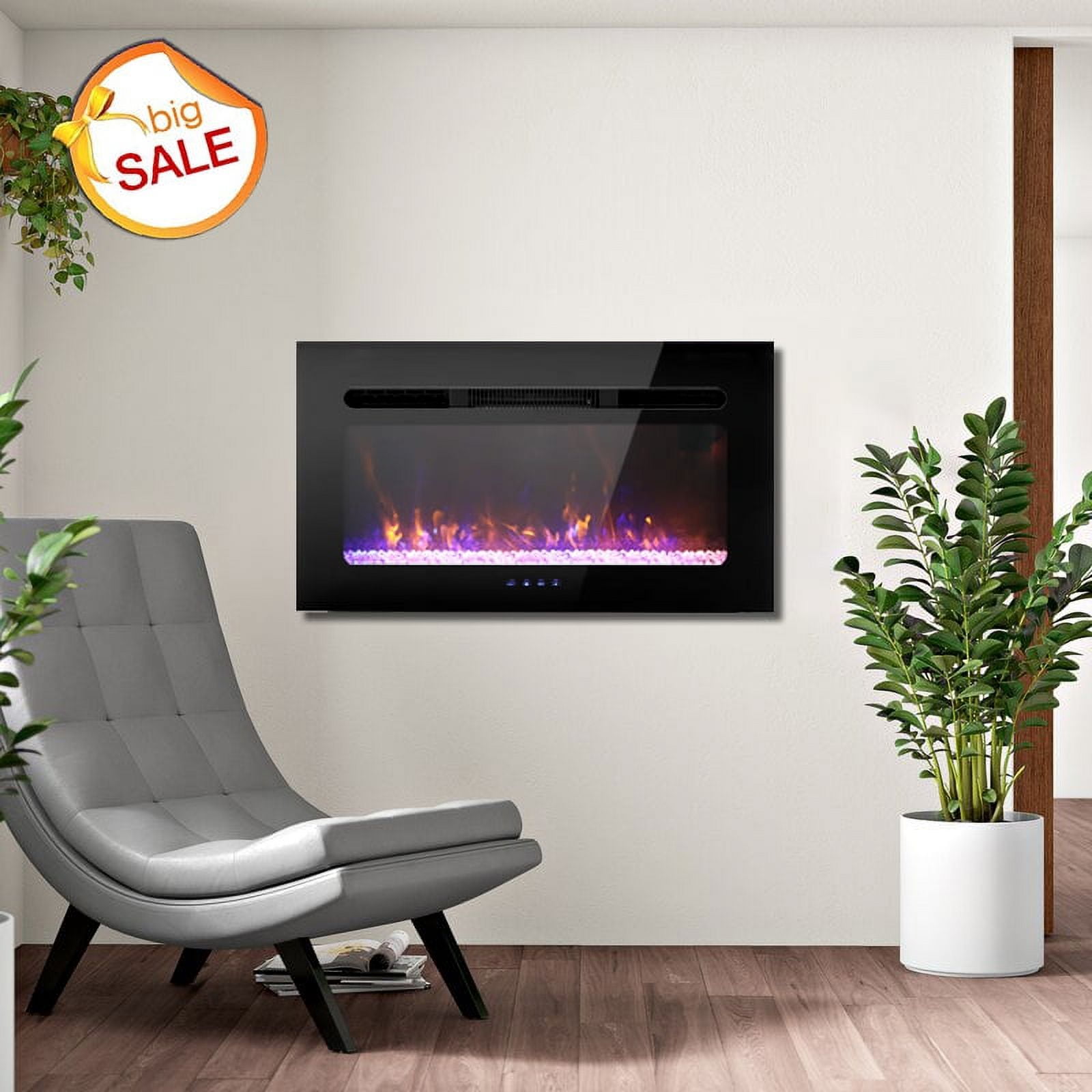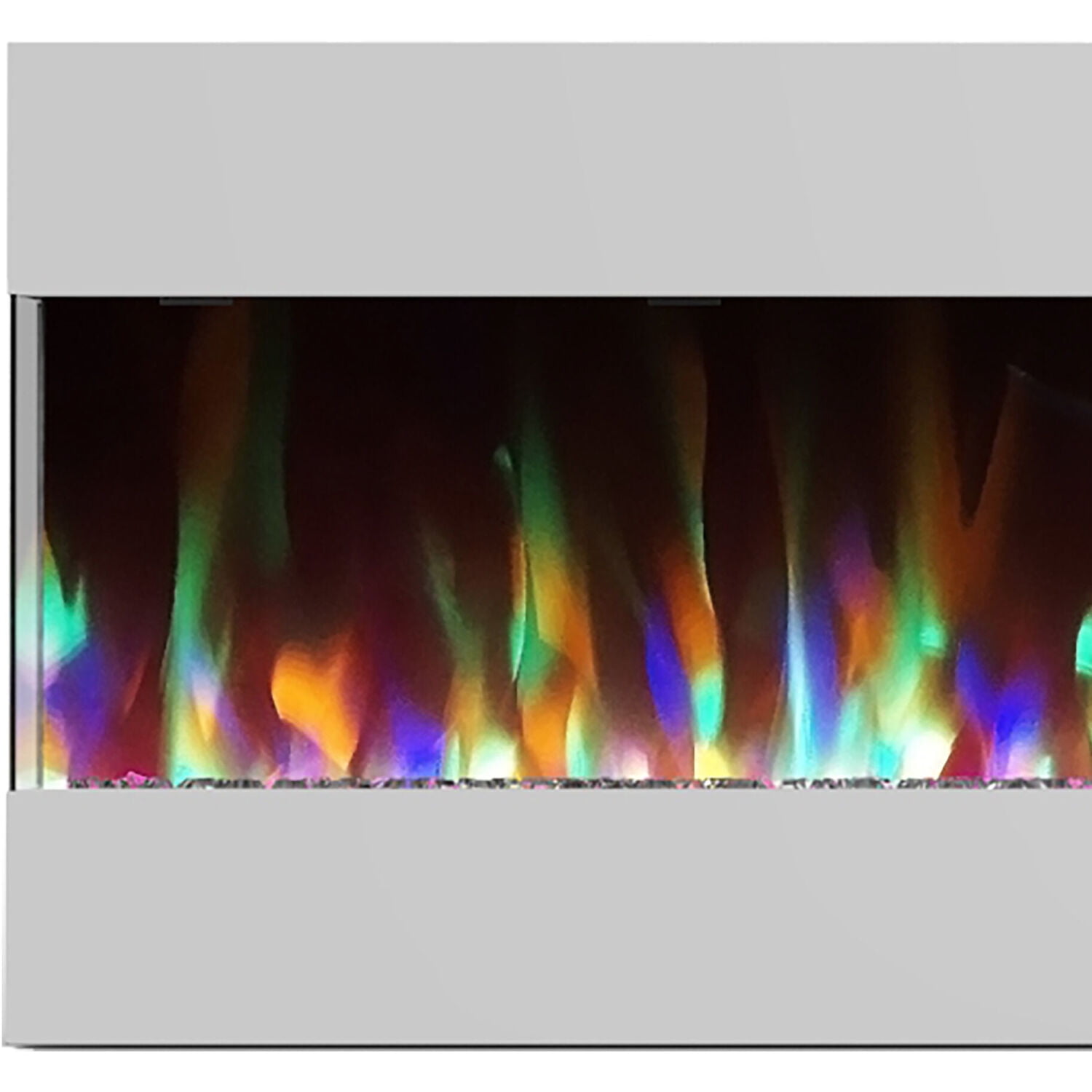 50-in. recessed wall mounted electric fireplace 10 Multicolor LED flame options over a bed of crystal rocks 5118 BTU heat performance Heat covers 216-sq. ft. Includes display controls on unit and remote control for convenience in adjusting temperature or settings Built in timer Flames can be operated with or without heat Can be wall mounted or built into the wall and easy to install Get the realistic flame effect without the hassle and maintenance of a real fireplace