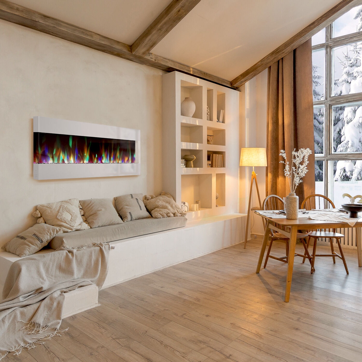 Enjoy the perfect ambience for your home with Cambridge’s recessed, wall mounted electric fireplace. Our modern and sleek design is perfect for any home and offers an LED color changing display to fit seamlessly into your home’s aesthetic. Whether you’re feeling classic orange, bright green, ultraviolet, or all the colors at once, our unique color spectrum is sure to please. The flames can operate with or without heat, which makes it perfect for warmer seasons and year-round use. A convenient remote control is included so you can easily adjust the settings from anywhere in the room. Designed for wall mounting to maximize floor space, you can easily install this electric fireplace heater in your living room, family room, bedroom, or home office. Our fireplace is easy to install and comes with the option to be wall mounted or built into the wall. Simply turn it on and relish true fireside bliss without the smoke and mess of a traditional fireplace.