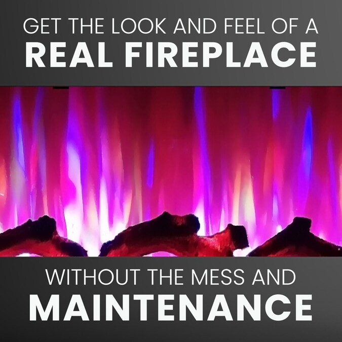 • Enjoy the driftwood logs display and sleek black frame of the wall-mounted fireplace