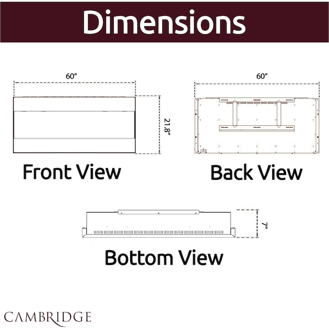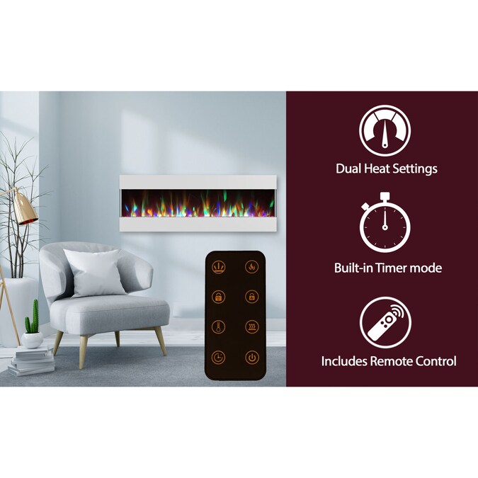 Enjoy the perfect ambiance for your home with Cambridge’s recessed, wall mounted electric fireplace. Our modern and sleek design is perfect for any home and offers a LED color changing display to fit seamlessly into your home’s aesthetic. The flames can operate with or without heat, which makes it perfect for warmer seasons and year-round use. A convenient remote control is included so you can easily adjust the settings from anywhere in the room. Our fireplace is easy to install and comes with the options to be wall mounted or built into the wall. No more hassle of a real fireplace with our Cambridge Electric Fireplace. Get the realistic flame effect of a real fireplace without all the maintenance.