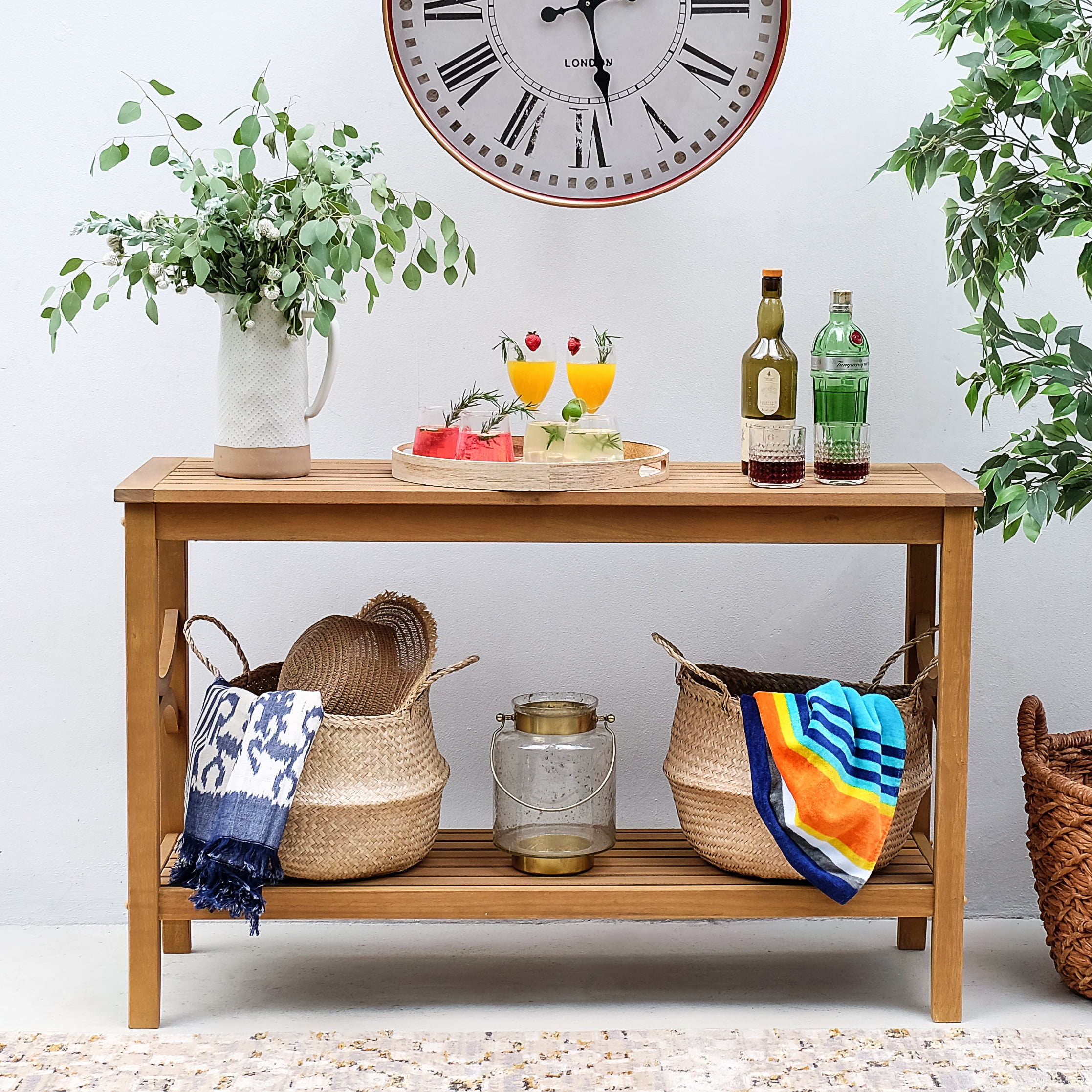 HIGH QUALITY: Made of great quality solid teak wood that famous for its durability against outdoor elements SLENDER YET SPACIOUS: Designed to save space, this narrow console table is perfect for small rooms and tight spaces. With double shelves, it provides plenty of storage for your items. NATURAL COLOR: Natural unfinished for the frame, showing off the beauty of teak that can blend well in any patio ensemble STURDY CONSTRUCTION: The mortise and tenon construction make sure your furniture parts are attached properly VERSATILE AND STYLISH DESIGN: The versatile and stylish design brings an element of simplicity and class to your outdoor area. MULTIPLE FUNCTIONS: Can be a nice decor or a great serving table. OVERALL DIMENSION: 47.25 in. L x 15.5 in. W x 30 in. H WEIGHT CAPACITY: Able to hold up to 250 lbs EASY & QUICK ASSEMBLY: Clear and simple instruction with step by step assembly guidelines is provided in the box (Assembly Instruction)