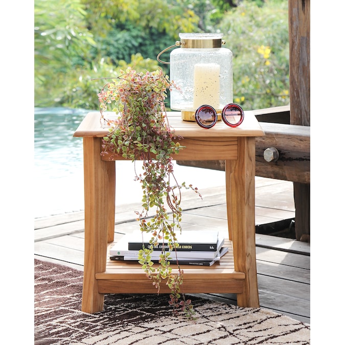 - Natural teak wood pattern and warm color of this patio end table bring a warm and relaxing ambiance to your garden, backyard, porch, deck, balcony, gazebo, pergola, and poolside area