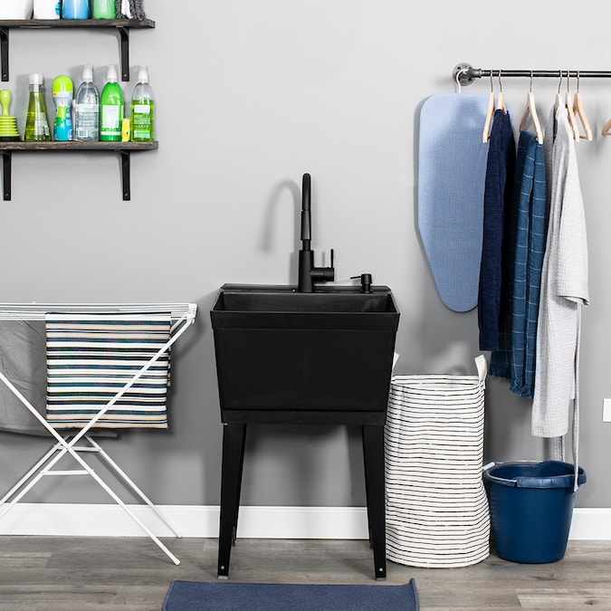 This classic utility sink in black is beautifully paired with a quality matte black, high-arc faucet, matching soap dispenser and legs. This 6507 series laundry tub set comes complete with tub, high-arc pull-down faucet with integrated supply lines, soap dispenser, legs, rubber stopper, p-trap, floor levelers, hardware, and installation instructions. The stylish pull-down faucet features a two-function spray or stream option while offering plenty of room for cleaning buckets and other tall items. Our tub is constructed of high-quality durable thermoplastic and features a stain-resistant wipe clean surface. Sturdy rust-proof metal legs attach easily, and the included floor levelers increase stability on uneven surfaces. One-year limited warranty.