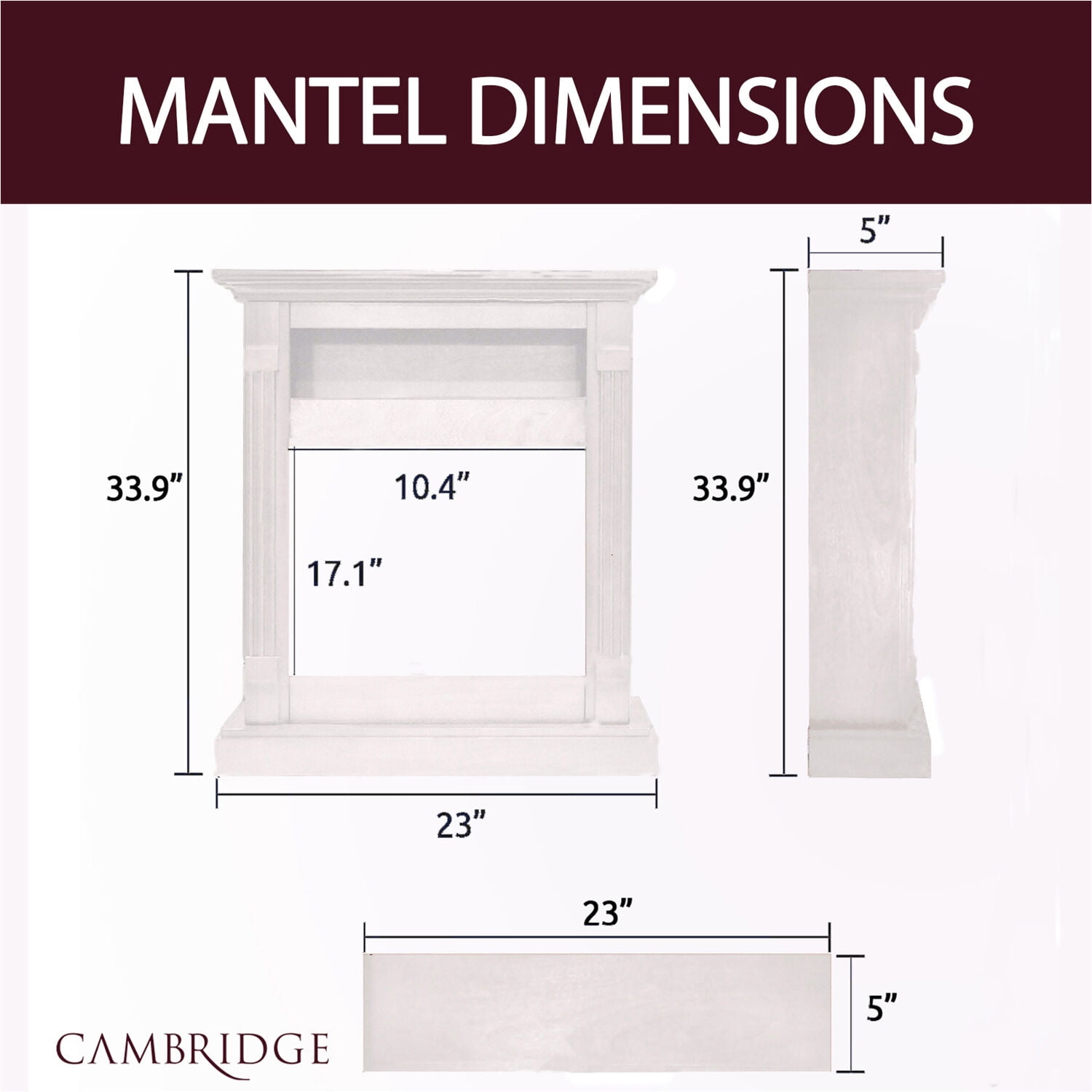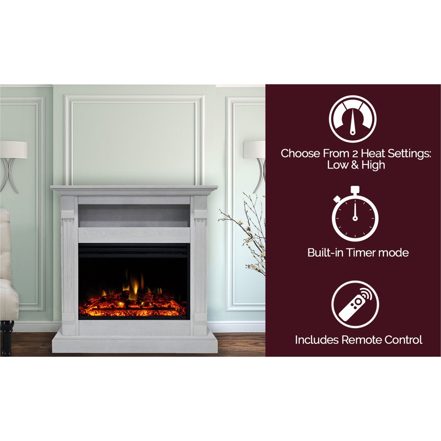 TRADITIONAL DESIGN: Warm up any room with the Cambridge Sienna electric fireplace. The fireplace is surrounded by a beautiful mantel, designed with crown molding. This structure includes an enhanced deep realistic log fireplace insert and a mantel with a convenient AV storage shelf with convenient “invisible” cord cutout, which is perfect for storing sound bars or cables boxes. Create a warm and cozy atmosphere by installing one in your home! HEAT SETTINGS & ENERGY SAVINGS: The fireplaces heat covers 210 SQFT and can even be operated with or without heat. The unit features dual heat settings for different rooms and seasons which can be adjusted accordingly for both warmth and energy saving purposes. KEY FEATURES: The beautiful fireplace includes display controls on unit, a built-in timer and remote control for convenience in adjusting the temperature or settings from across the room. Enhanced deep log insert has 5 different LED color changing options to choose from. Additionally, the fireplace mantel comes in 6 different colors (Cherry, Teak, Mahogany, White, Slate Blue, and Walnut), so it can pair perfectly with any room you wish to put it in! MAINTENANCE FREE: This indoor fireplace insert adds the look and feel of a real fire display without all the maintenance or dangers of a real open flame. Just install and enjoy your new cozy space! DIMENSIONS: Overall Dimensions: 37″H x 33.9 W x 10.4″D, Insert Dimensions: 17.6″H x 24.4″W x 7″D, Shelf Dimensions: 5.3″H x 23.2″W x 8.7″D Sienna 34 in. electric fireplace heater with enhanced log display, multi-color flames, and white mantel Freestanding fireplace heater quickly warms a 210 sq. ft. room 1500W electric fireplace insert features a realistic log display without the mess and hassle of a real fireplace Sturdy MDF frame features an extended mantel top, crown molding, and fluted pilasters Dual heat settings and a 9-hour timer Flames can be set to function with or without heat – perfect for year-round use A convenient remote control is included to adjust settings from across the room Automatic thermal safety switch for overheating protection Quick and easy assembly Mantel also available in Cherry, Black, Gray, Mahogany, Teak, and Walnut color options Assembled dimensions: 10.4″D x 33.9″W x 37″H Remote control requires 2 AAA batteries (not included) CSA certified