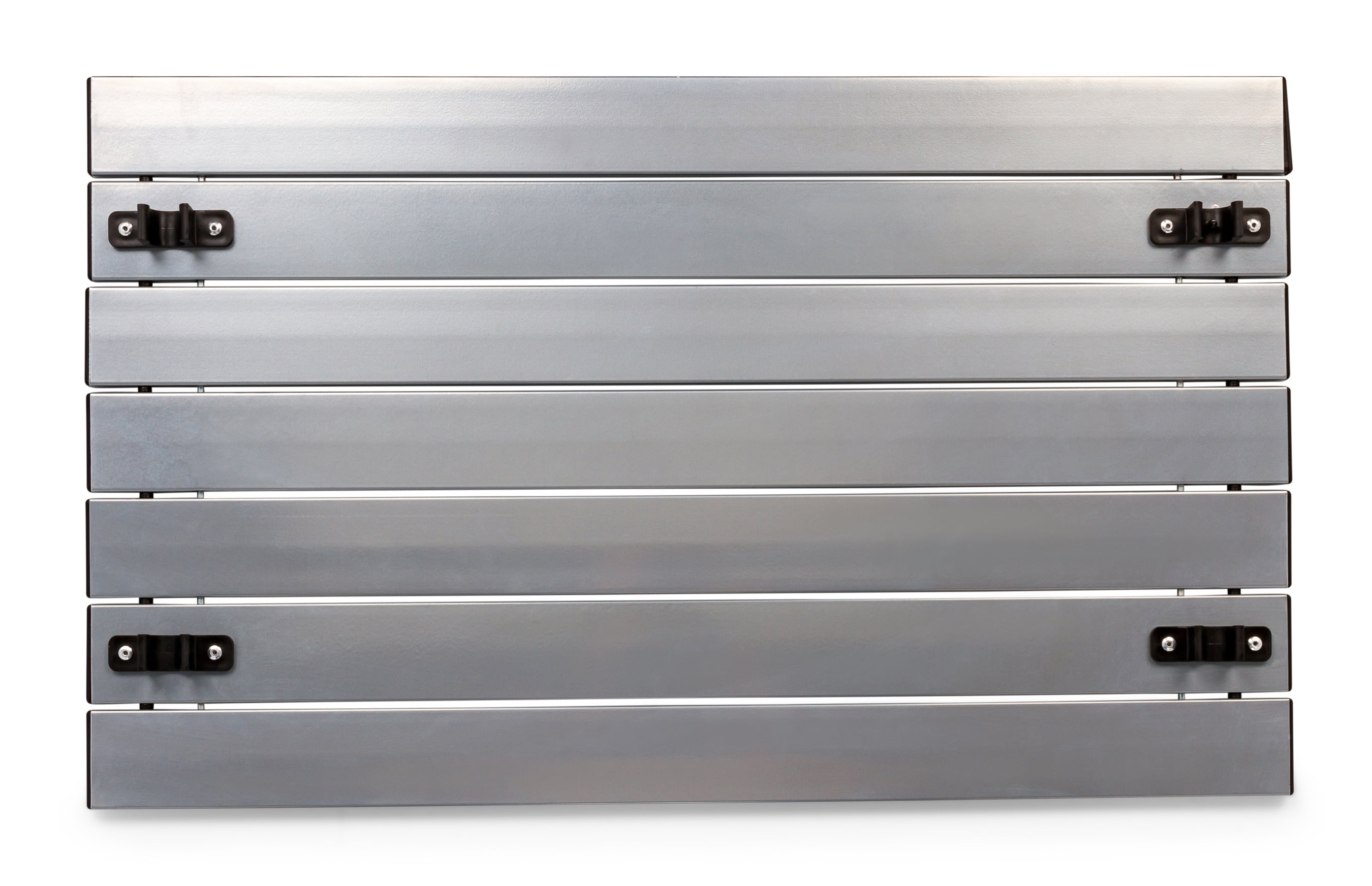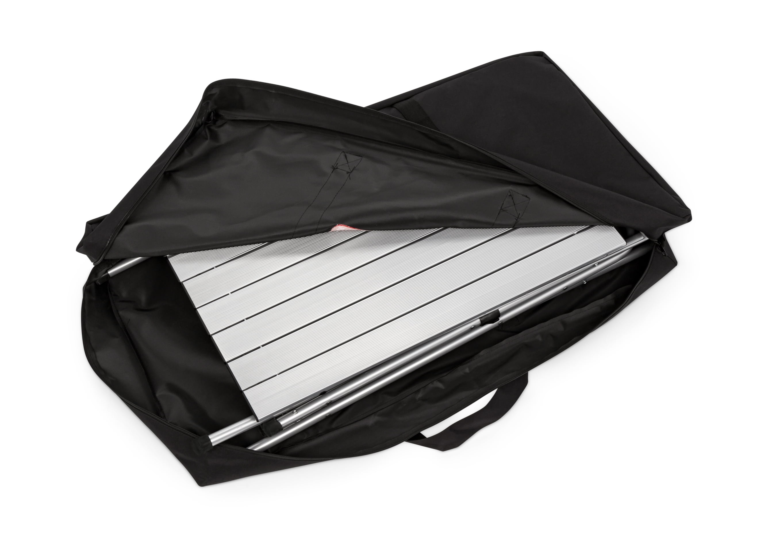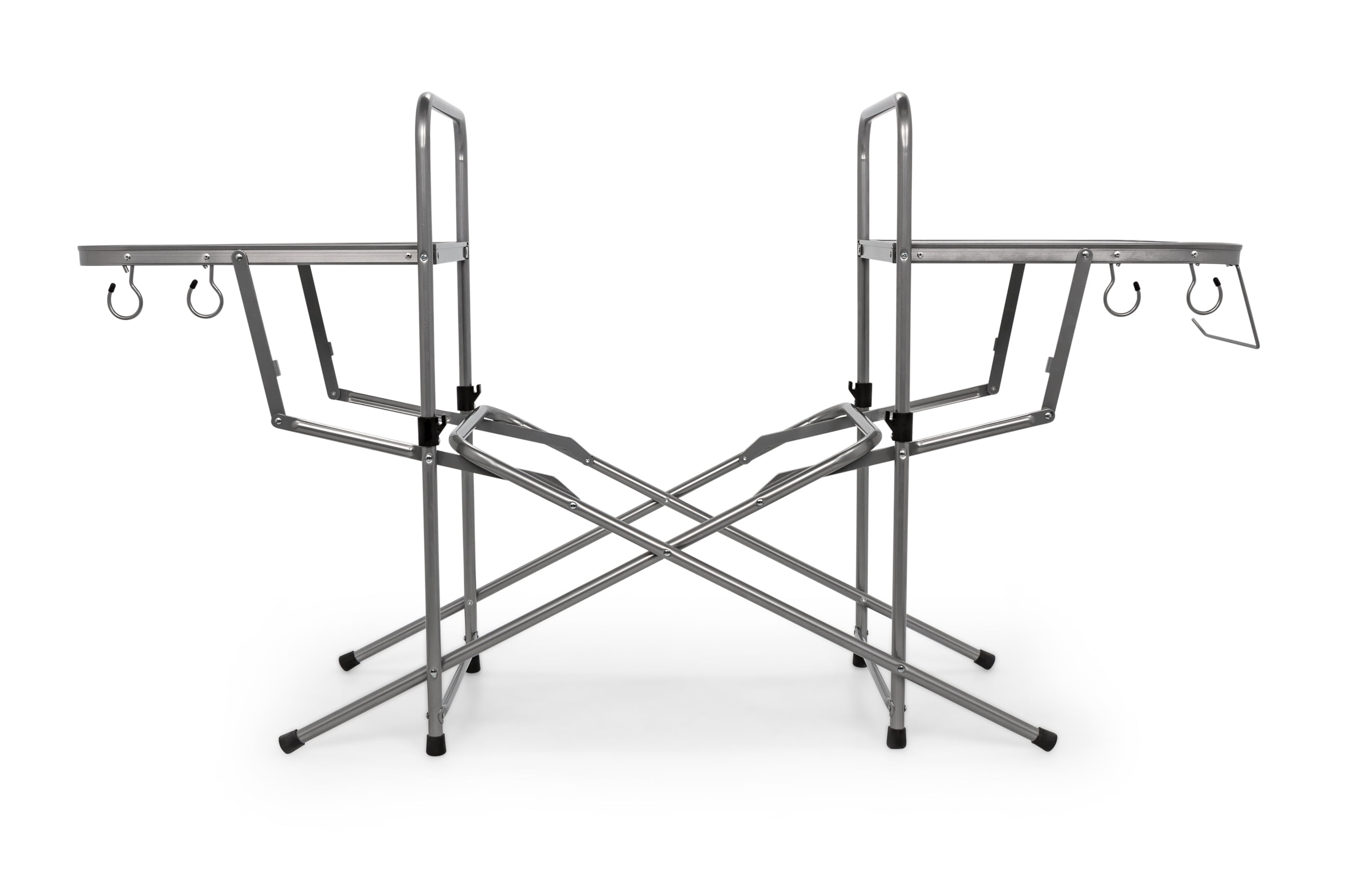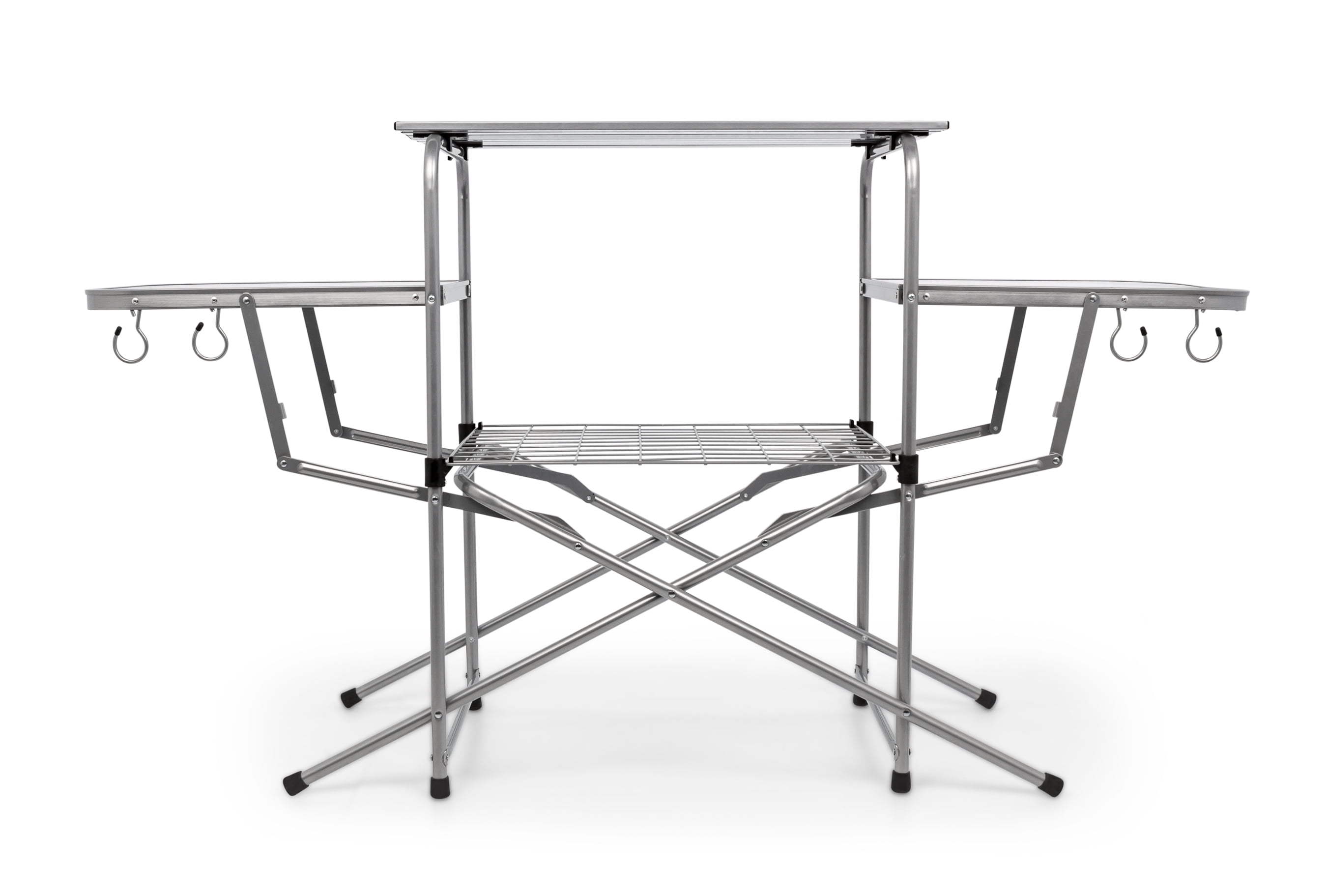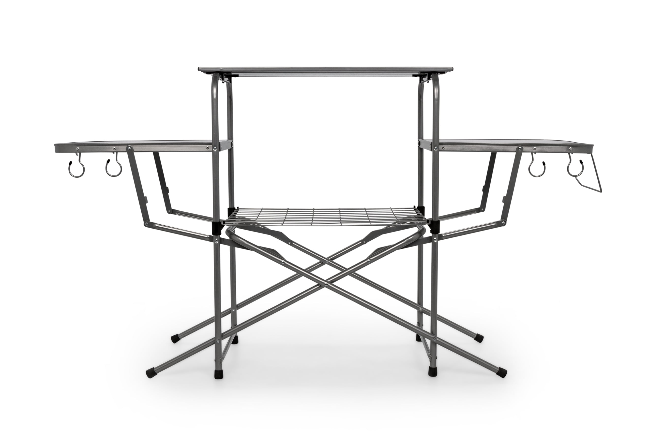 Spacious grill table has a lightweight, high strength steel frame and an aluminum table top. Table is quick and easy to set-up. Great for picnics, camping, sporting events and backyards. Includes durable carrying case. 57.75″w x 19″ d x 32″ h.